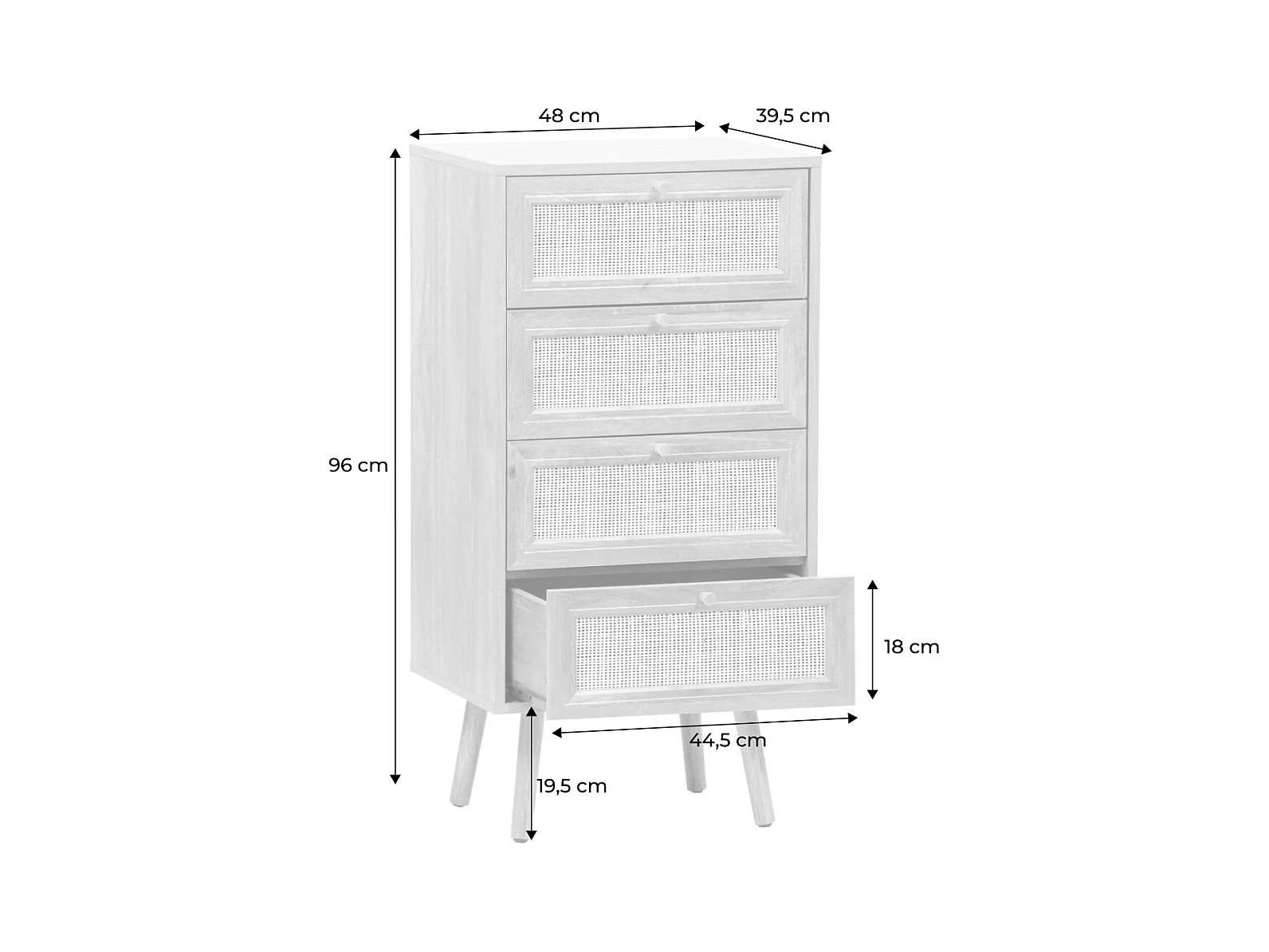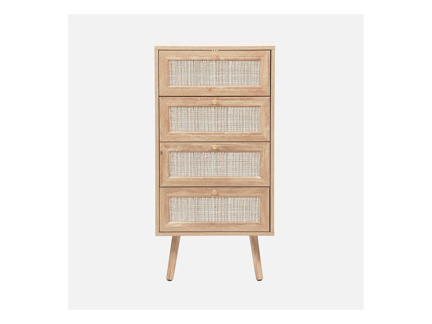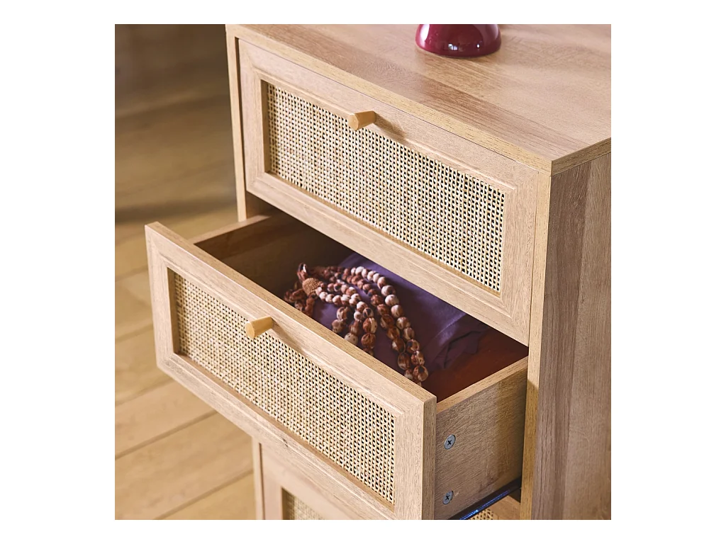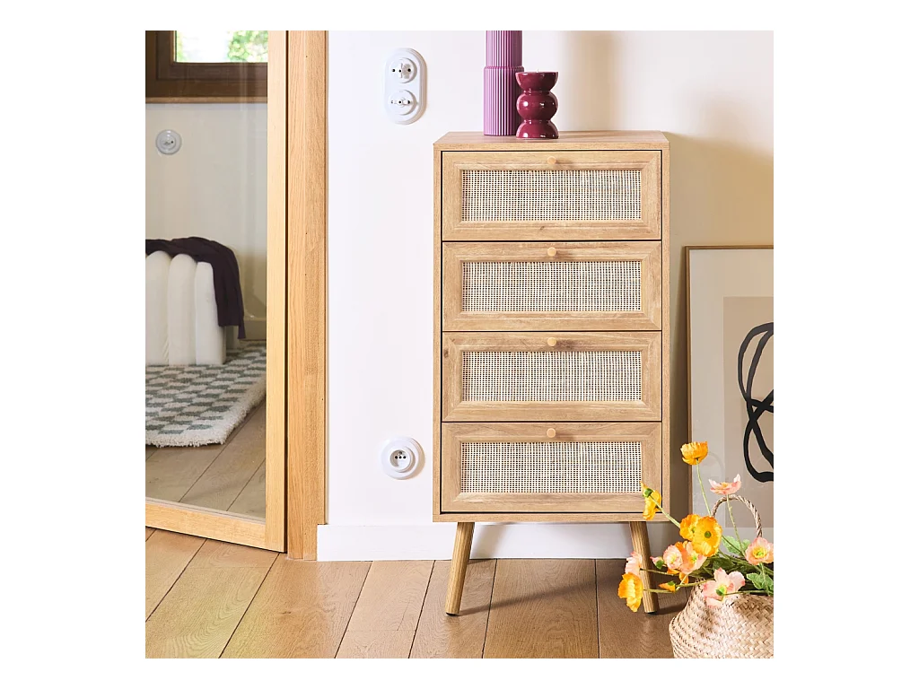 Cómoda de 4 cajones efecto madera y caña natural