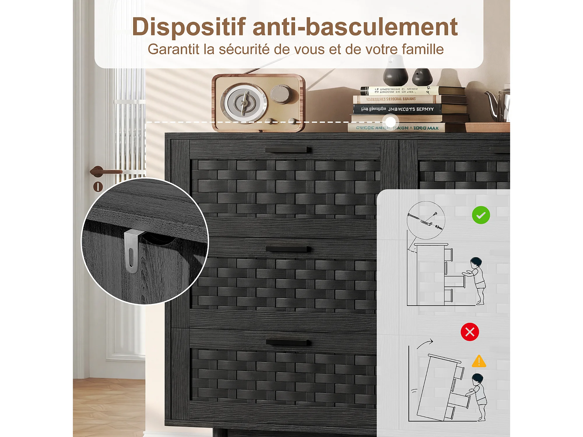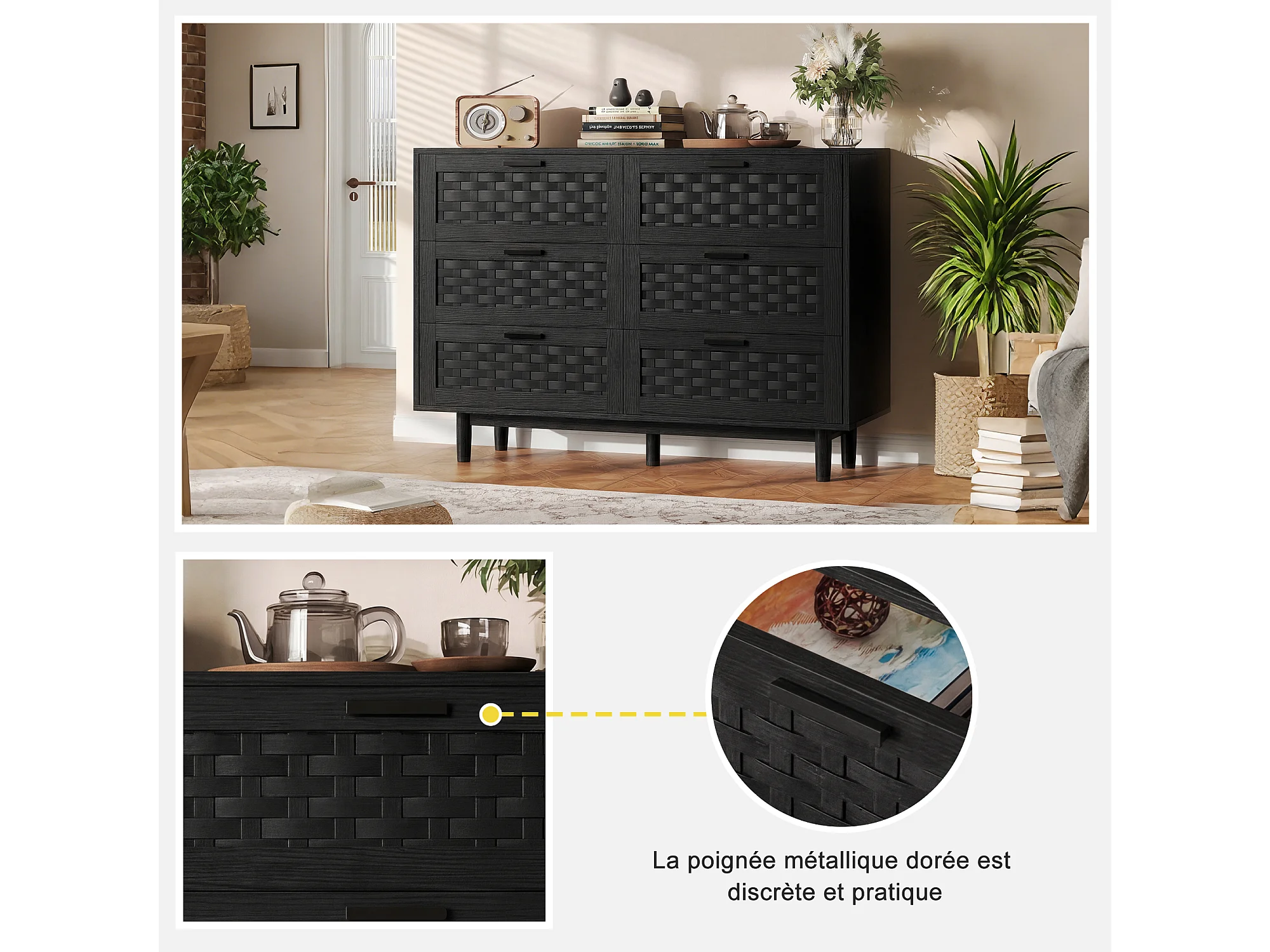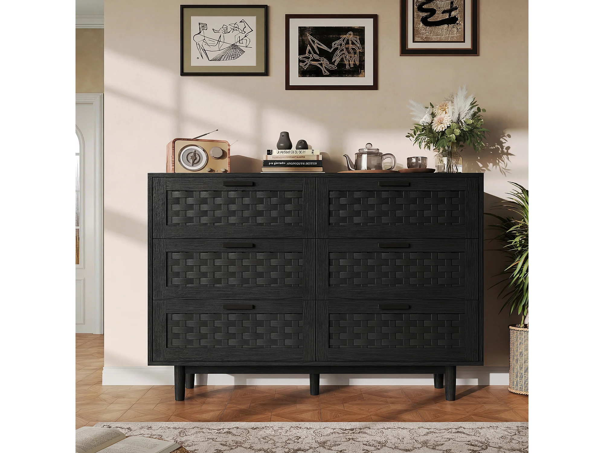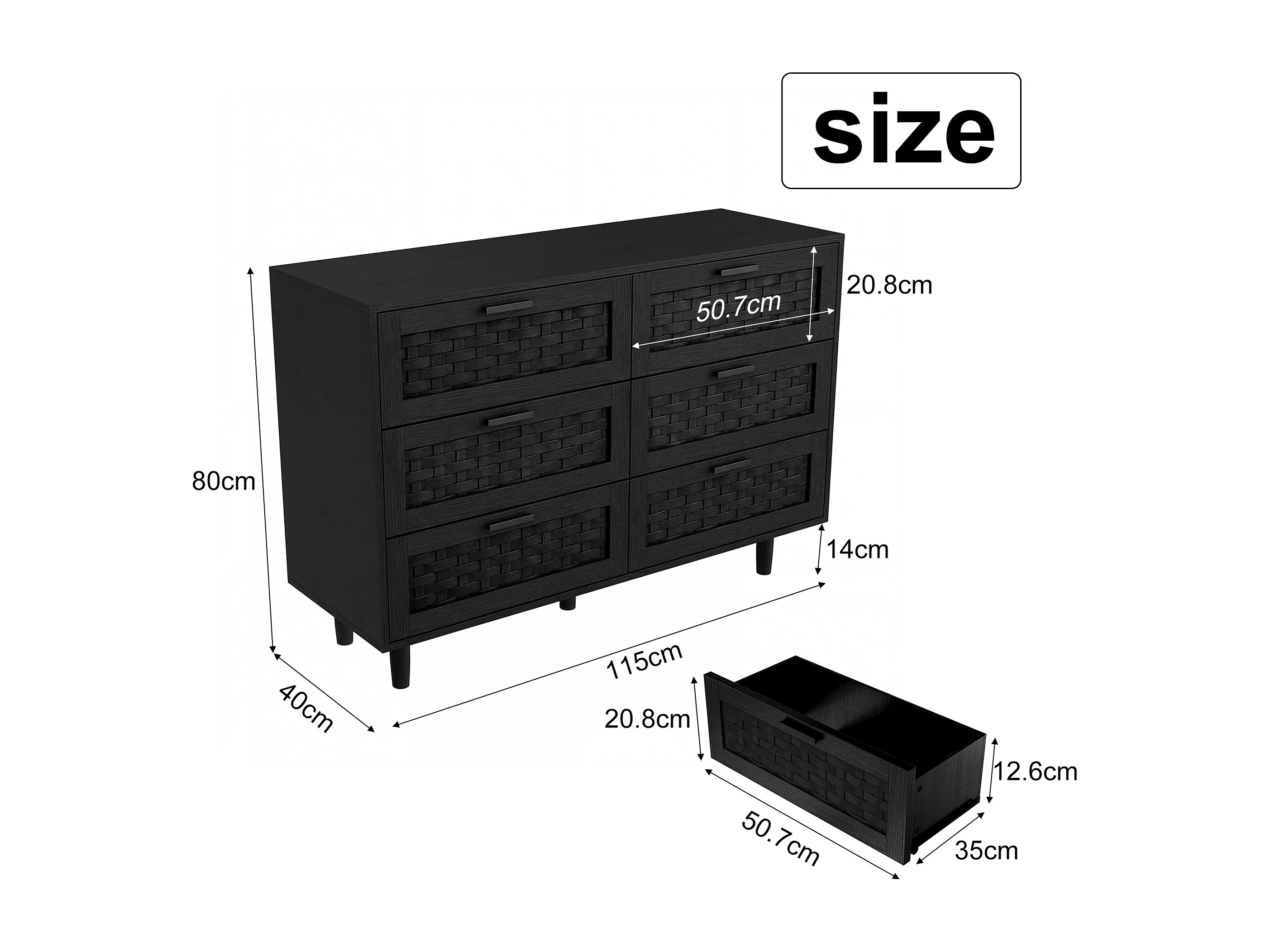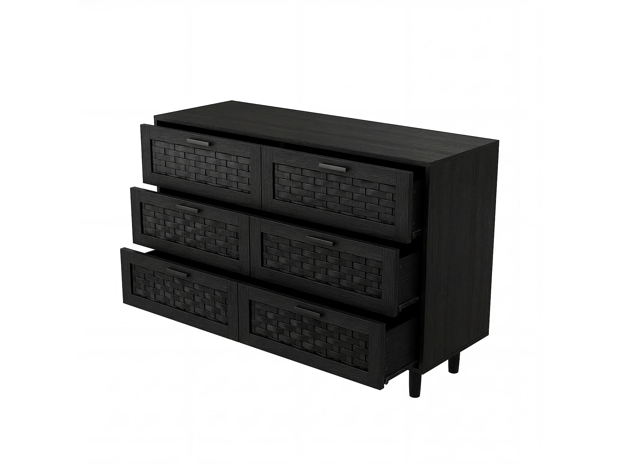 Cómoda de 6 cajones - Aparador de madera - 115 x 40 x 80 cm - Ideal para dormitorios y salones - Color negro