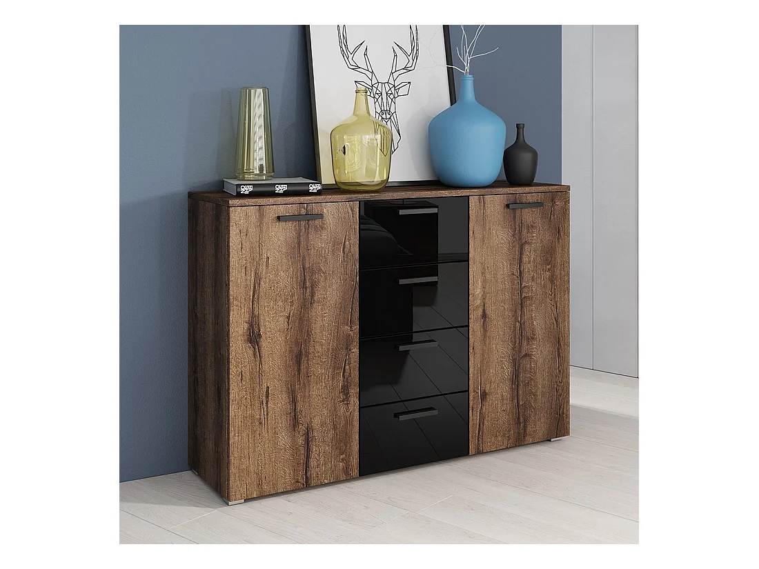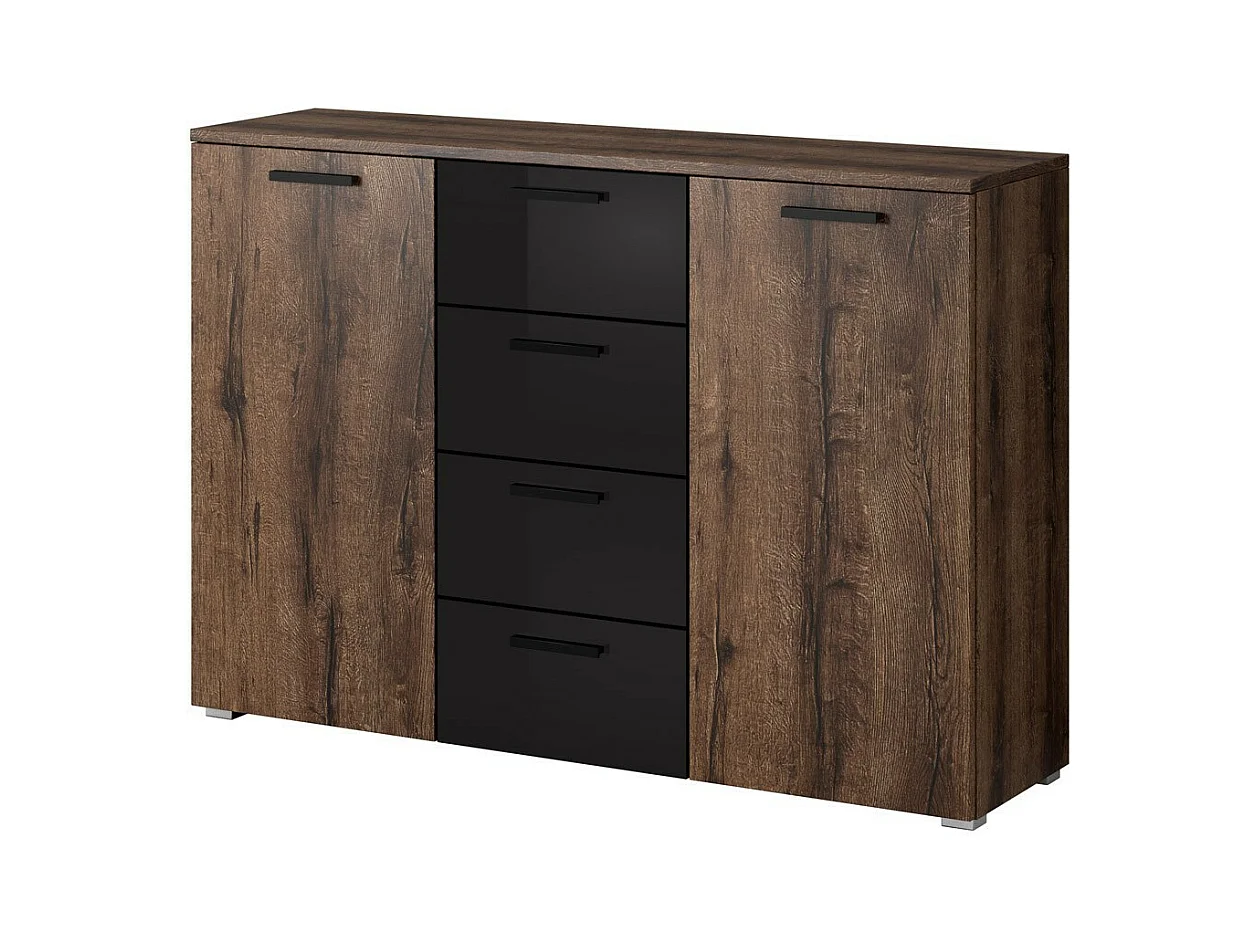 Cómoda de diseño con 2 puertas y 4 cajones de 130cm. Colección FLOYD en color roble oscuro y negro brillante.