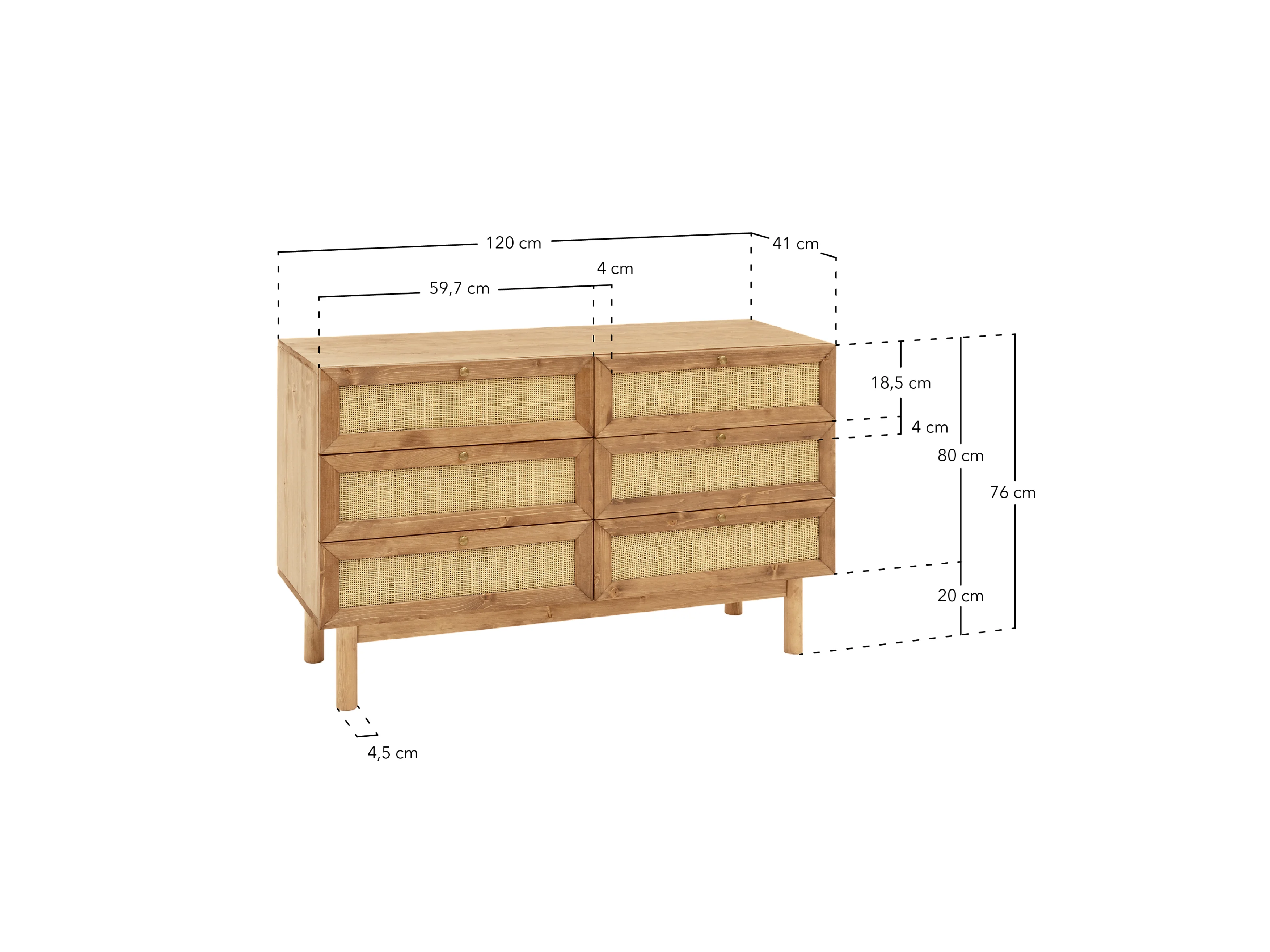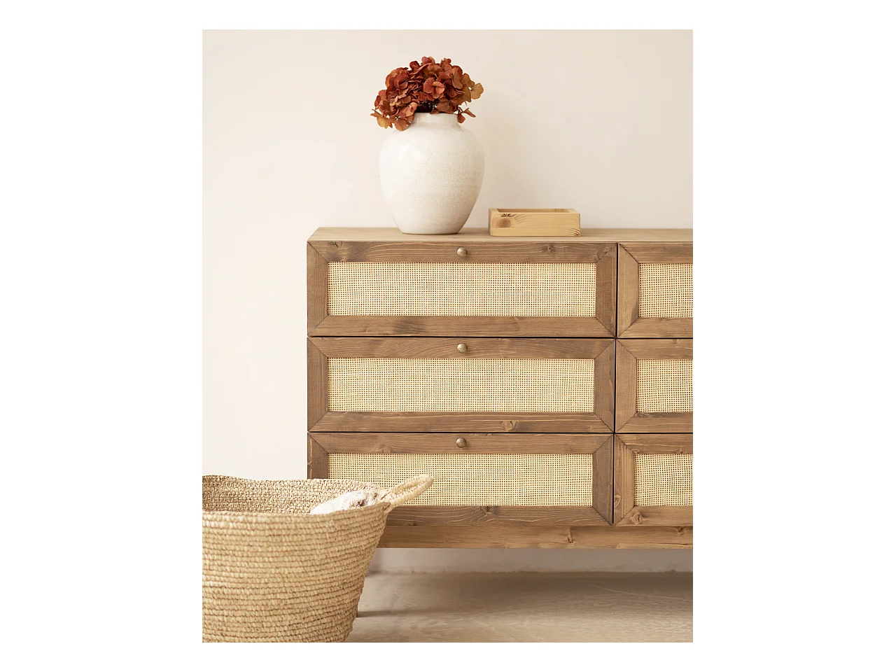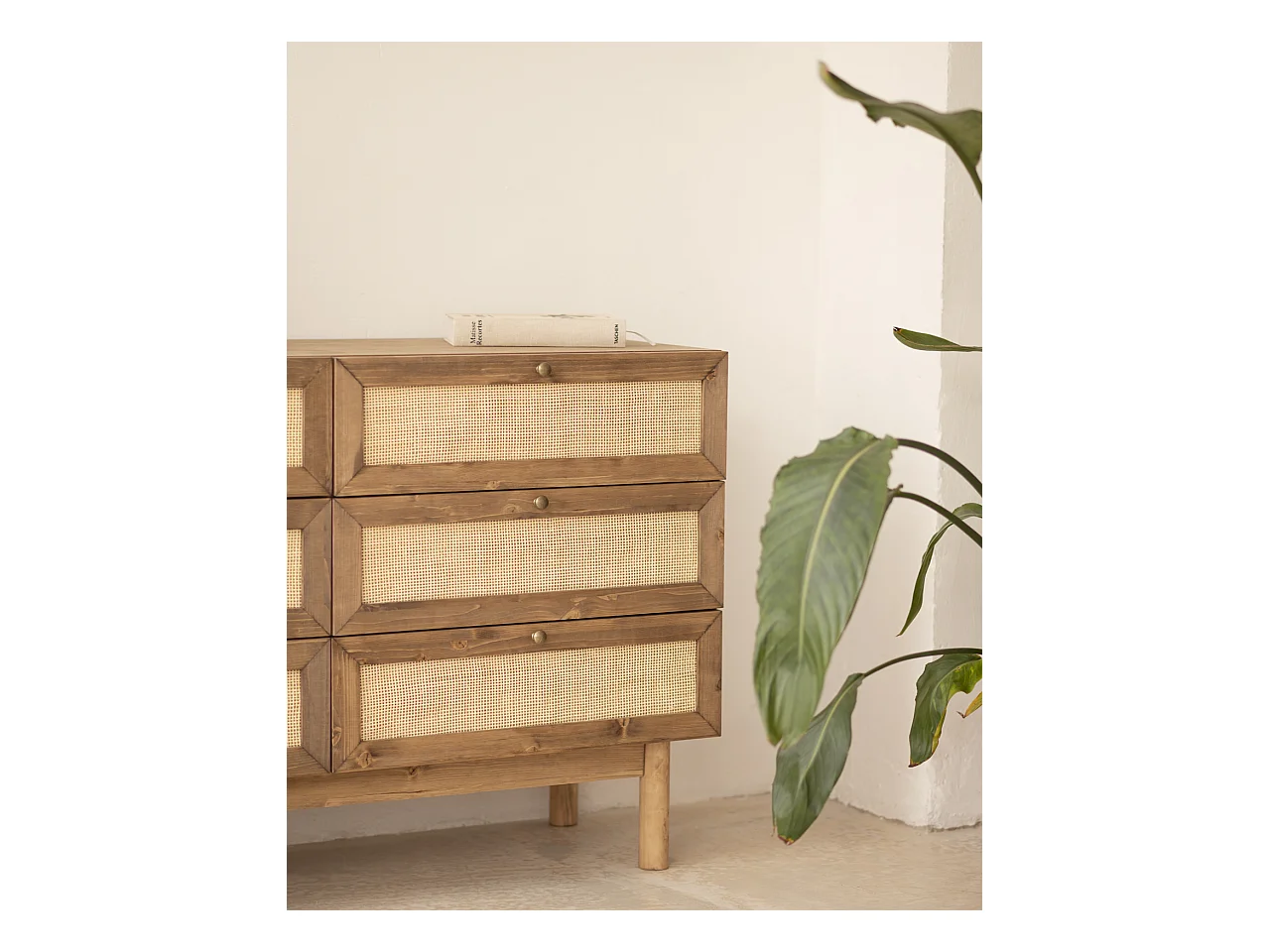 Cómoda de madera maciza y rafia con seis cajones en tono roble oscuro de 76x120cm - FRIDA - DECOWOOD