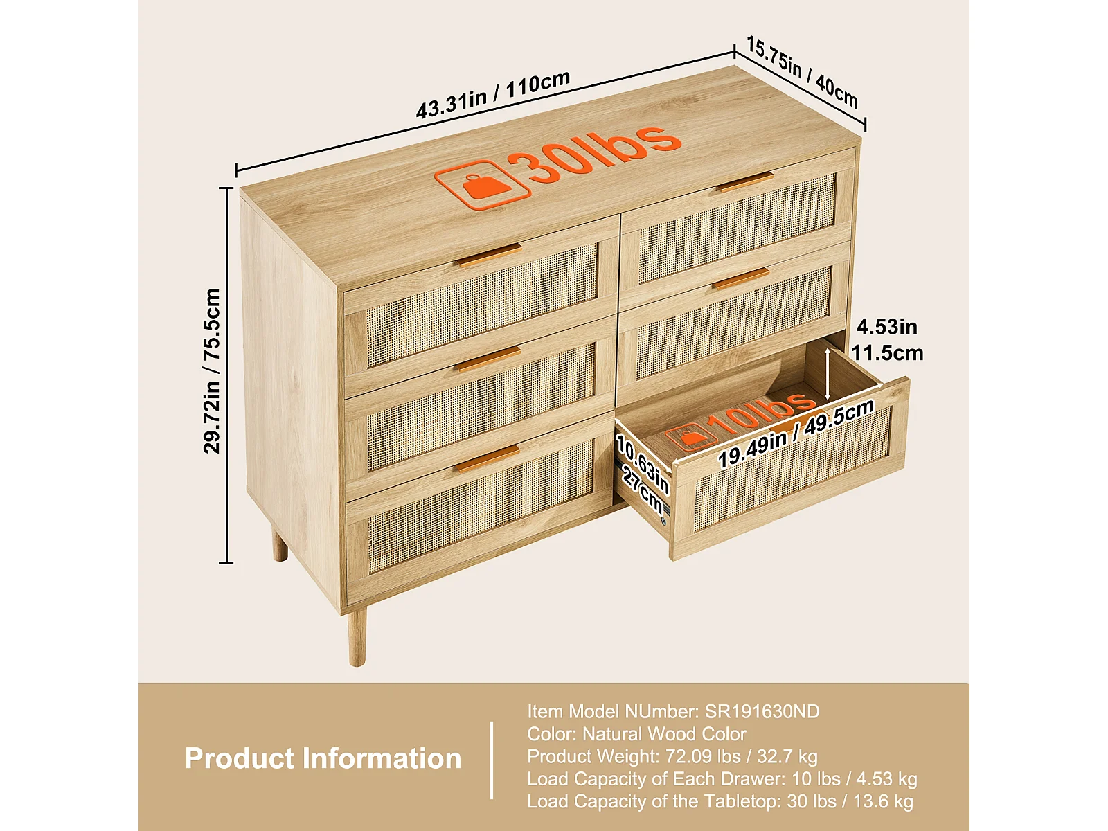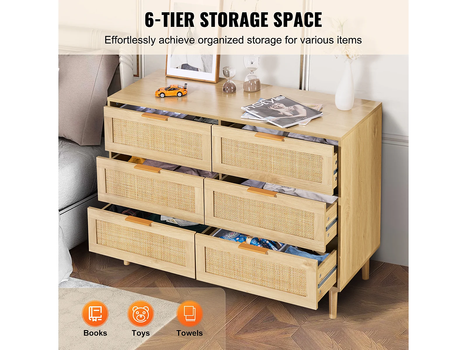 Cómoda de Ratán SucceBuy con 6 Cajones - Natural y Versátil - Almacenamiento Elegante con Estilo Boho y Natural para su Decoración