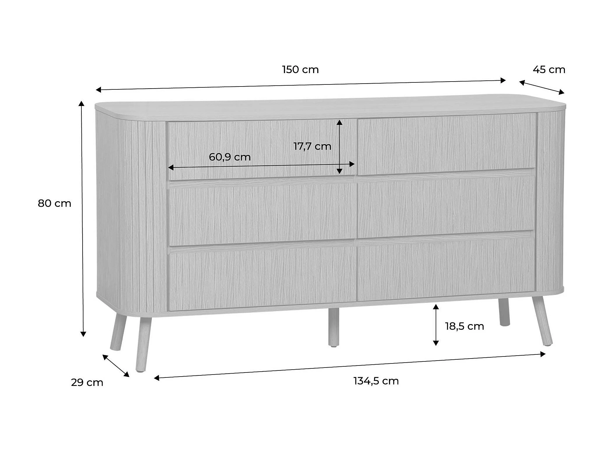 Cómoda decoración estriada, 6 cajones natural
