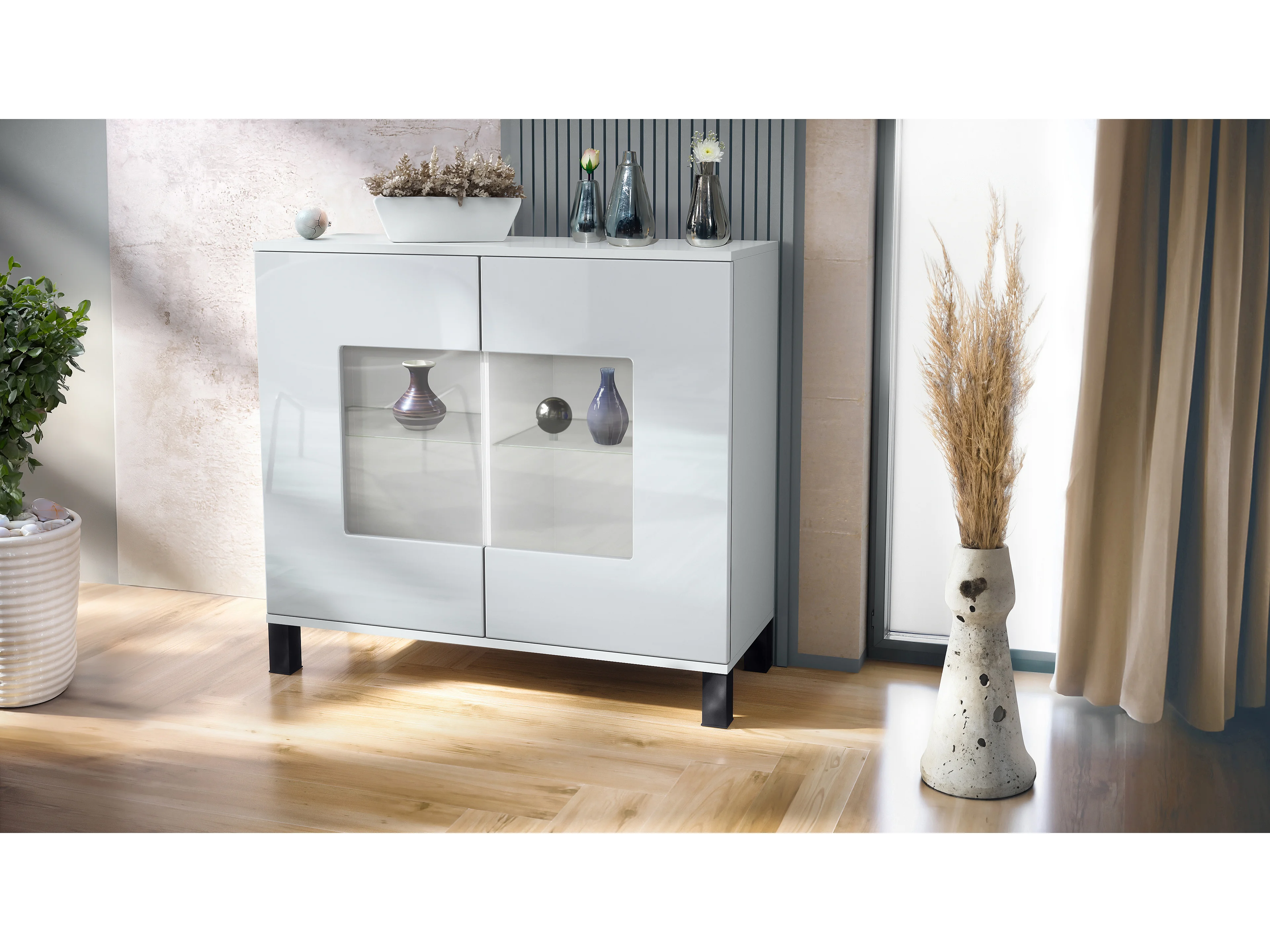 Cómoda Grömitz V3, Moderno armario de cocina con 2 grandes puertas de cristal blanco mate / blanco de alto brillo (92,5 x 84.5 x 35)