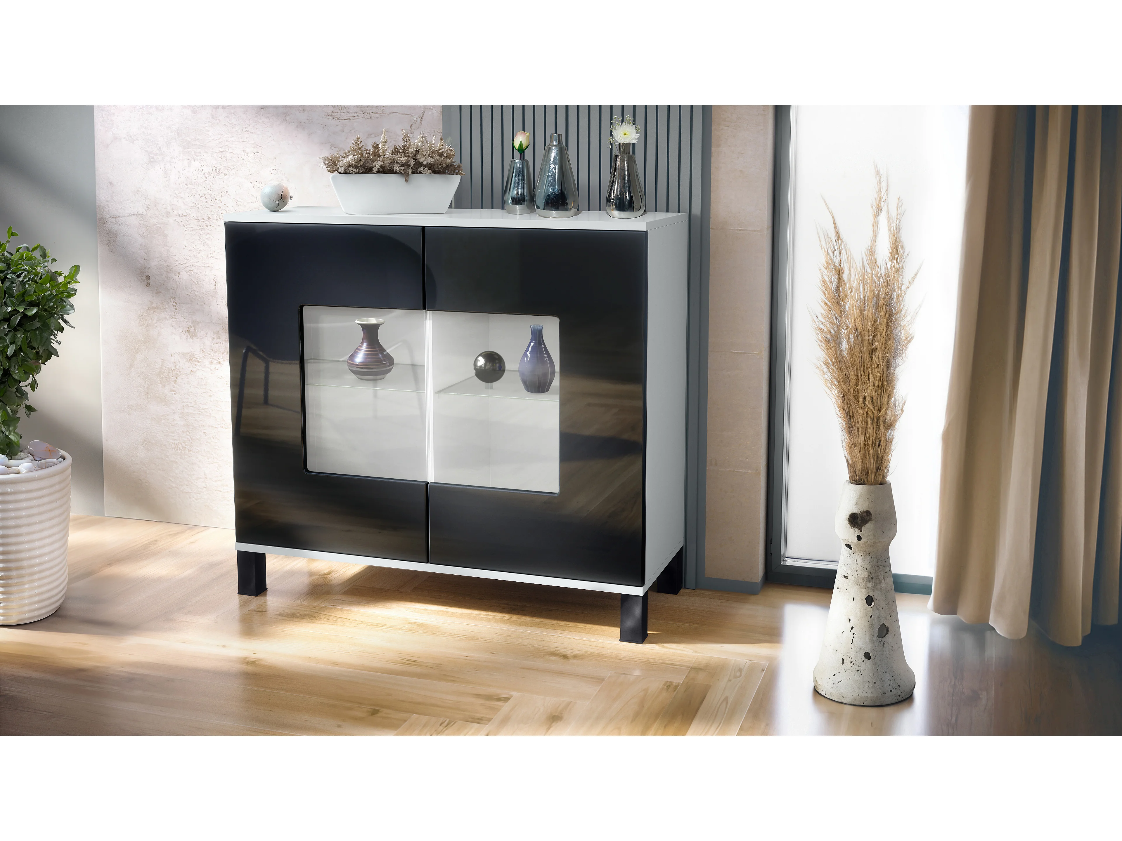 Cómoda Grömitz V3, Moderno armario de cocina con 2 grandes puertas de cristal blanco mate / negro de alto brillo (92,5 x 84.5 x 35)
