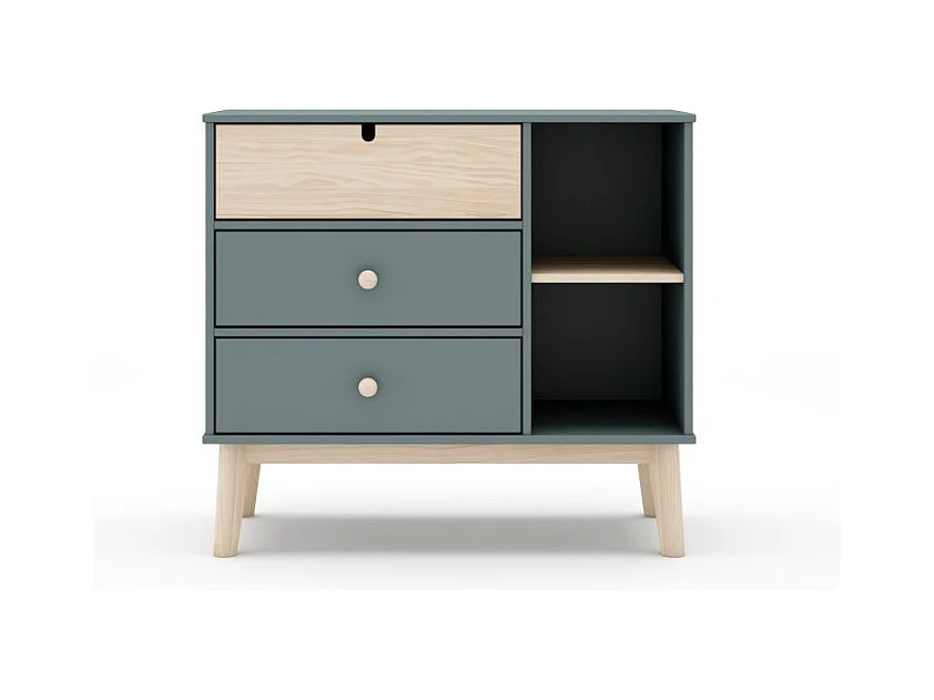 Cómoda infantil efecto madera con patas de pino, 3 cajones verde