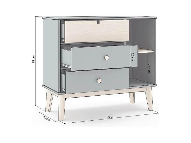 Cómoda 3 cajones 2 huecos Dylan acabado verde kaki/cera blanco, 81cm(alto) 90cm(ancho) 40