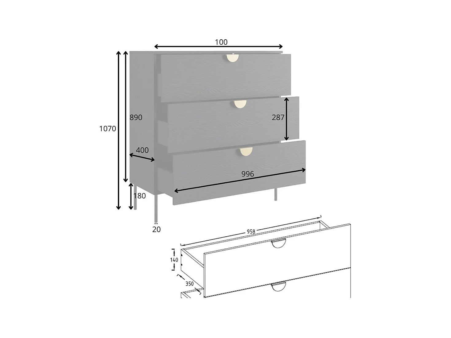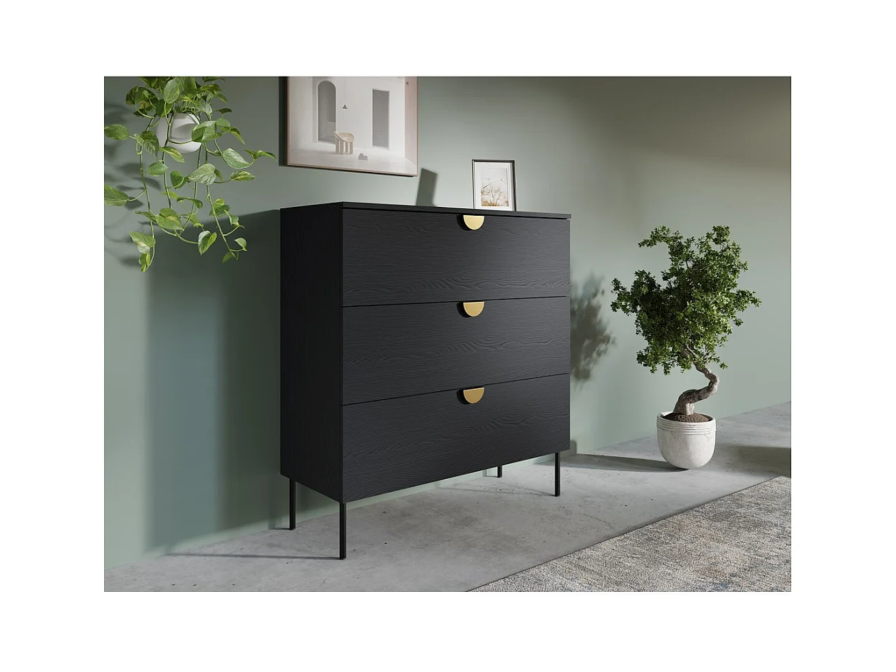 Cómoda MONDO – Negro estructurado y dorado – 3 cajones – Patas de metal – Diseño moderno y funcional