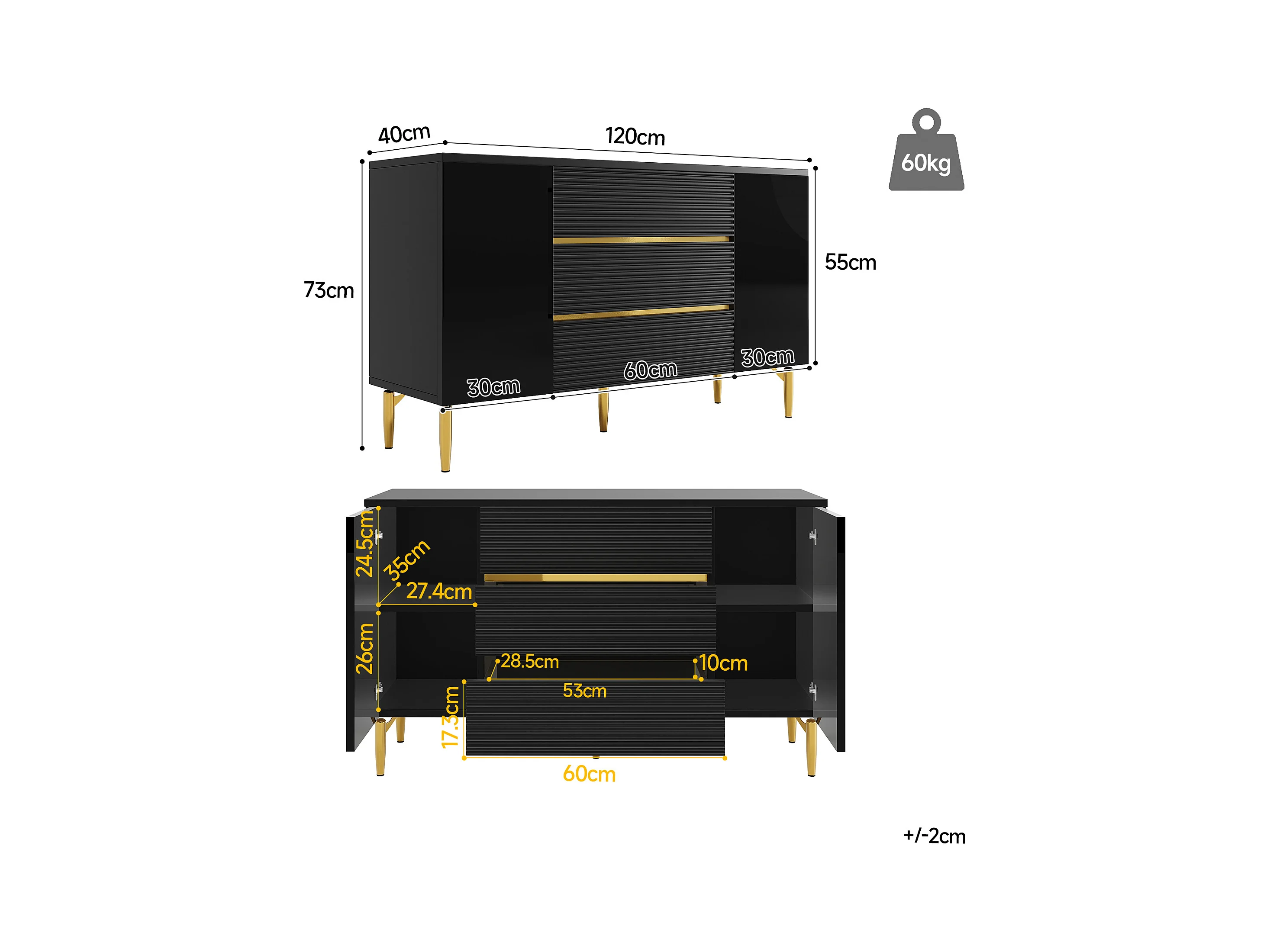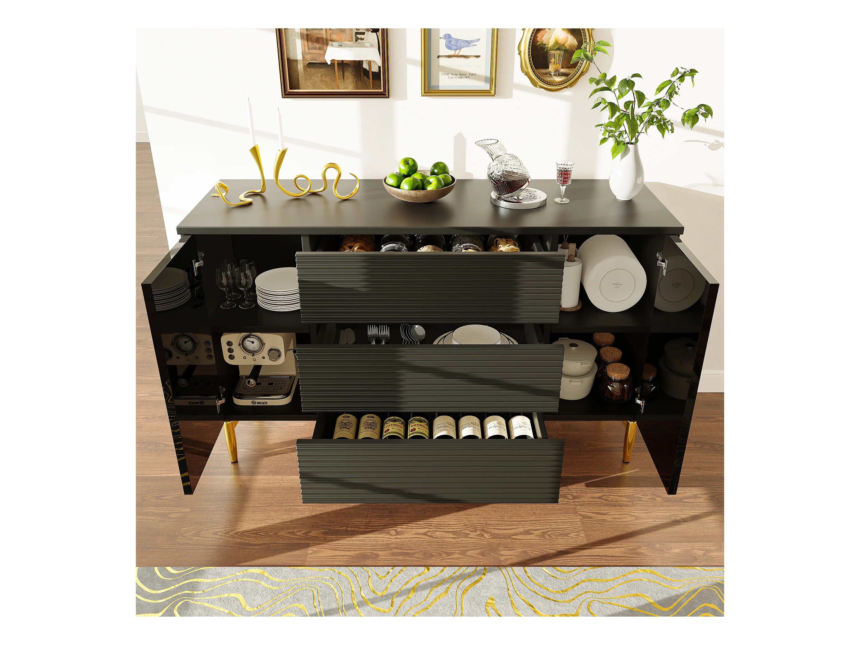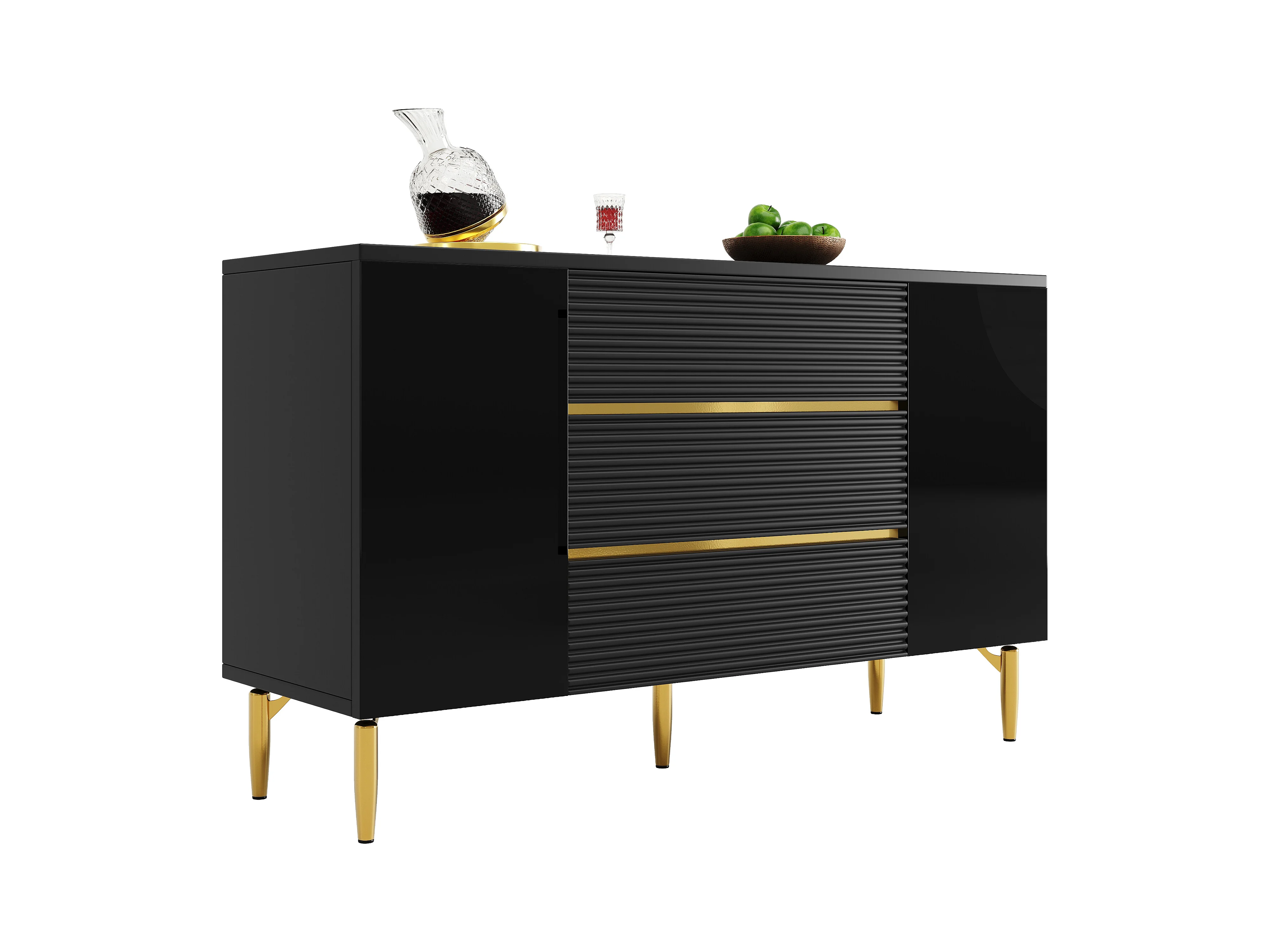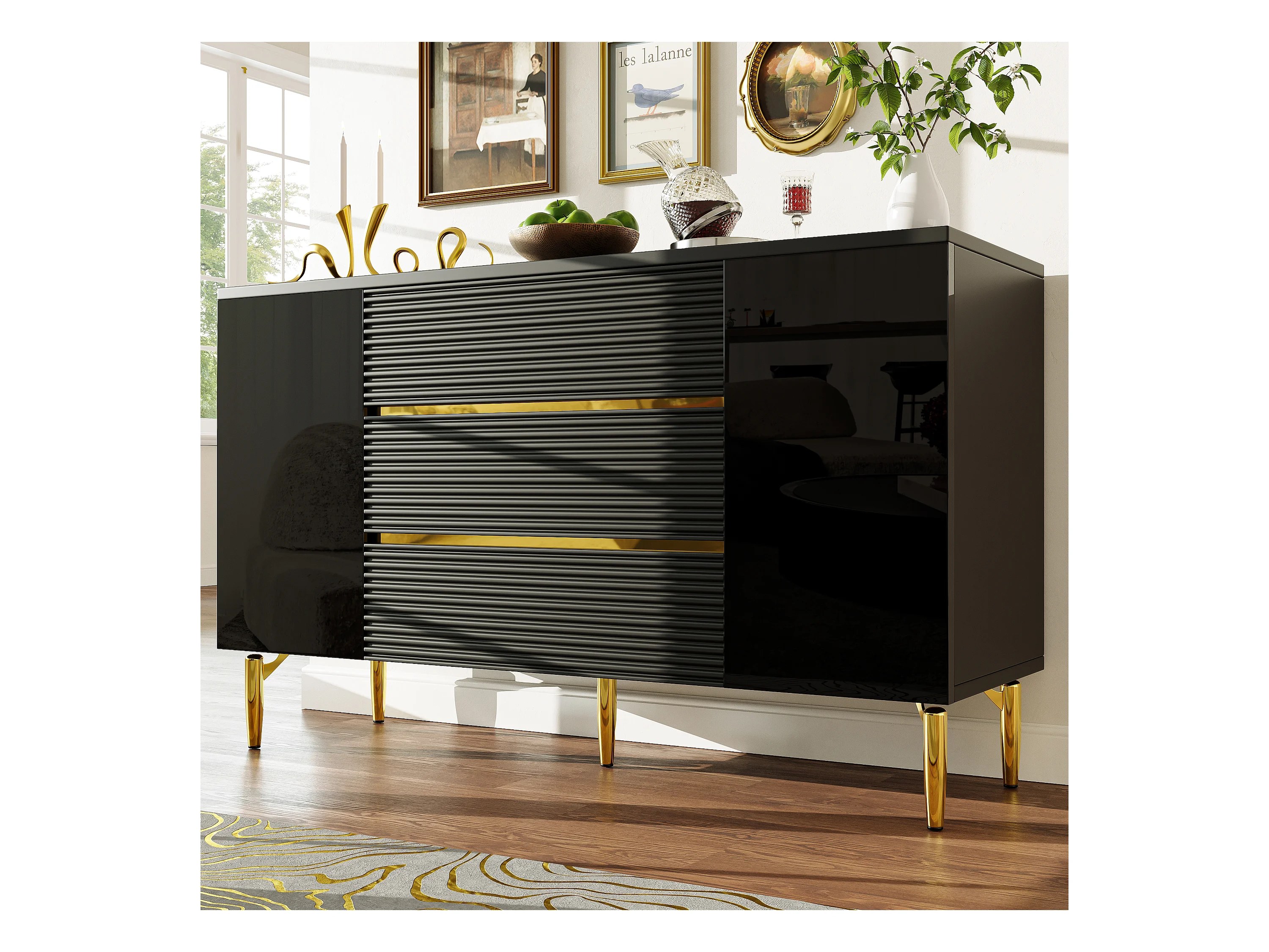 Cómoda negra de elegante diseño, MDF, con 3 niveles de cajones y decoración dorada (120x40x73 cm)