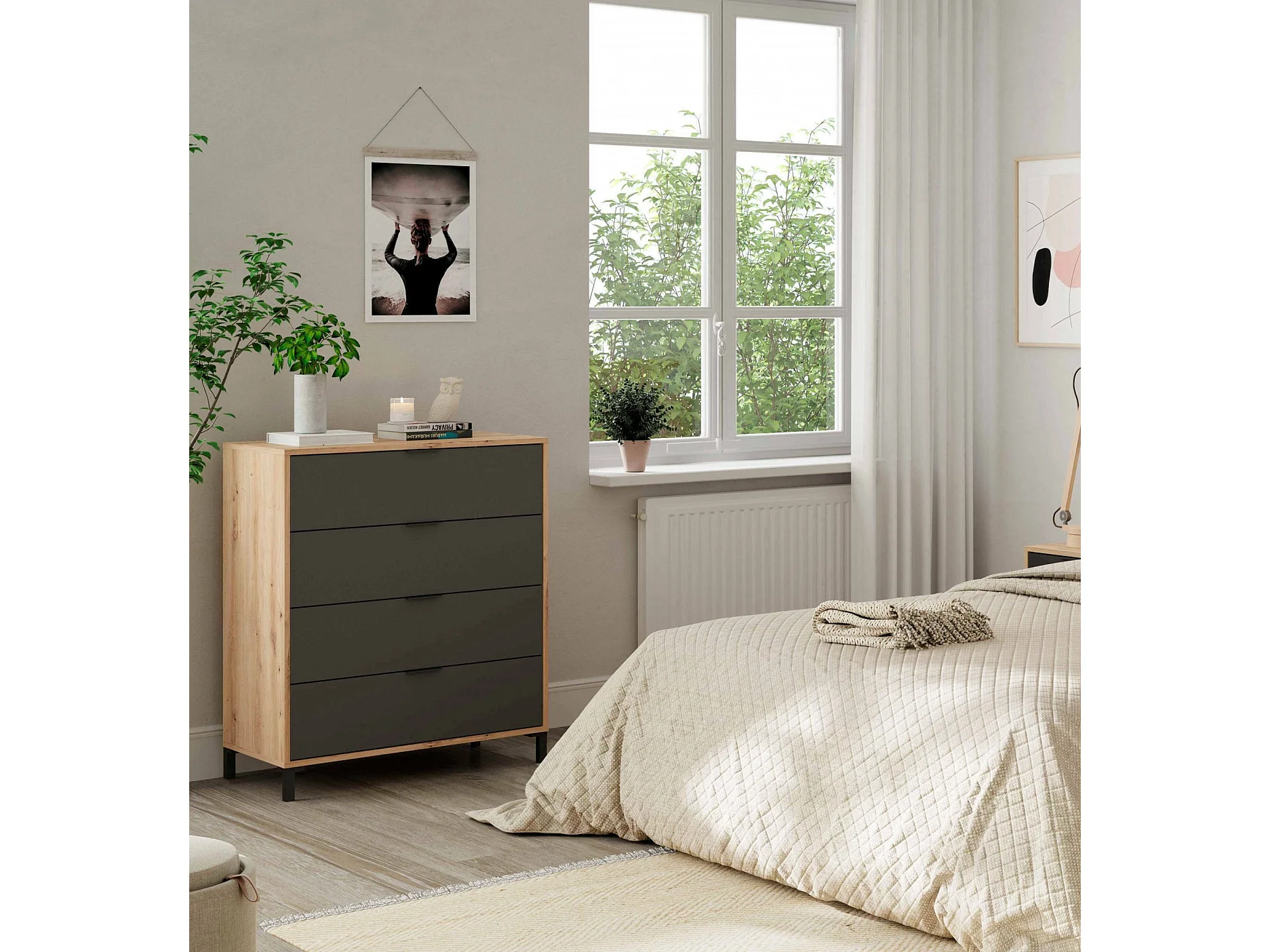 Cómoda Rochester, Cómoda con 4 cajones, Cómoda para el dormitorio, Cómoda moderna, 76x40h94 cm, Roble anudado y Antracita