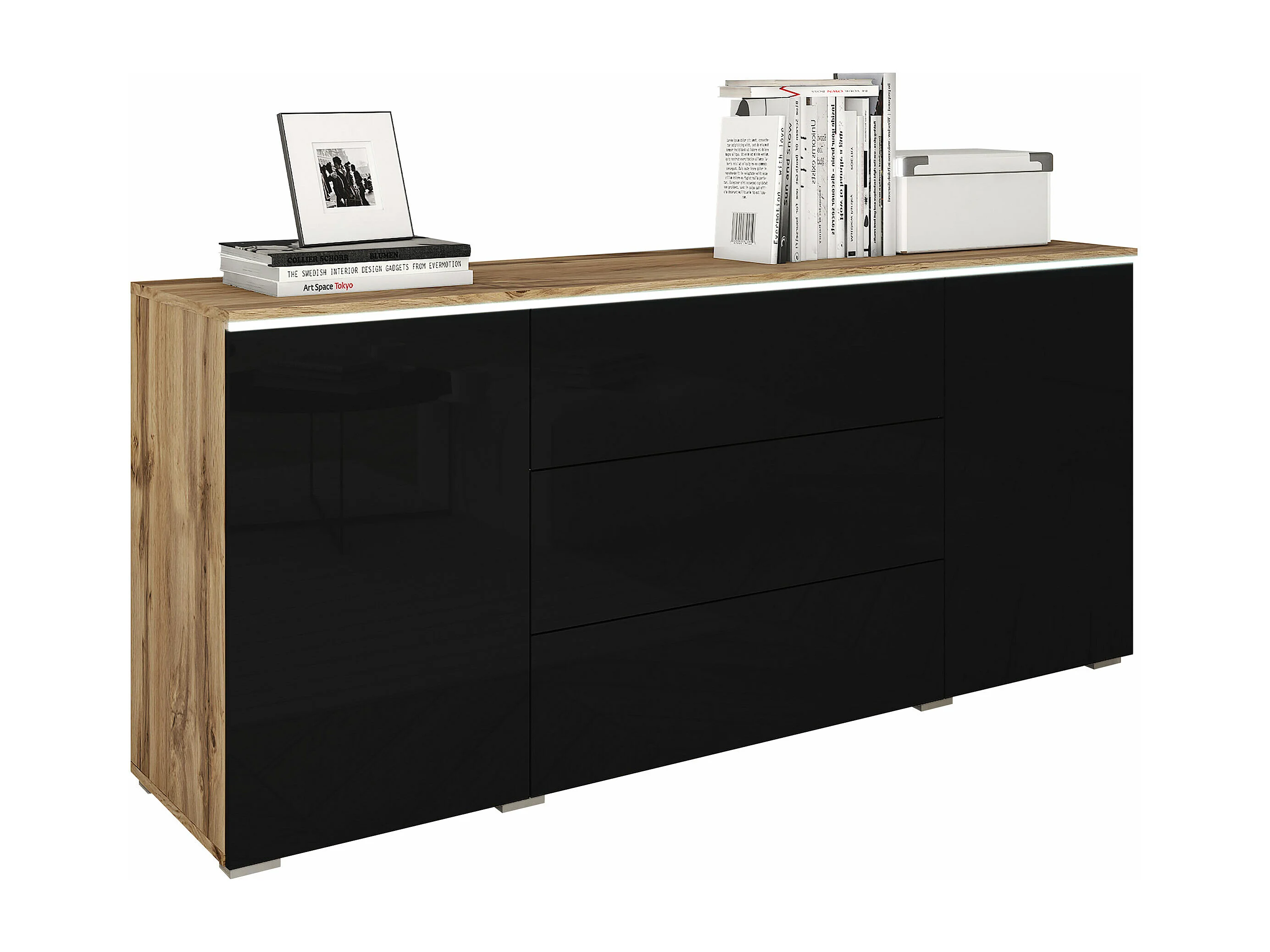Cómoda Sarasota 142, Negro brillante|Roble wotan, Con cajones y puertas, 66x150x40cm