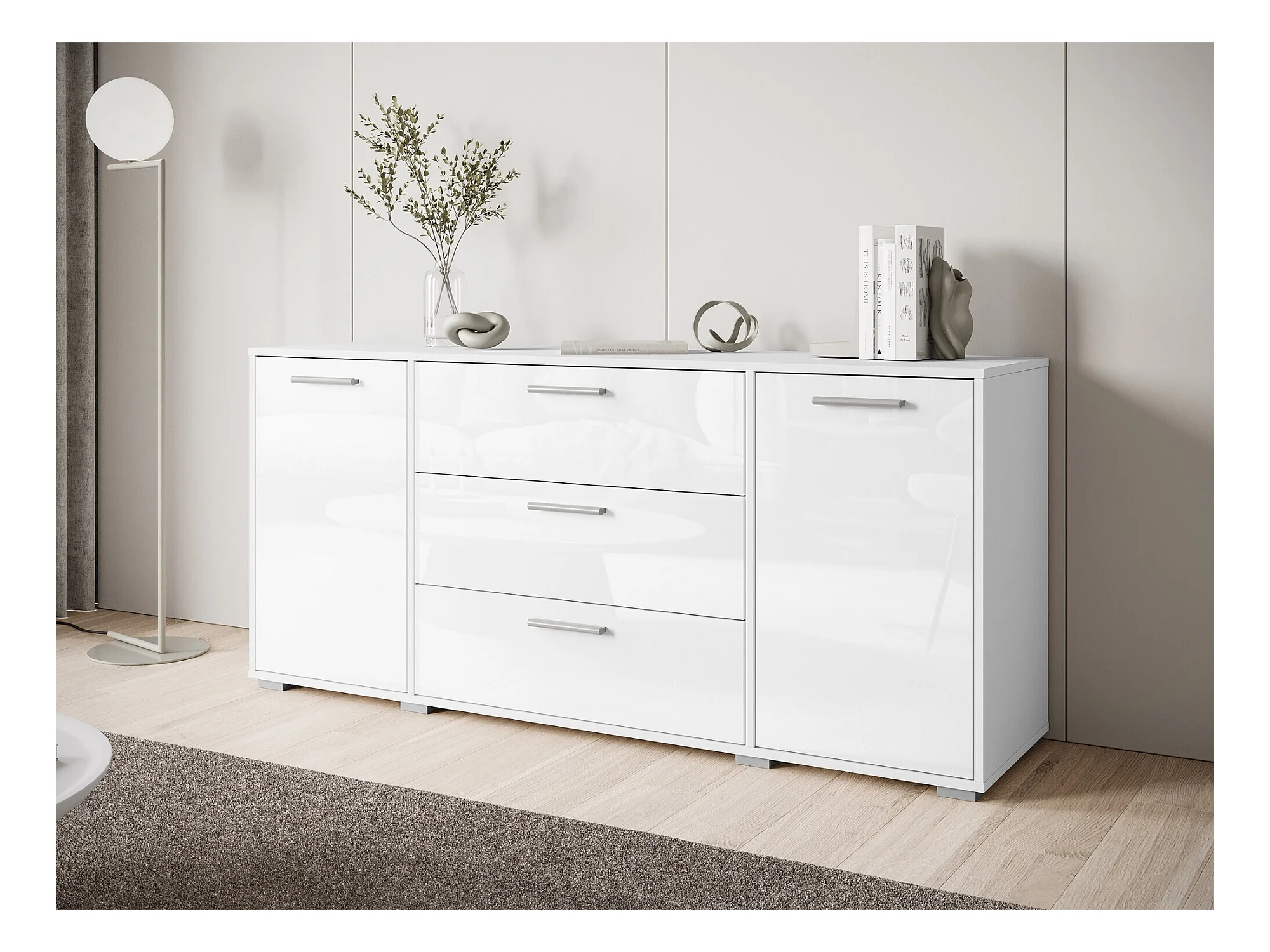 Cómoda Sarasota 174, Blanco|Blanco brillante, Con cajones y puertas, 68x150x40cm