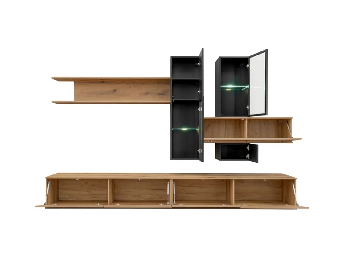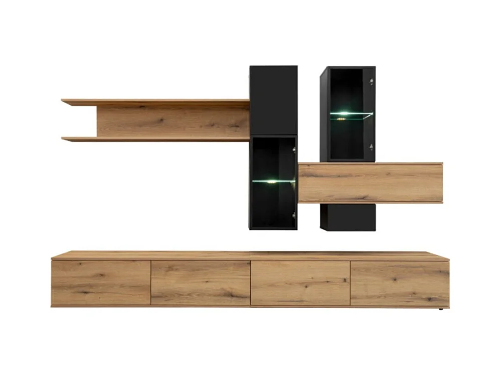 Conjunto de muebles de salón RAMOS – Roble y negro super mate – LED multicolores integrados