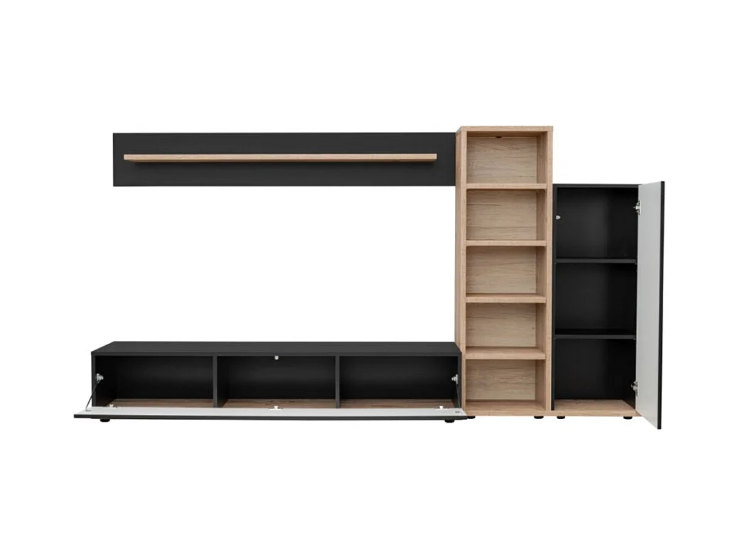 Conjunto de muebles de salón mural SWITCH VI diseño, color negro brillante y roble Wotan.