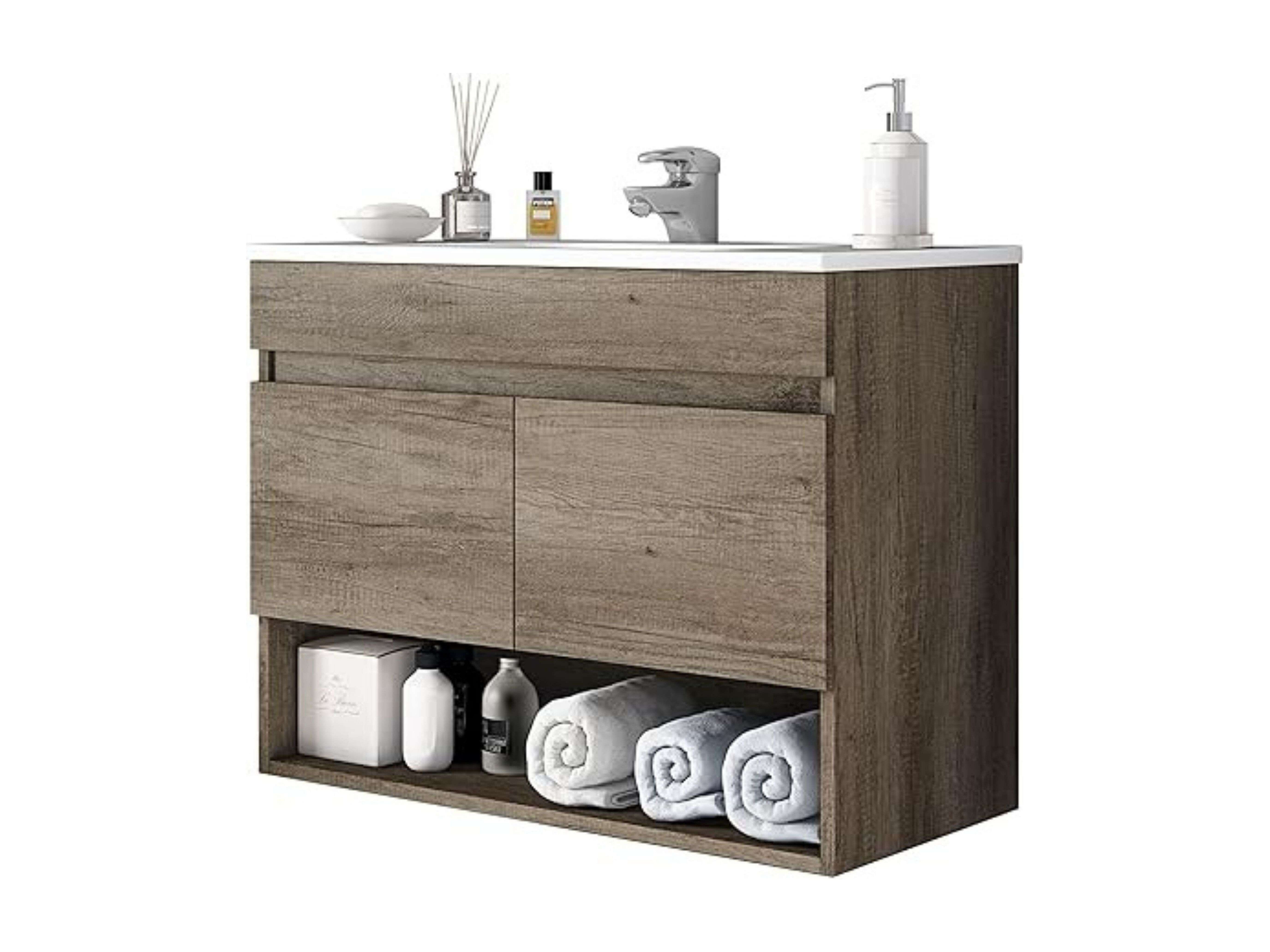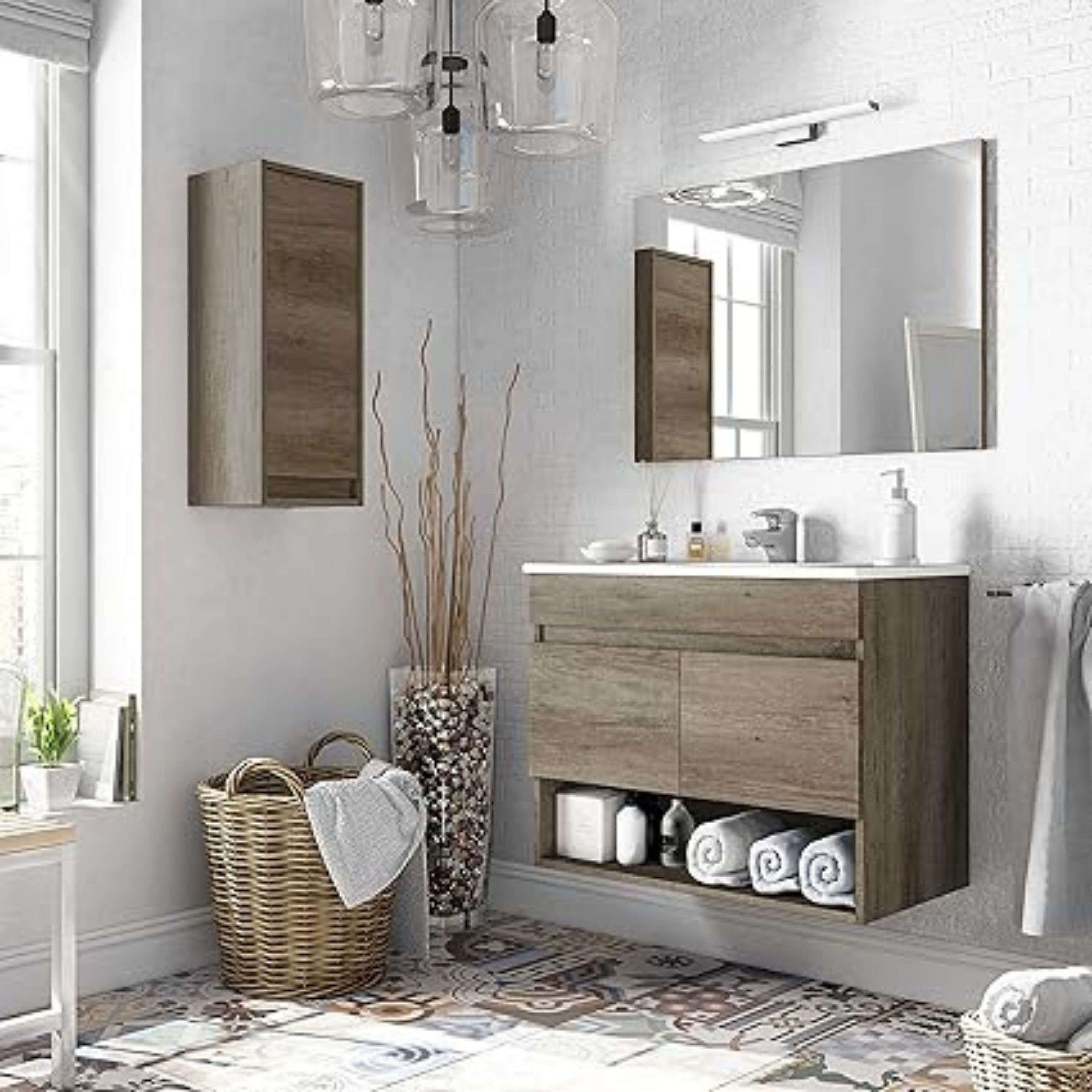 Baño: Mueble lavabo + columna + espejo + lavabo PMMA roble diseño moderno