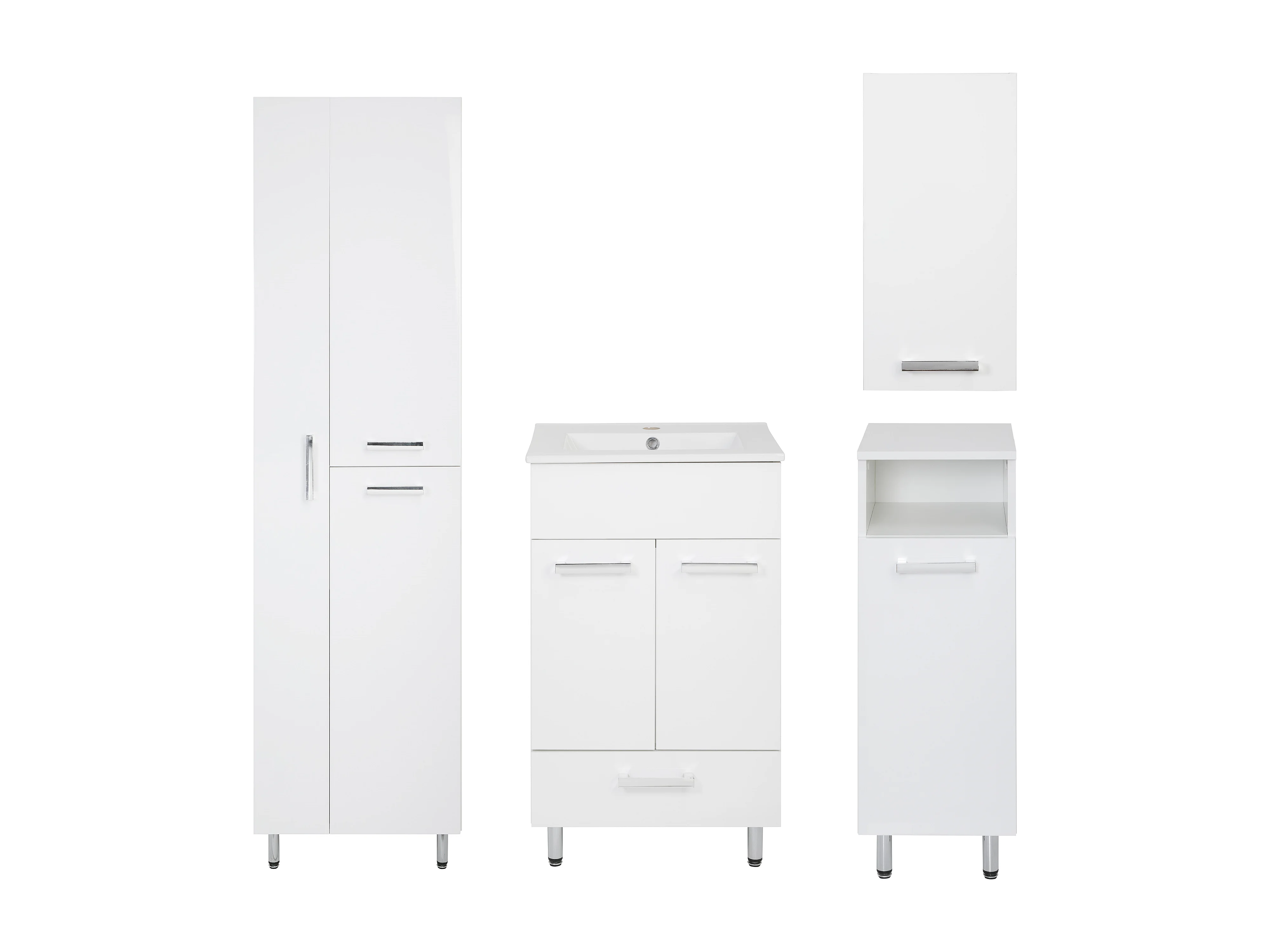 Conjunto blanco para baño de pie, 50 cm. Armario con lavabo. Columna con hueco para fregona, 55 cm. Media columna. Armario superior Lupo.