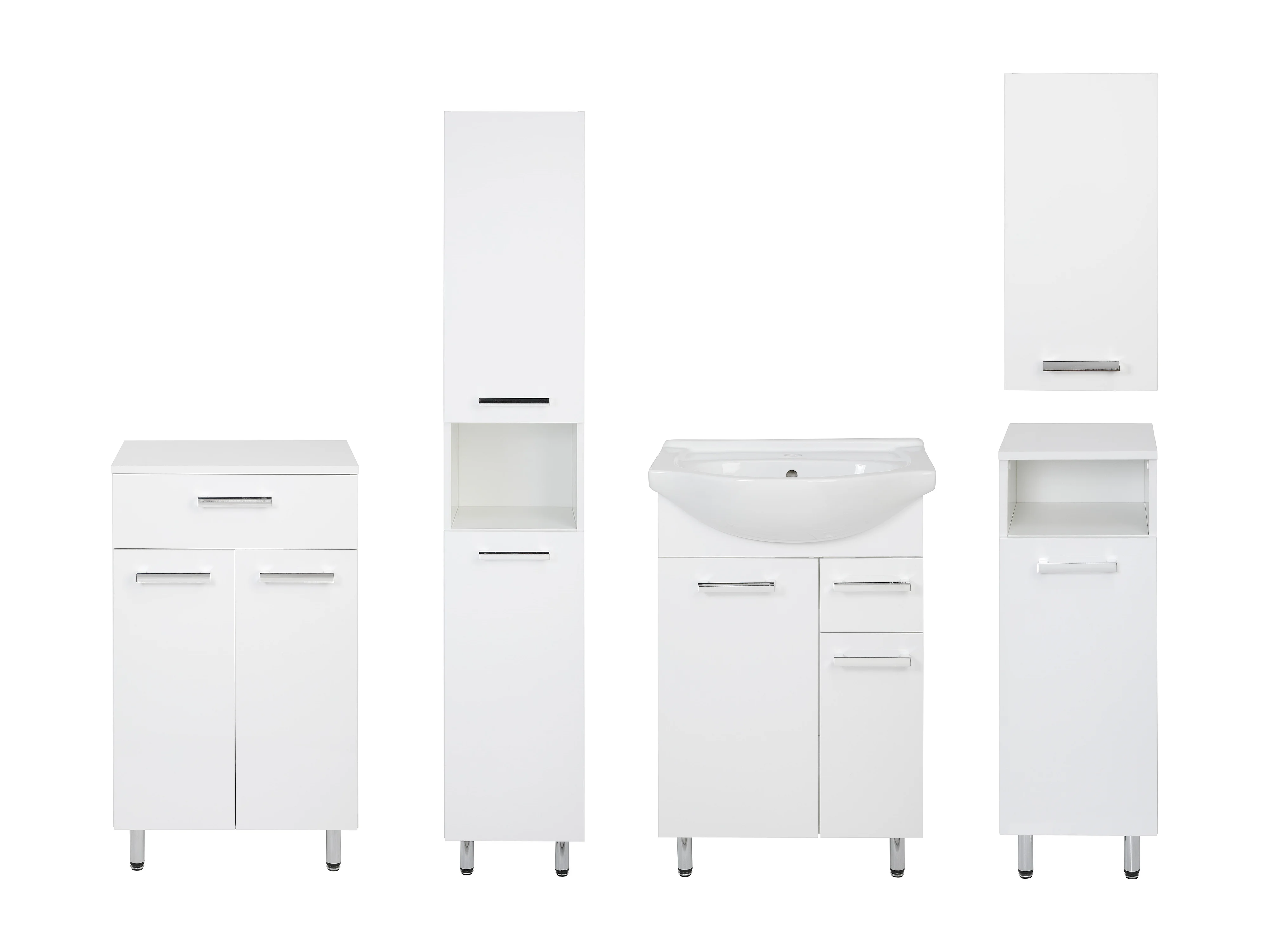 Conjunto blanco para baño de pie 55 cm Armario con lavabo Columna Semicolumna Cómoda Armario superior Lupo