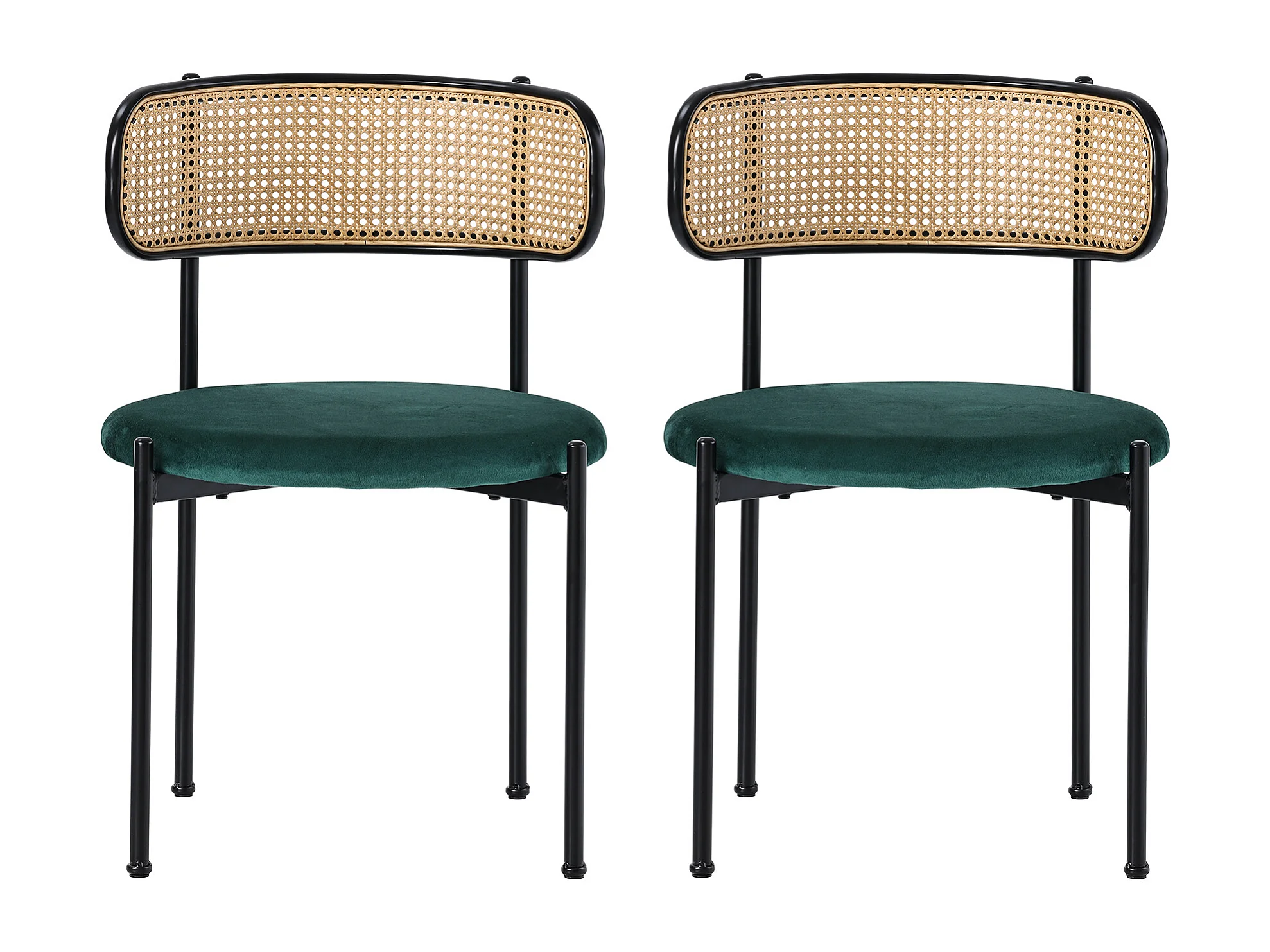 Conjunto de 2 sillas de terciopelo, respaldo de ratán y patas de metal negro - verde