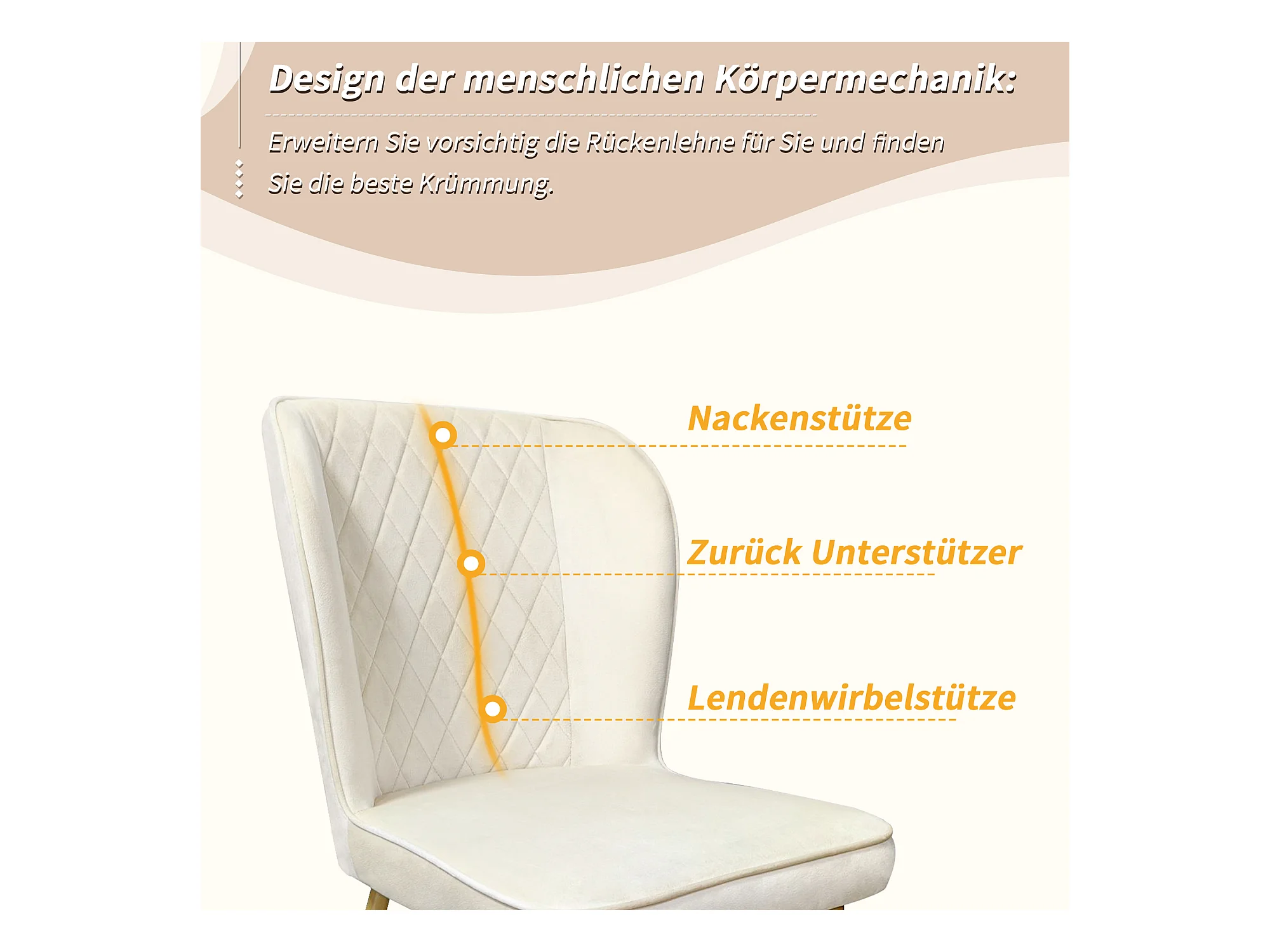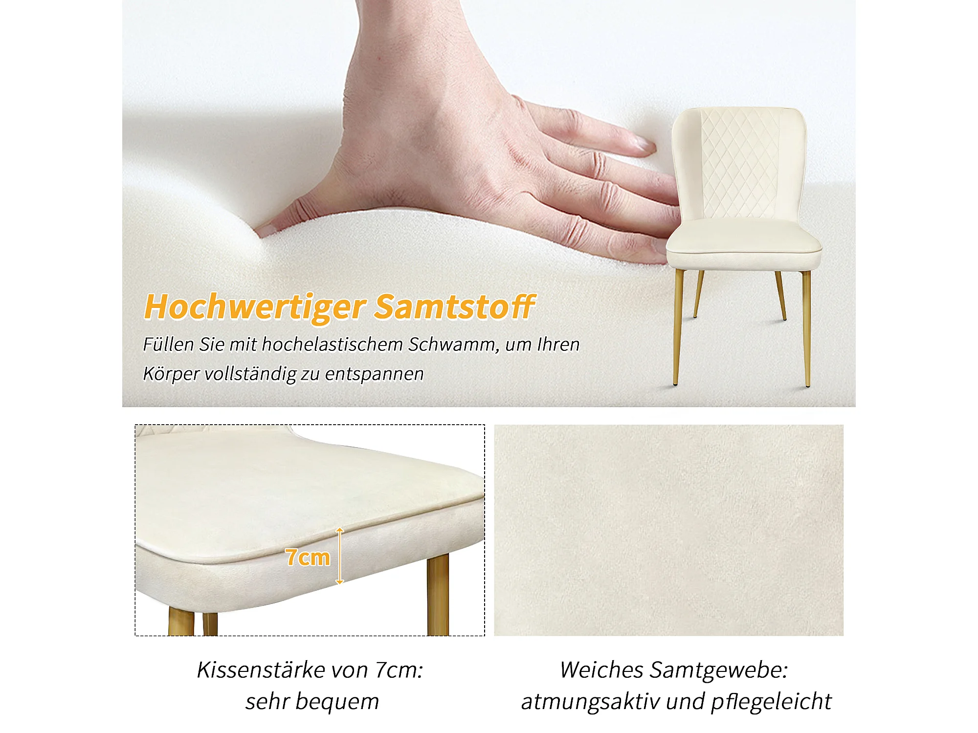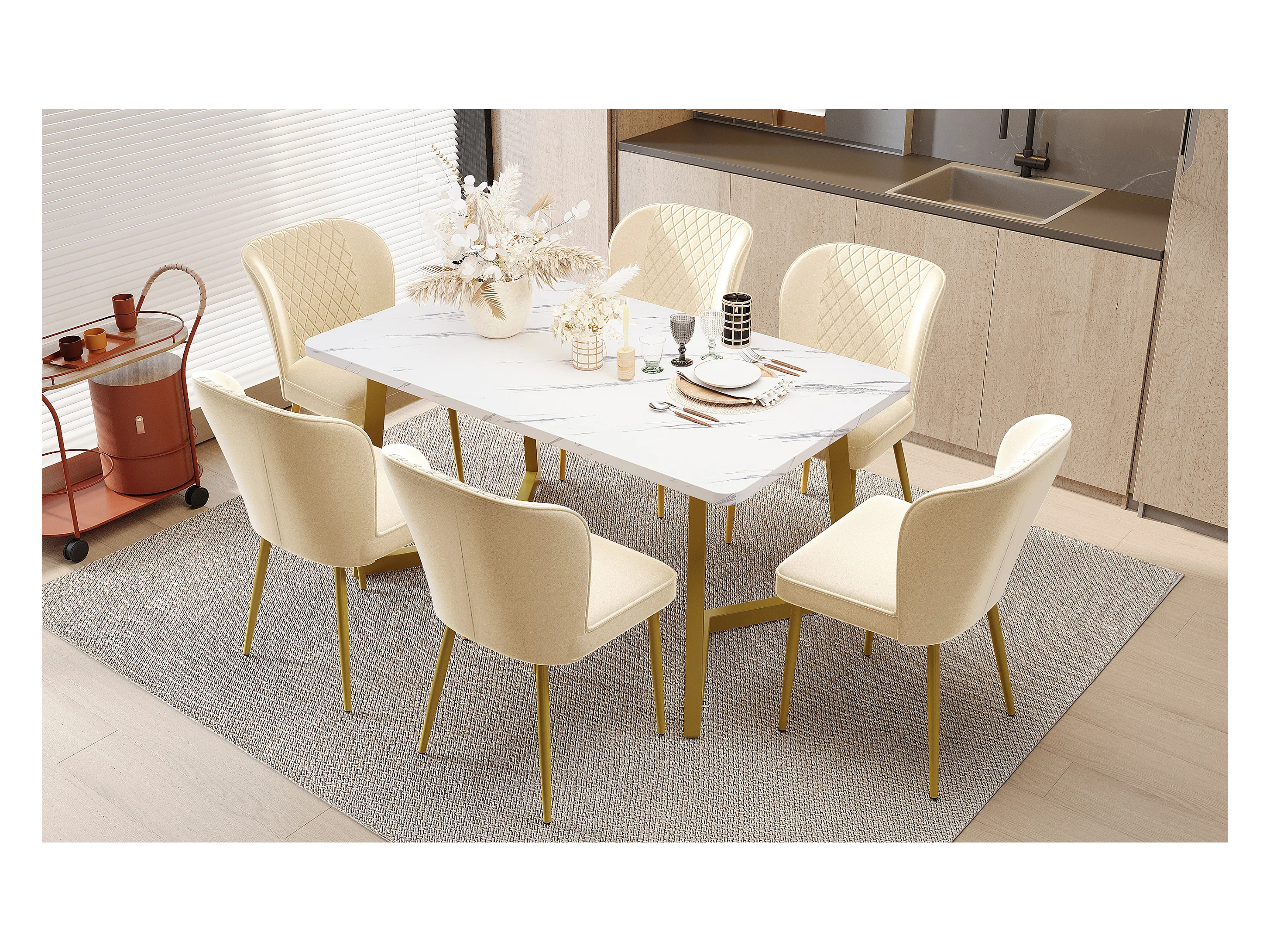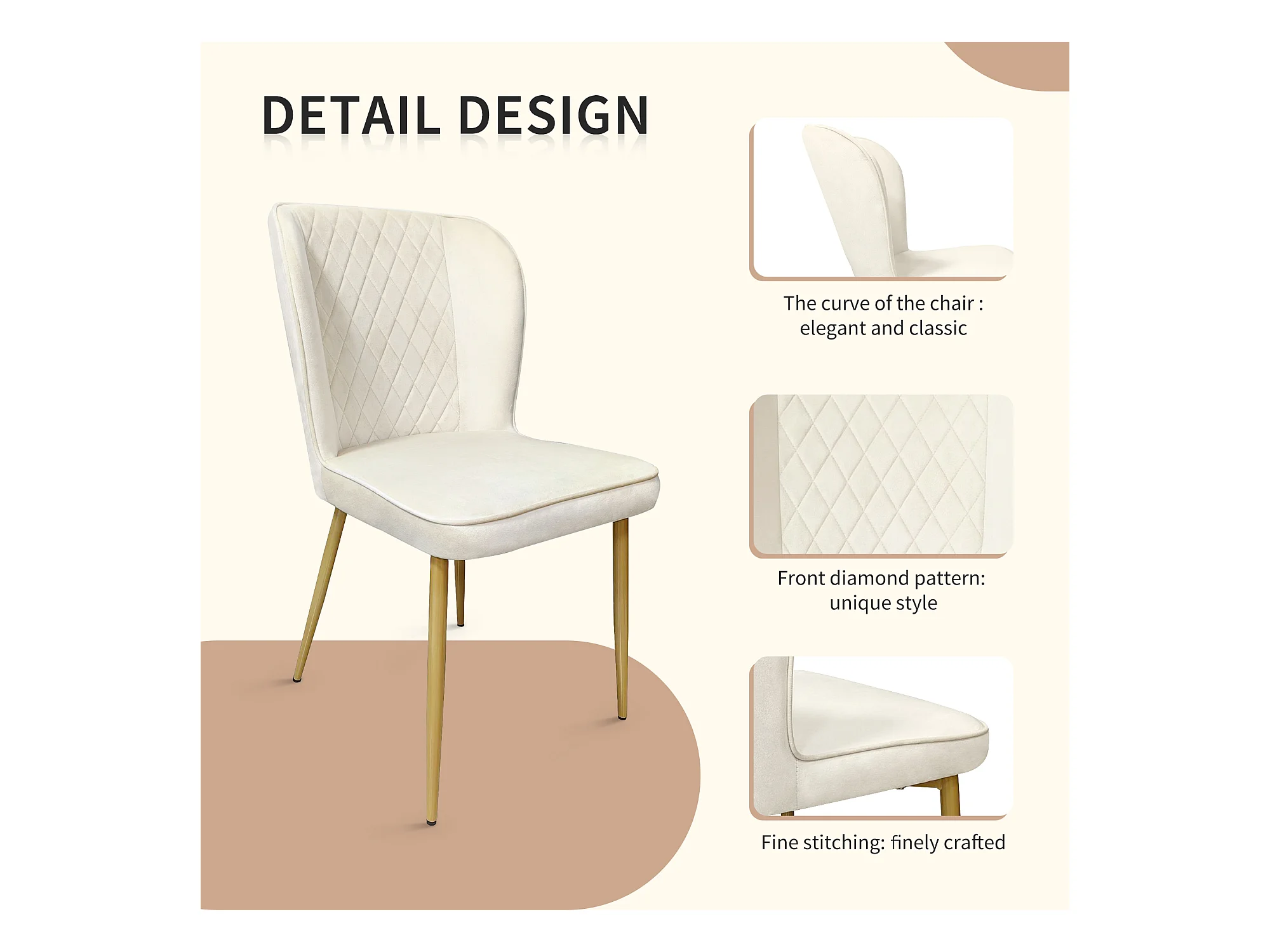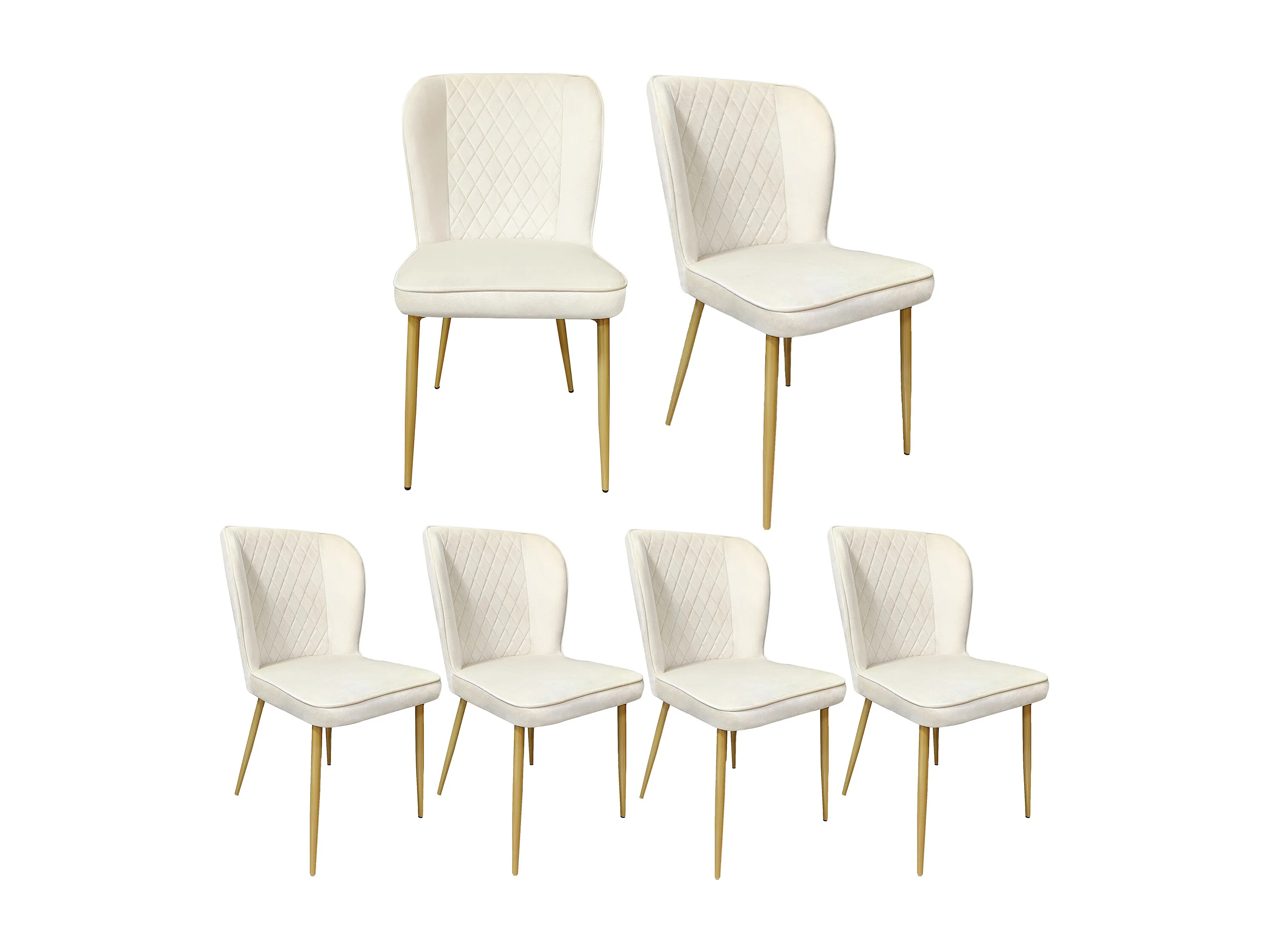 Conjunto de 6 sillas - 47 x 43 x 86 cm - Respaldo tapizado en terciopelo + estructura de metal - Terciopelo - Beige