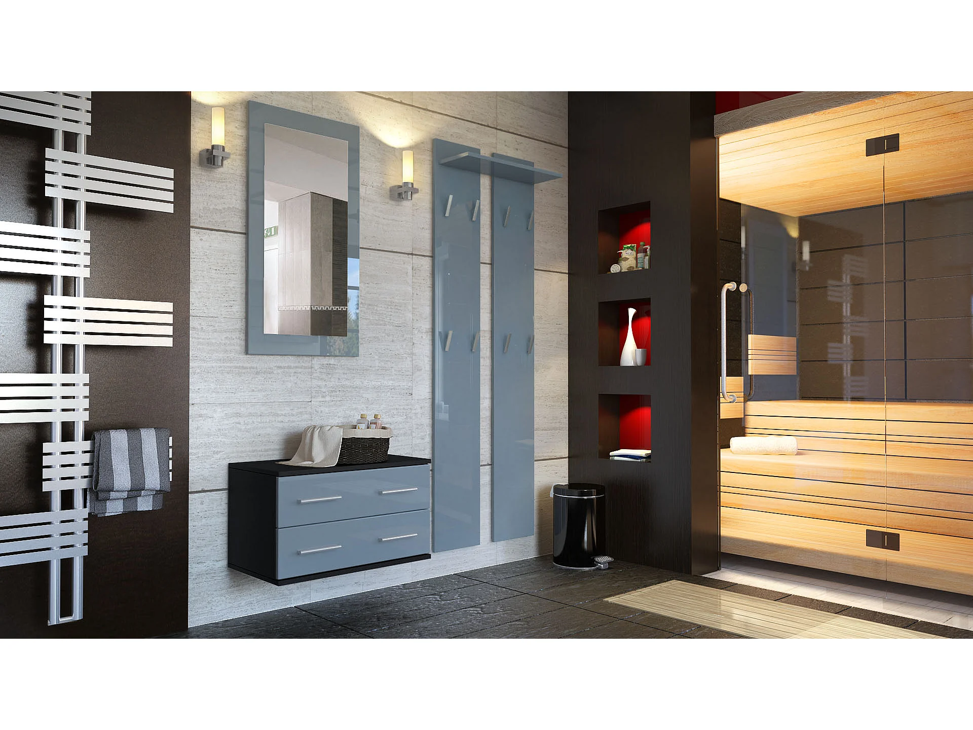 Armario Carlton Neo, Perchero de pared con panel de vestíbulo, espejo, barra para ropa y armario de pared, antracita mate (52 x 193 x 35 cm)