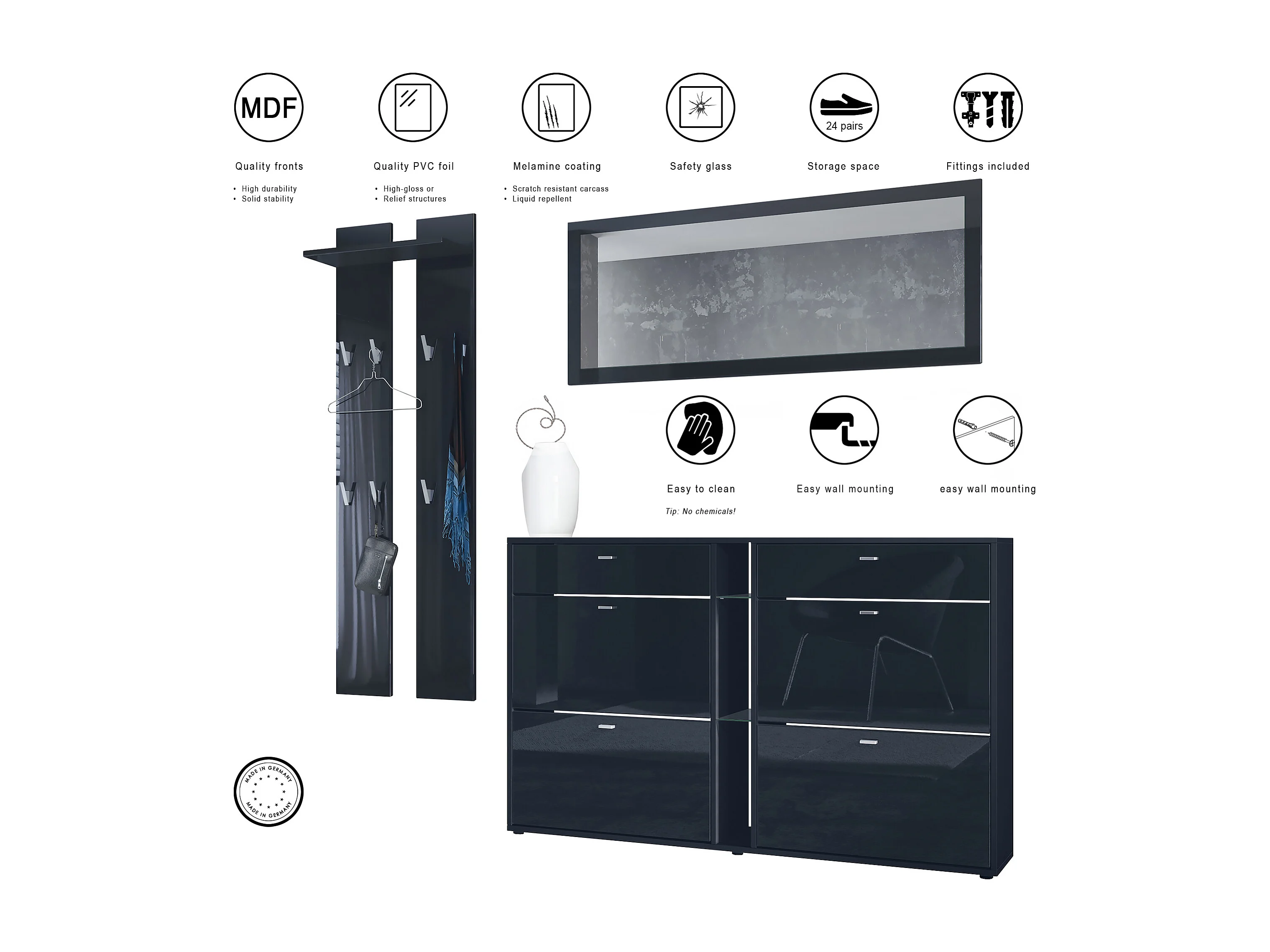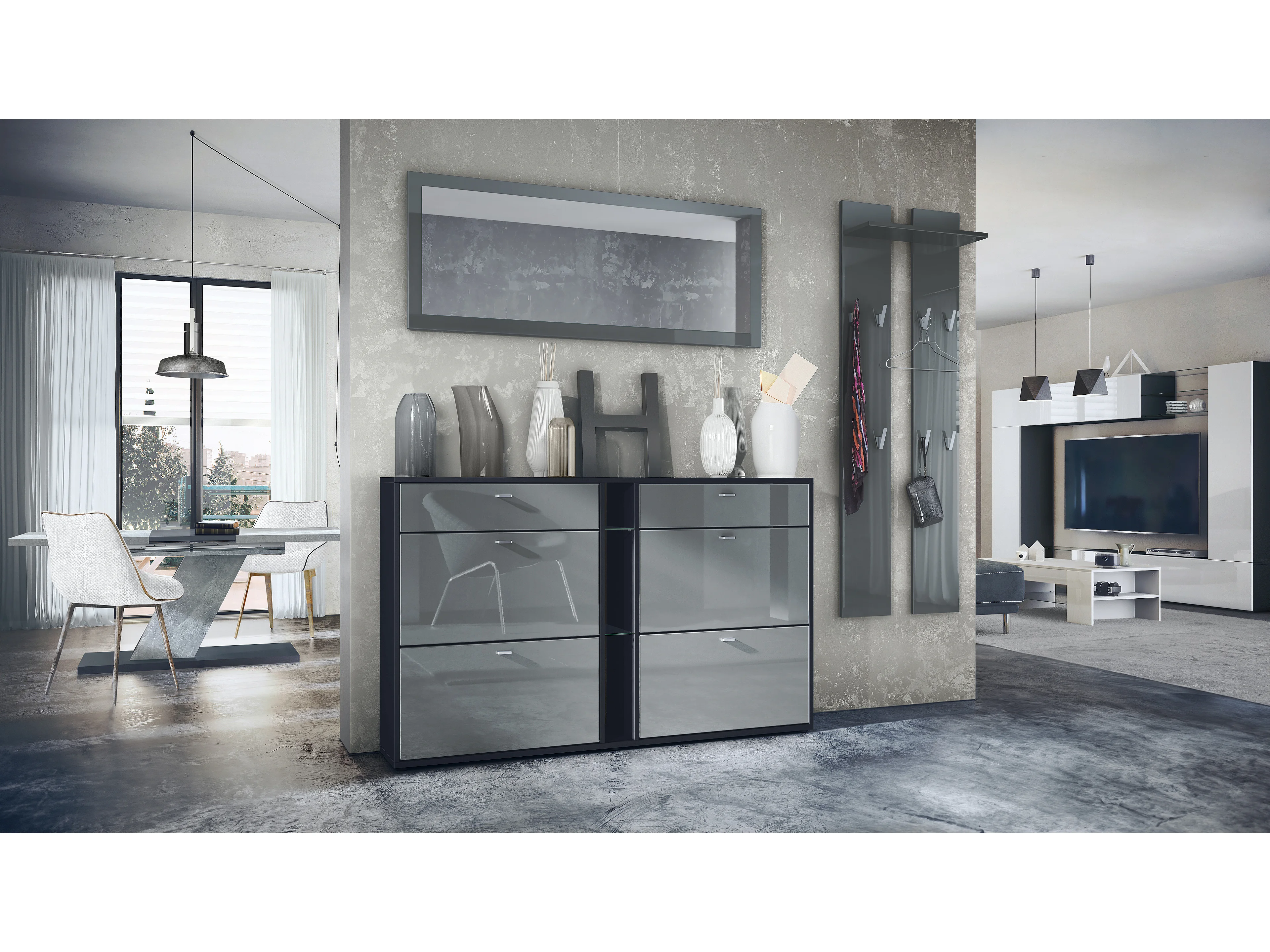 Conjunto de guardarropa Florence con zapatero y 2 espejos de pared, Hecho en ALEMANIA, negro mate/gris de alto brillo
