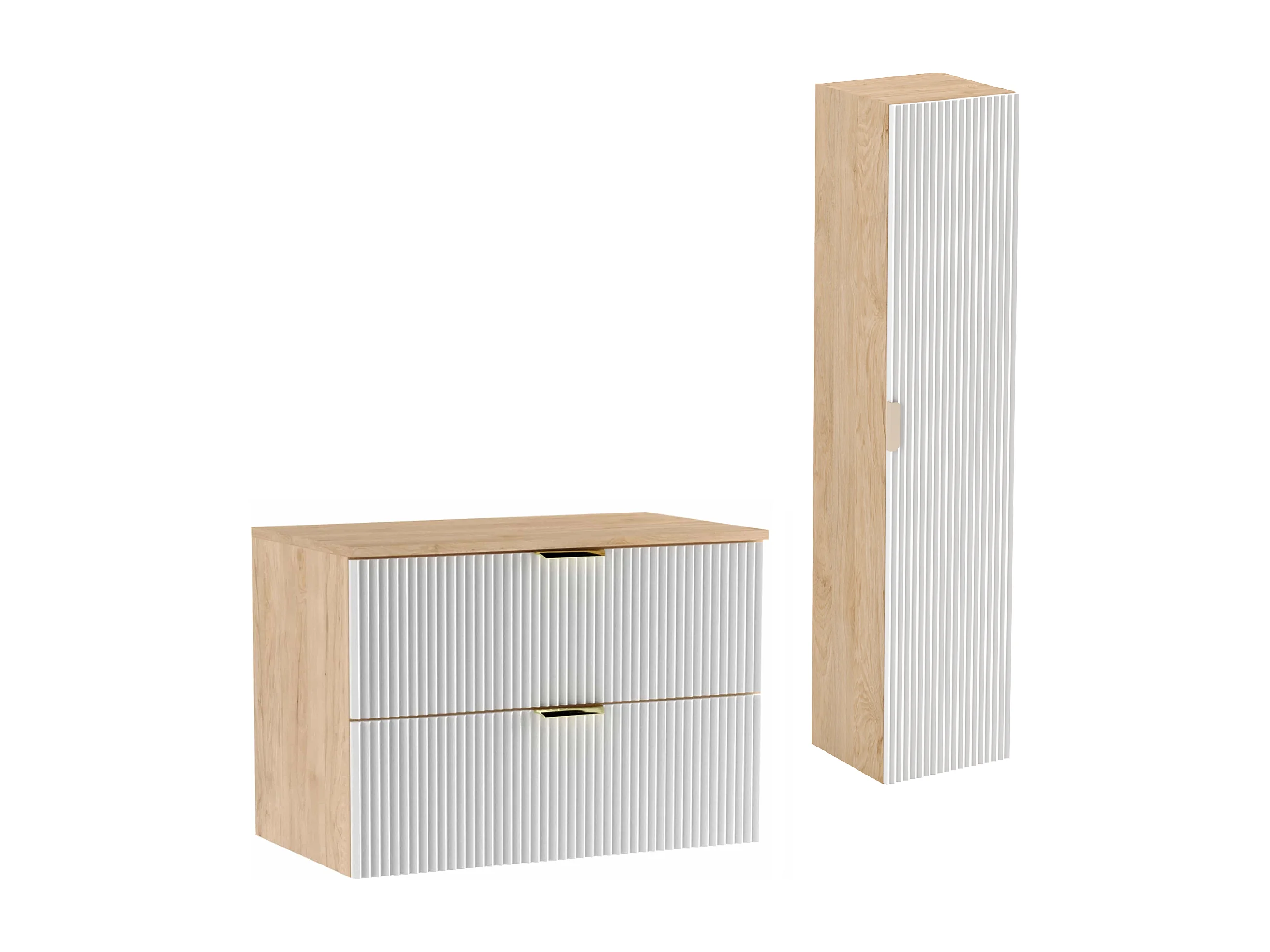 Conjunto de baño 80 cm Armario Encimera Columna Frentes ranurados Blanco / Roble nogal