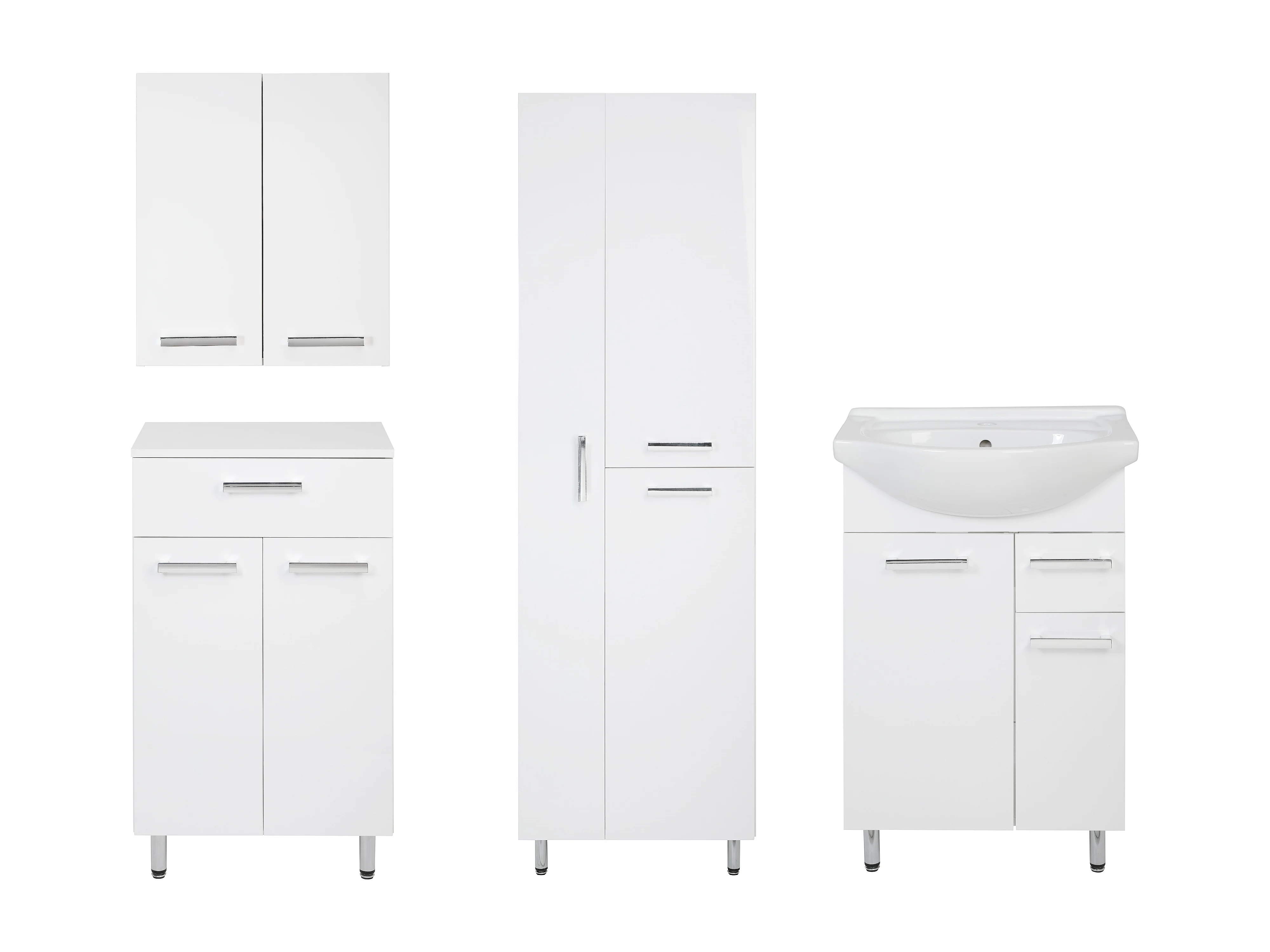 Conjunto de baño blanco de pie, 55 cm, armario con lavabo, poste para fregona, cómoda, armario superior Lupo
