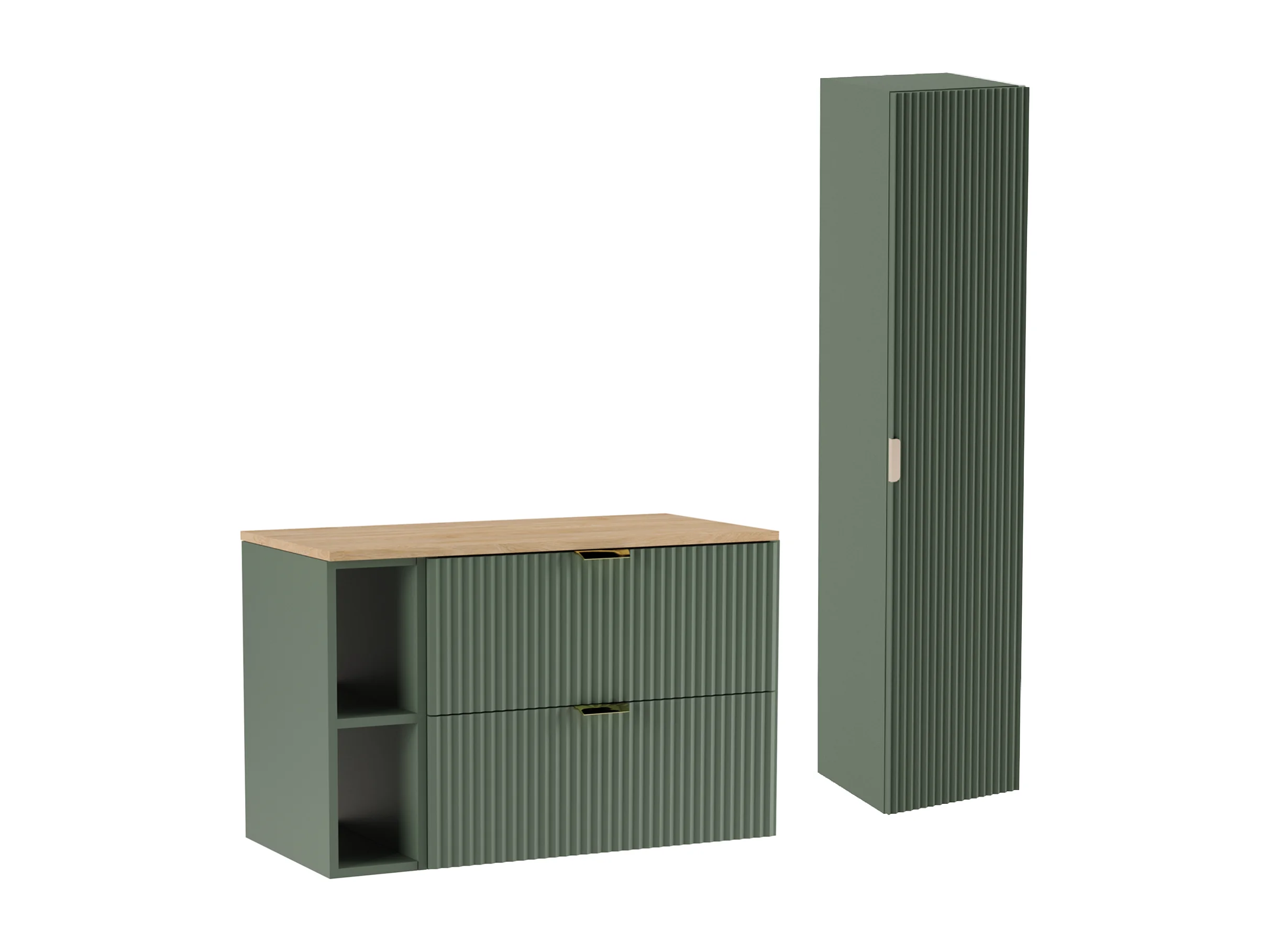 Conjunto de baño verde 100 cm Armario Encimera Nogal Estantería Columna Frentes ranurados