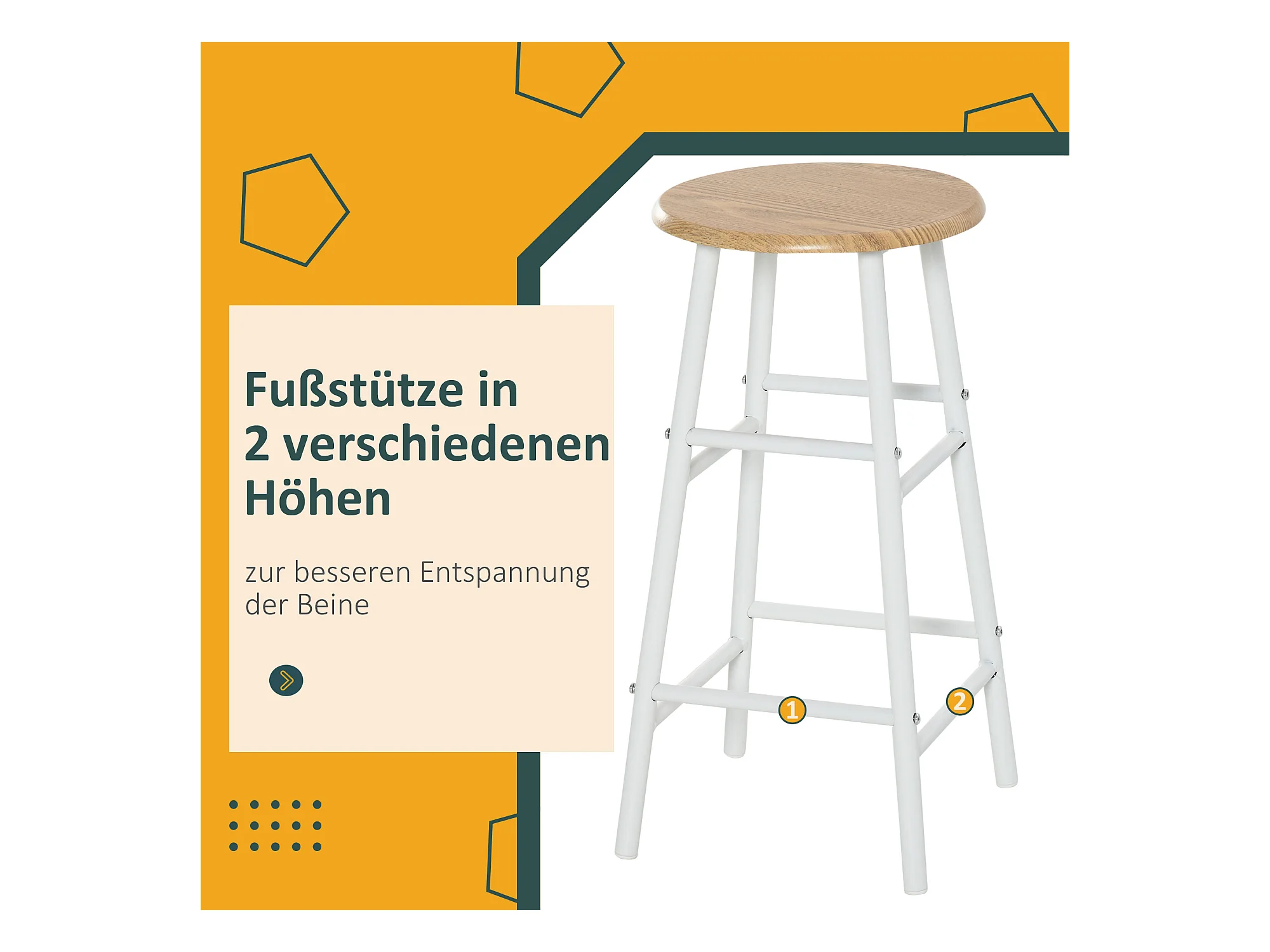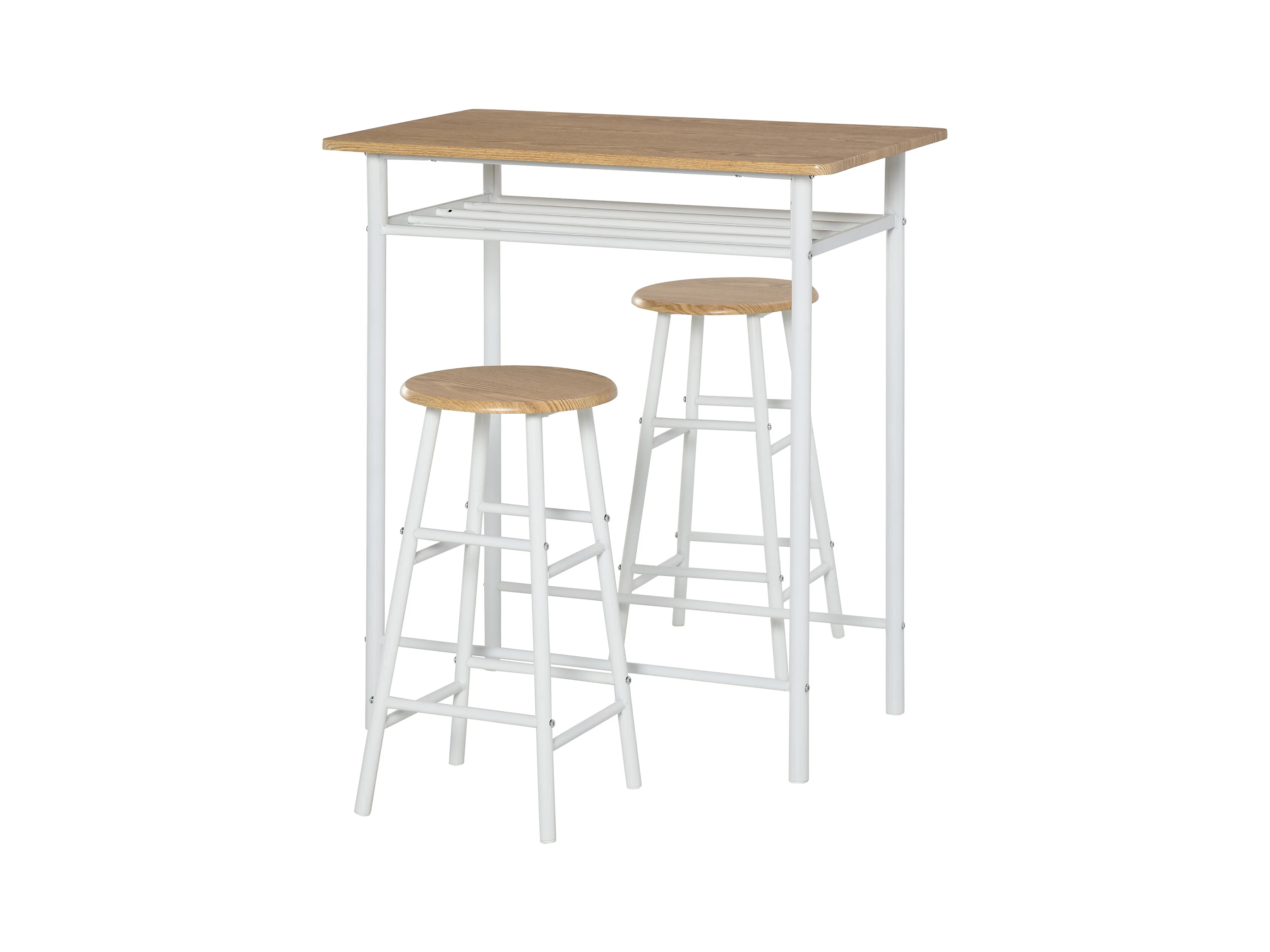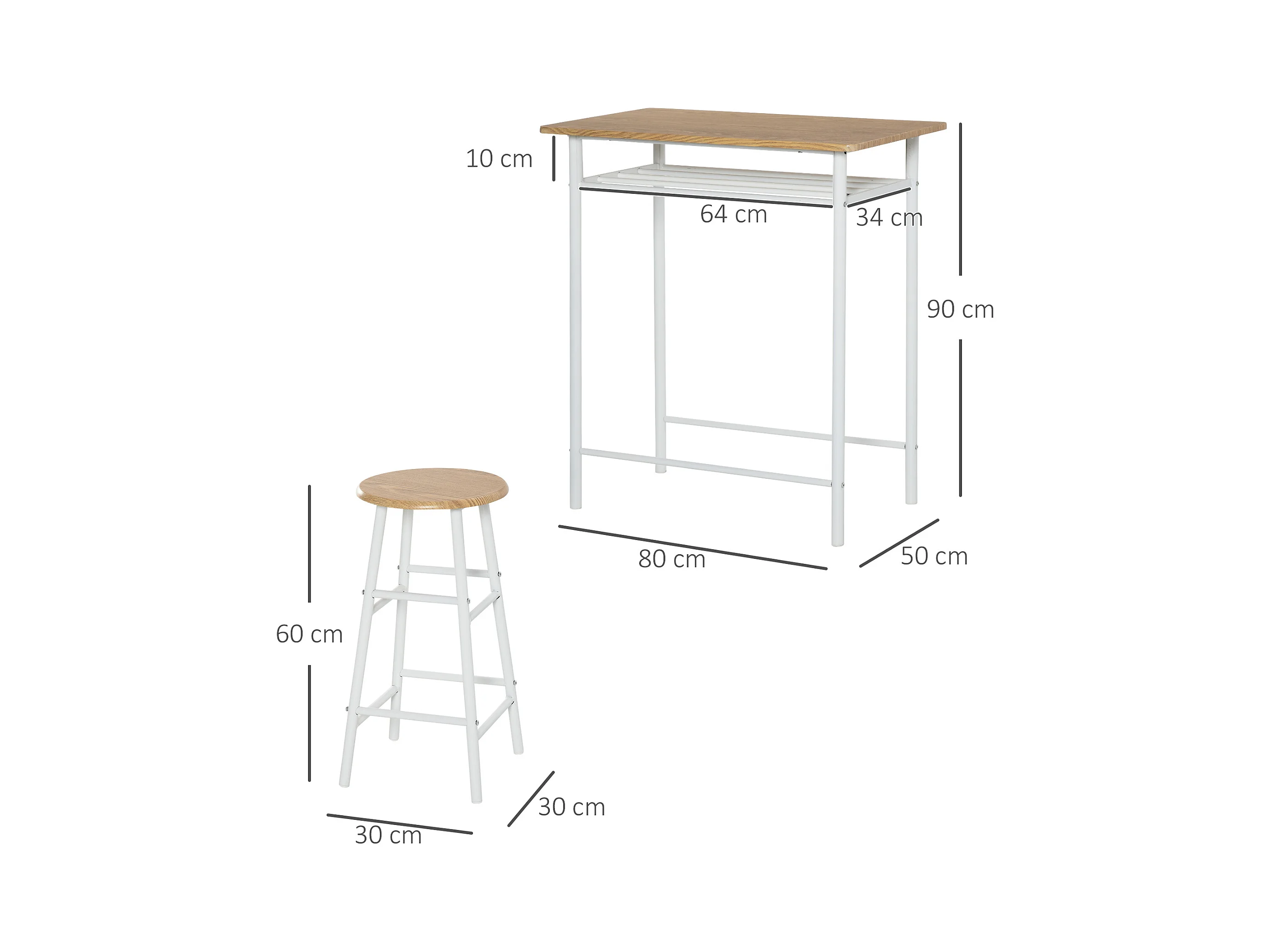 Conjunto de bar de 3 piezas con mesa de metal MDF y 2 taburetes para almacenaje de cocina y salón, roble blanco, 80 x 50 x 90 cm