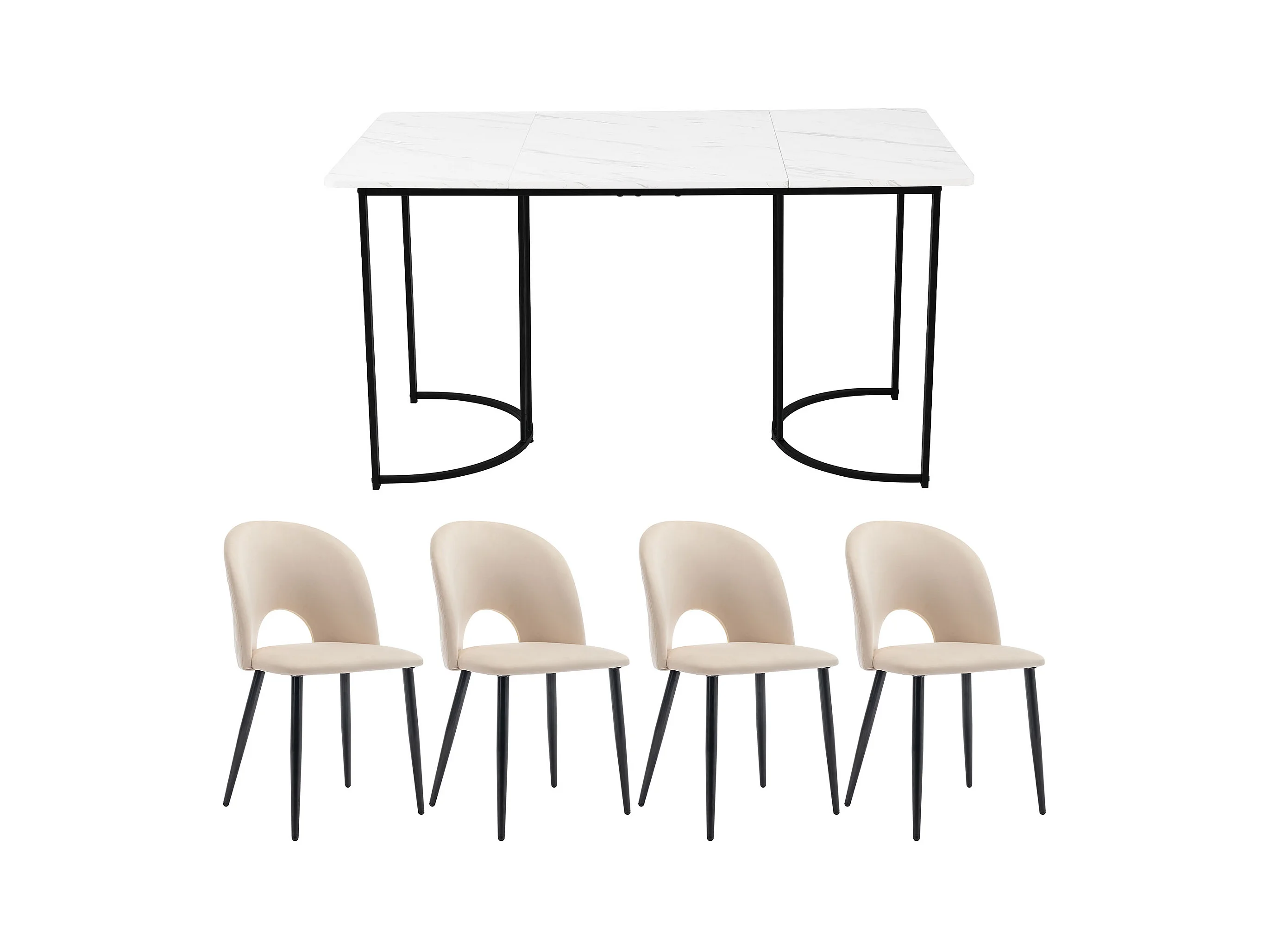 Conjunto de comedor, mesa 140×80×75cm con 4 sillas con patas regulables, MDF+metal+terciopelo, negro+blanco+beige