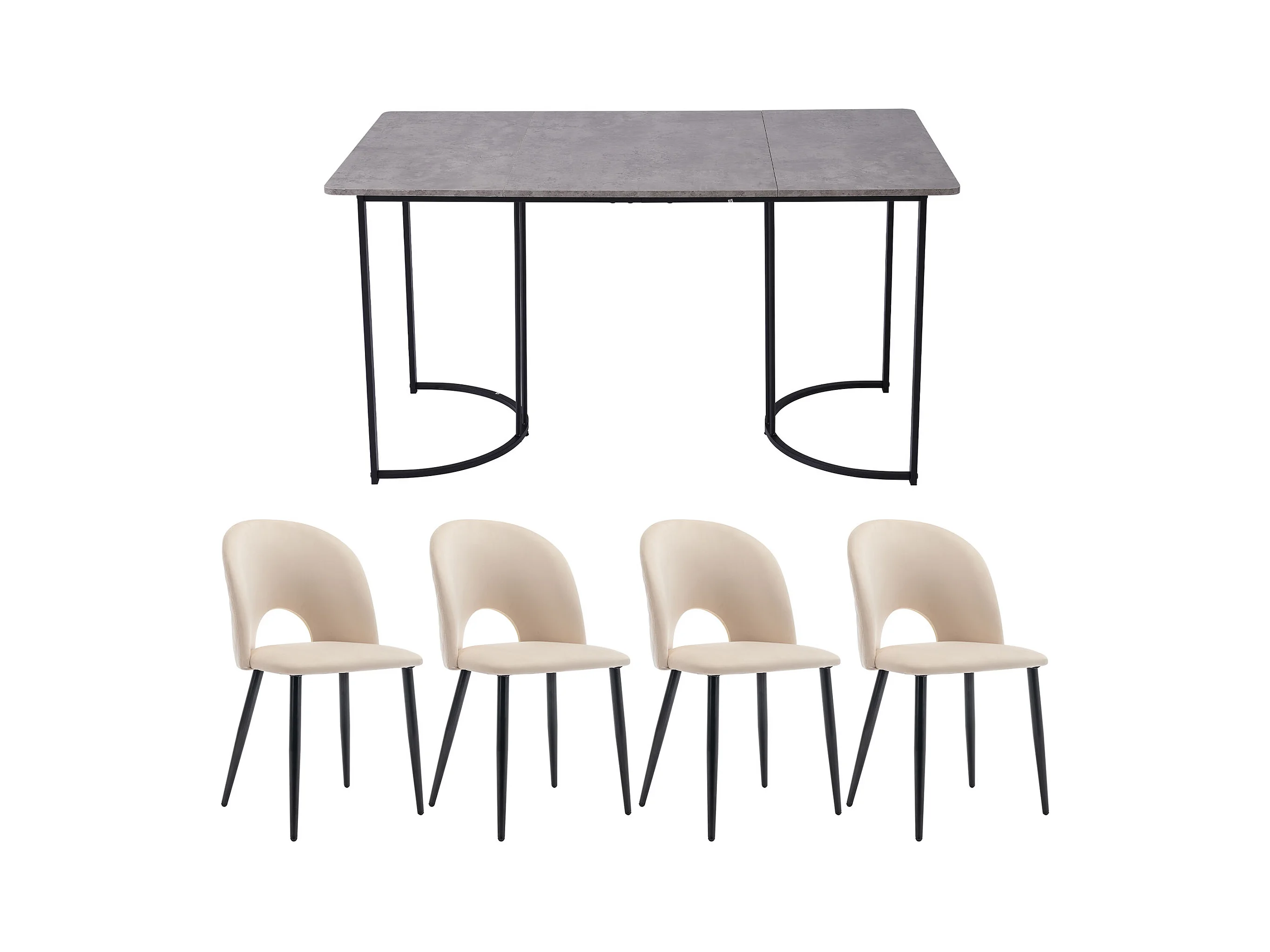 Conjunto de comedor, mesa 140×80×75cm con 4 sillas con patas regulables, MDF+metal+terciopelo, negro+gris+beige