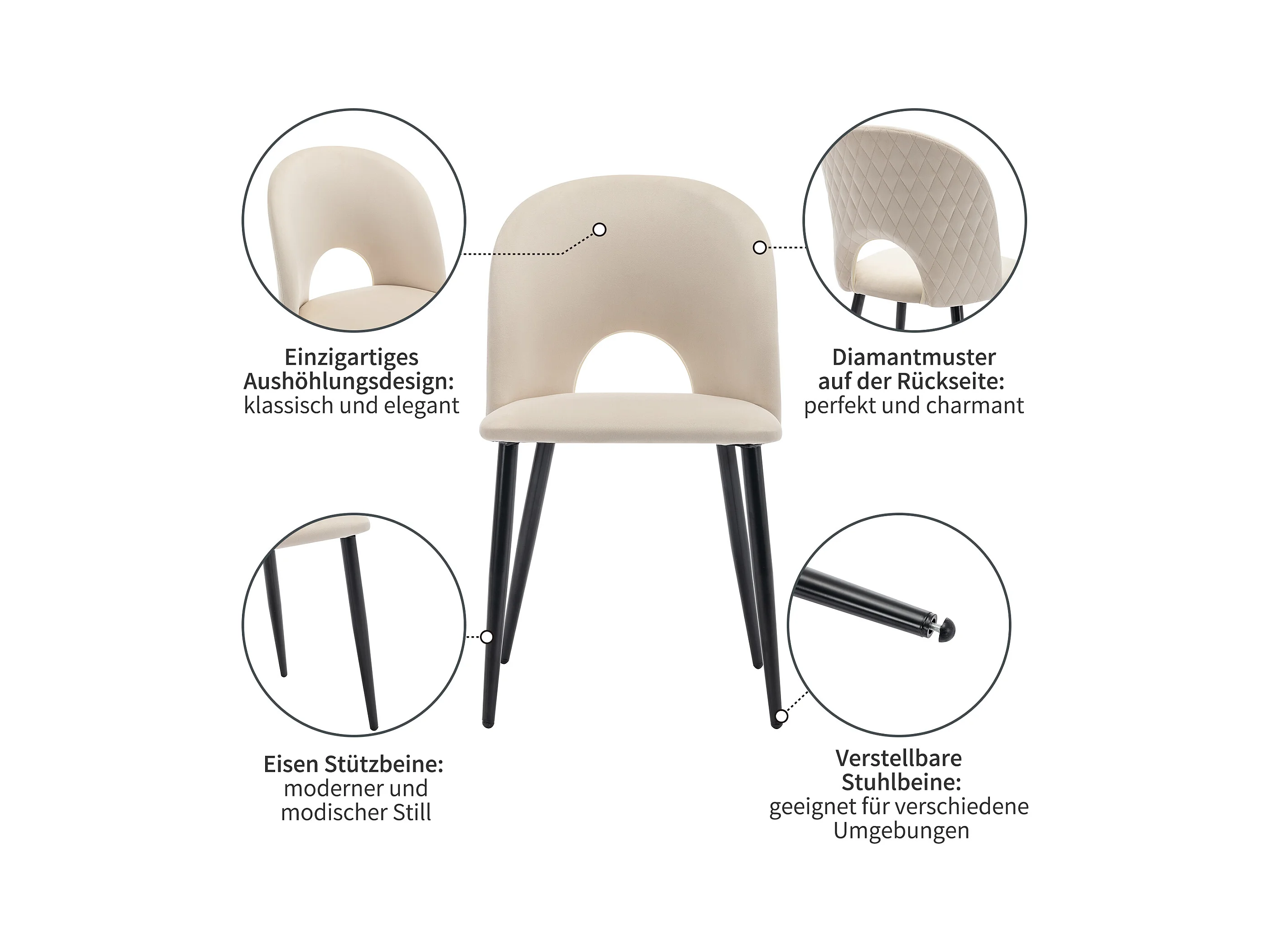 Conjunto de comedor, mesa 140×80×75cm con 4 sillas con patas regulables, MDF+metal+terciopelo, negro+blanco+beige