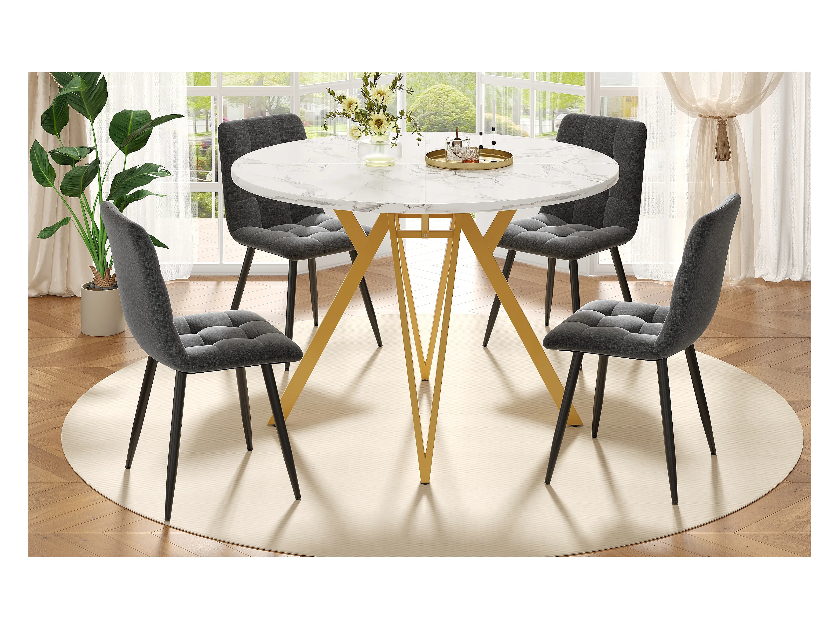 Conjunto de comedor de 5 piezas, mesa redonda de 100 cm, mármol MDF, patas de metal, sillas de terciopelo gris
