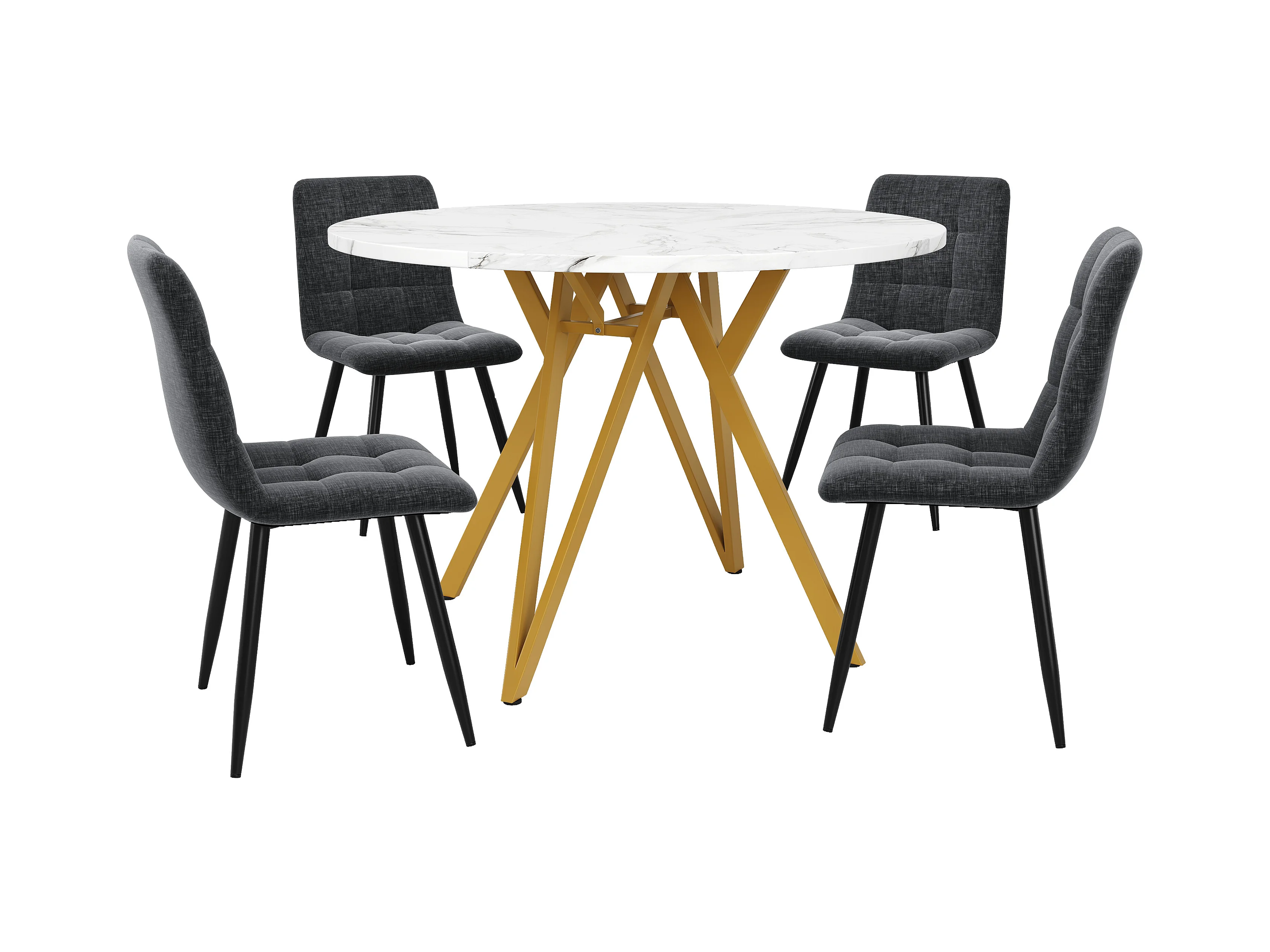 Conjunto de comedor de 5 piezas con mesa redonda de MDF efecto mármol de 100 cm y patas de metal dorado y sillas de tela gris