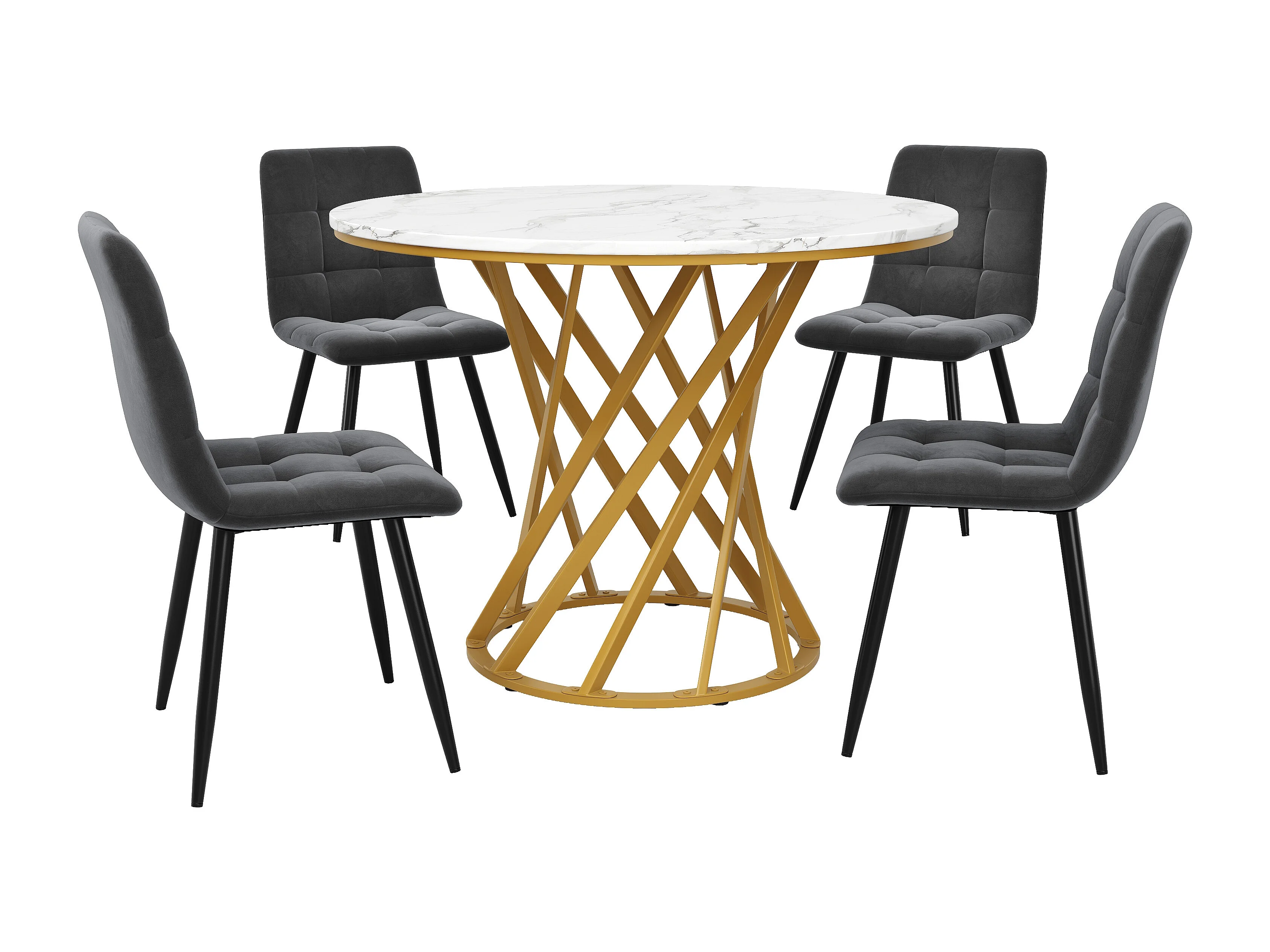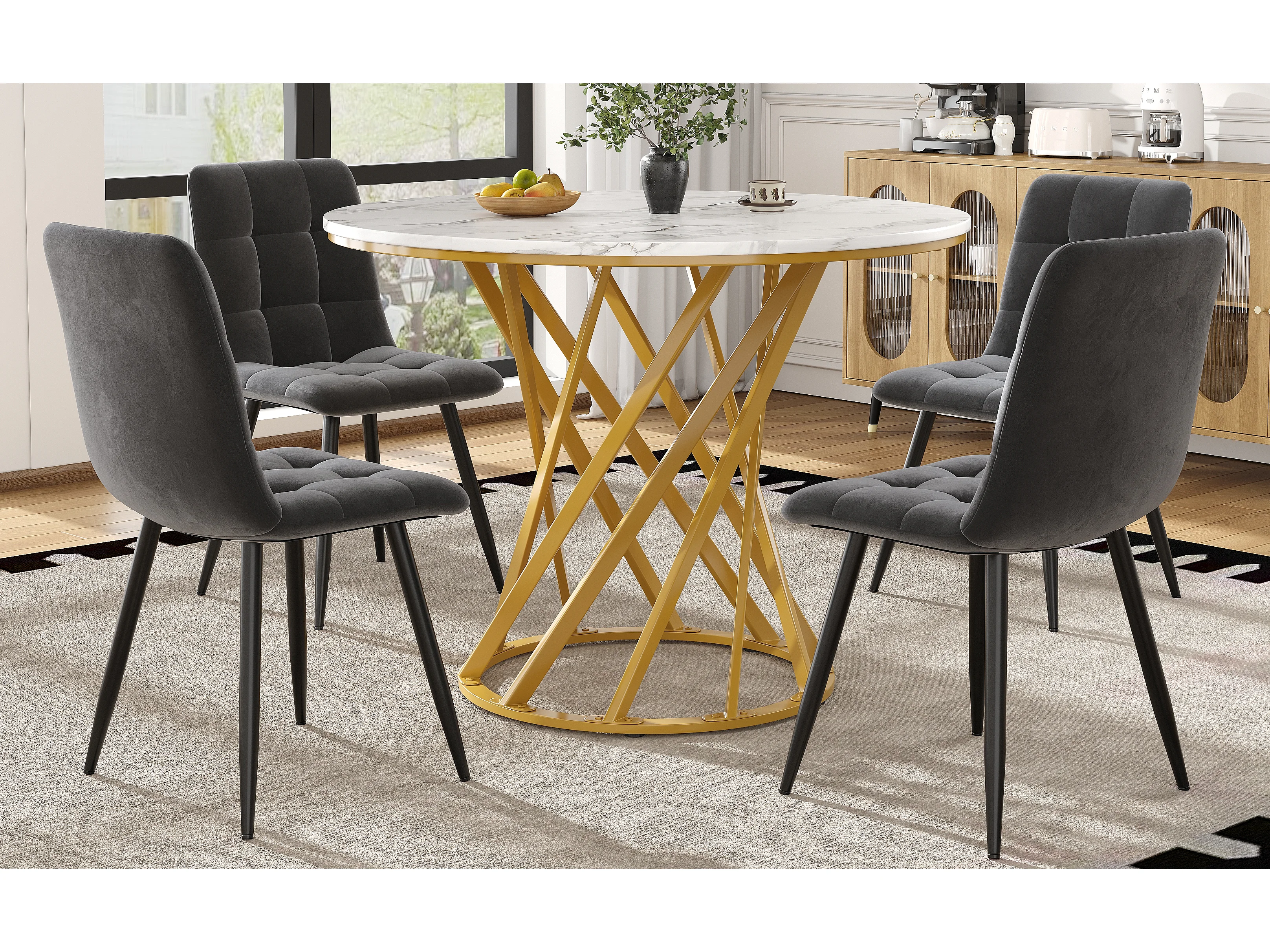 Conjunto de comedor de 5 piezas, mesa redonda de 80 cm, MDF blanco, patas doradas, sillas de terciopelo gris oscuro