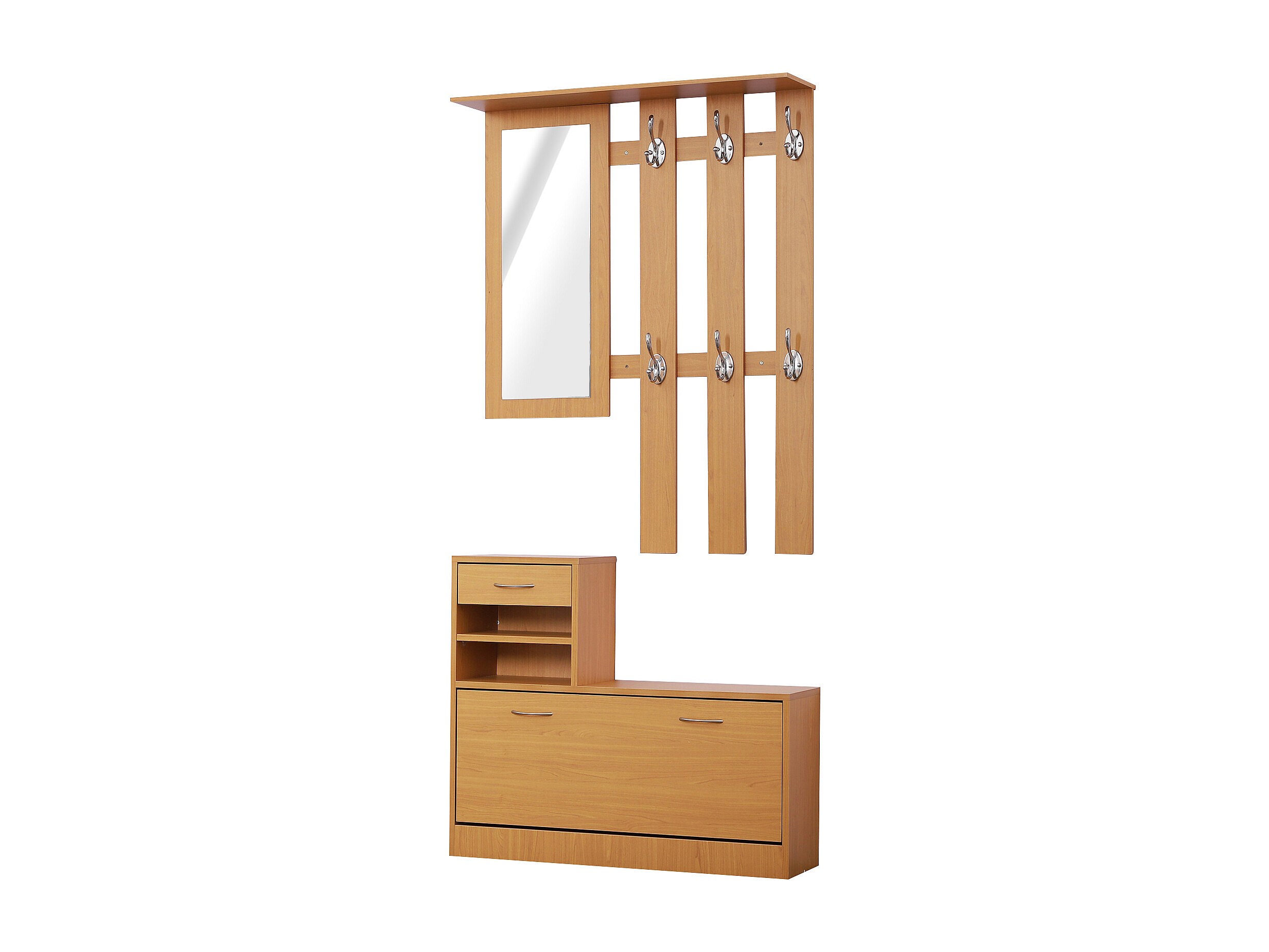 ¿Necesitas espacio para guardar tus zapatos? ¿No sabes dónde colgar tus chaquetas? ¡Con este mueble 3 en 1 encontrarás las respuestas a tus preguntas! Este 3 en 1 consta de un zapatero, unos estantes y un espejo. El armario para zapatos está formado por una puerta abatible y dos estantes. Encima del zapatero hay un cajón y dos estantes, perfecto para guardar pequeños objetos. El espejo es perfecto para darte un último vistazo, además al lado del espejo tienes 6 ganchos para colgar chaquetas, gorros o bufandas. ¡Este mueble recibidor es el complemento perfecto para tu hogar!