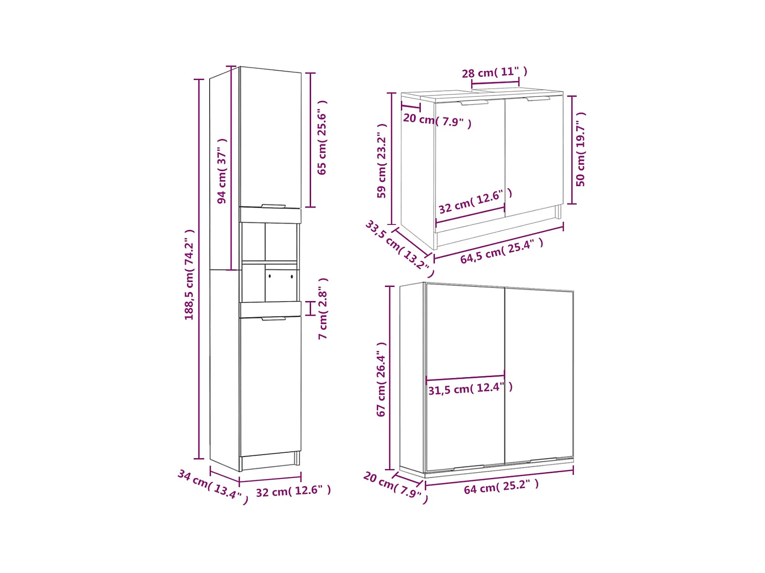 Conjunto de gabinete de baño de 3 piezas de madera de ingeniería blanca