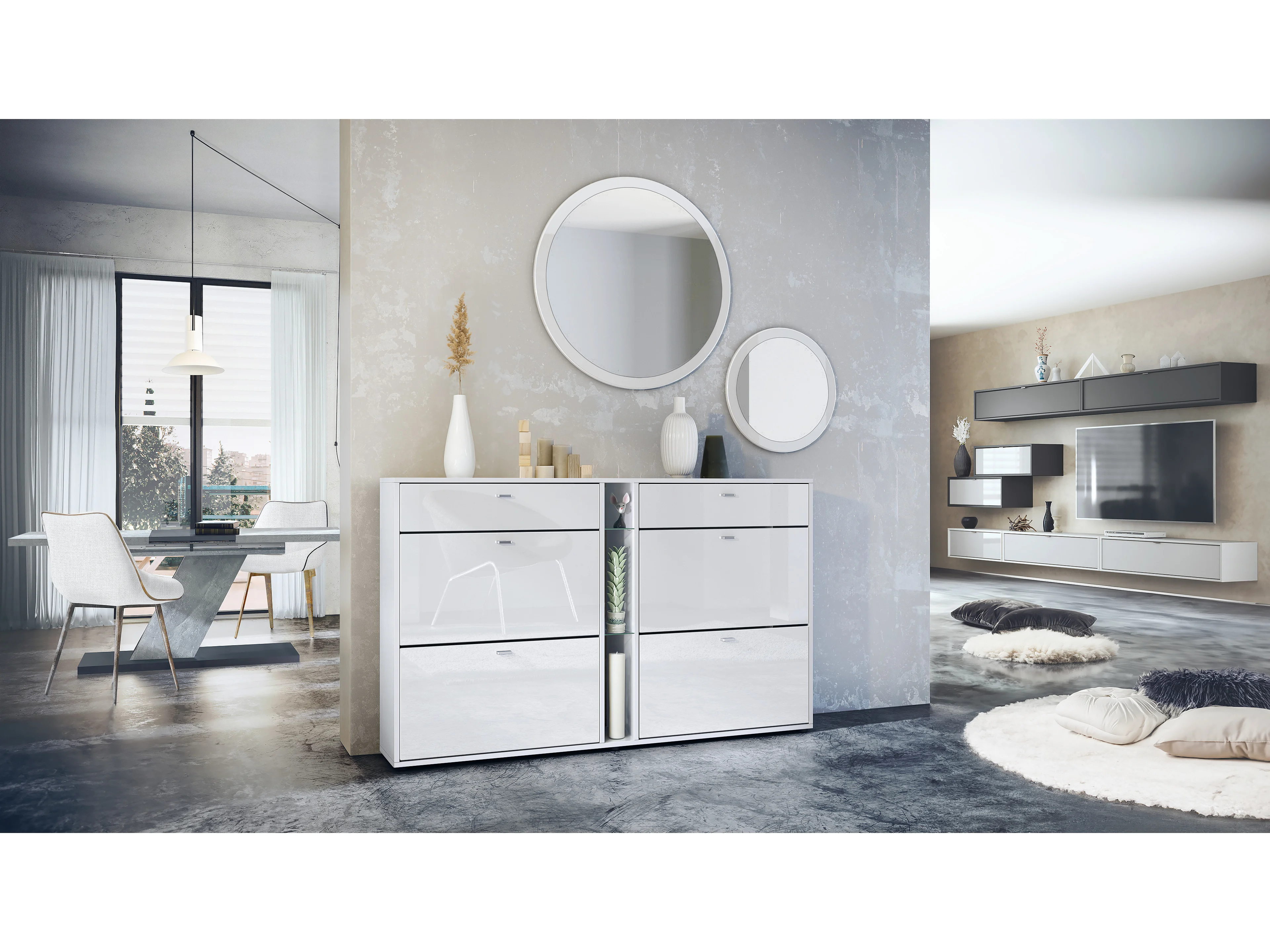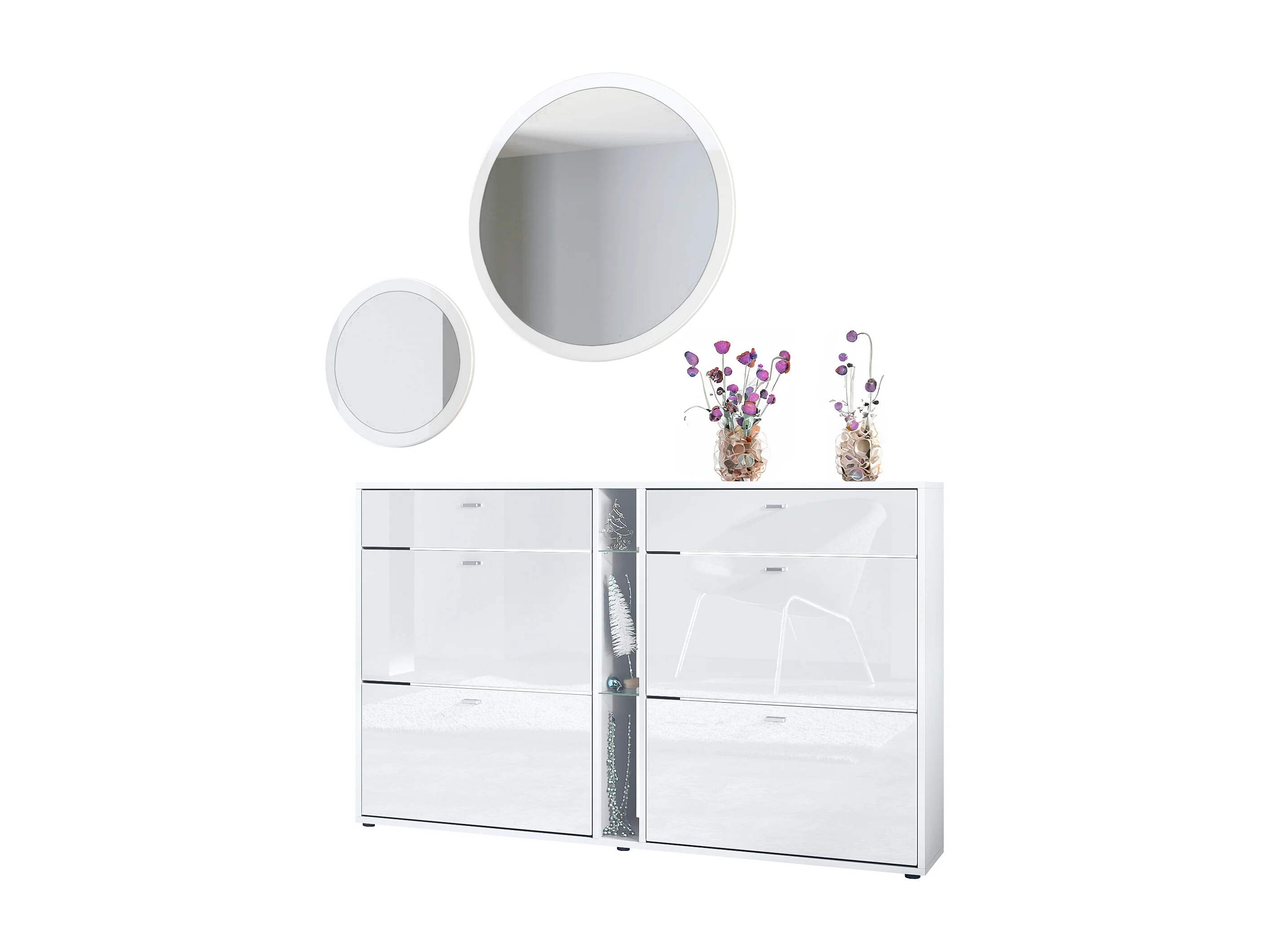 Conjunto de guardarropa Florence con zapatero y 2 espejos de pared, Hecho en ALEMANIA, blanco mate/blanco de alto brillo