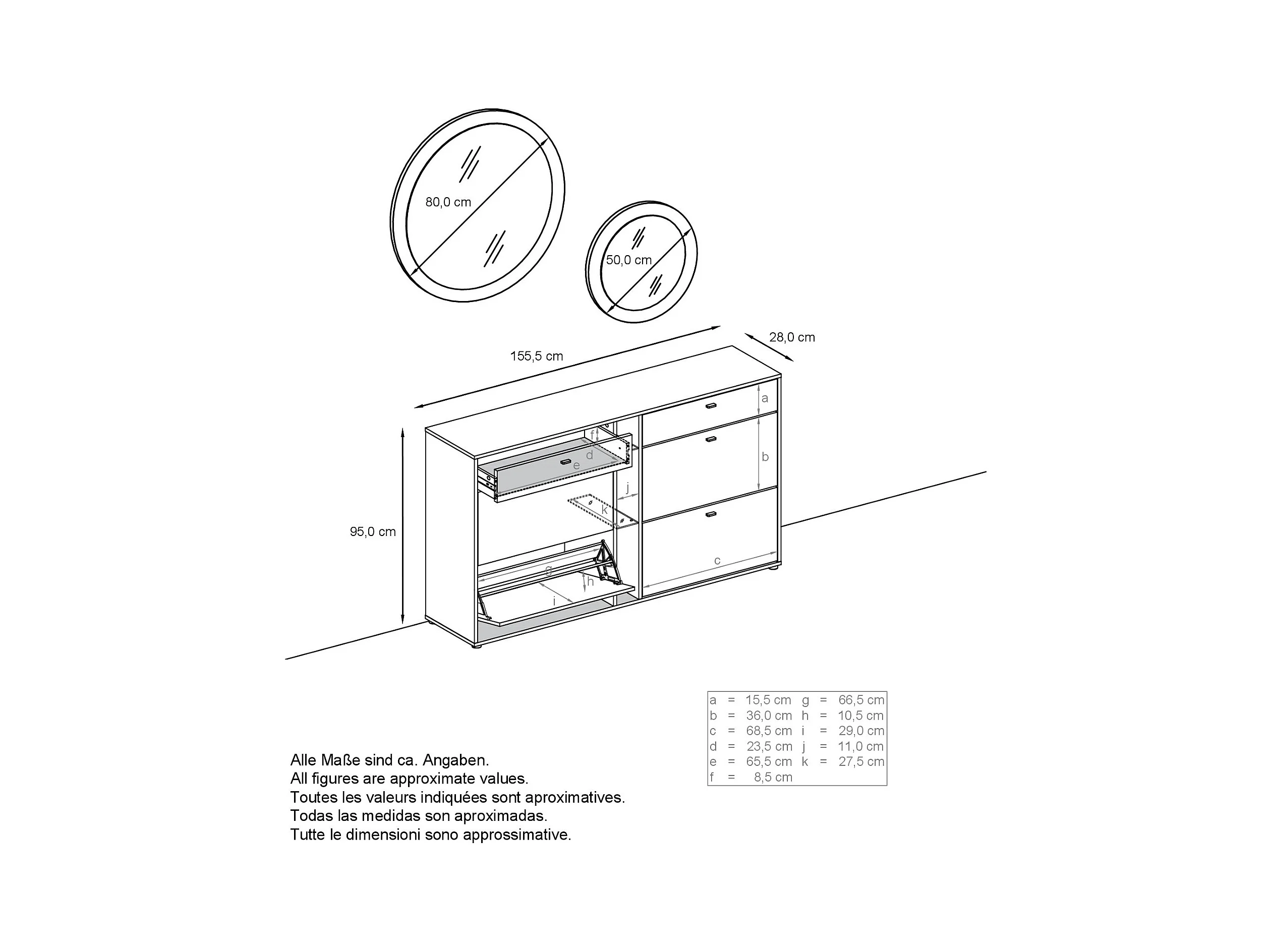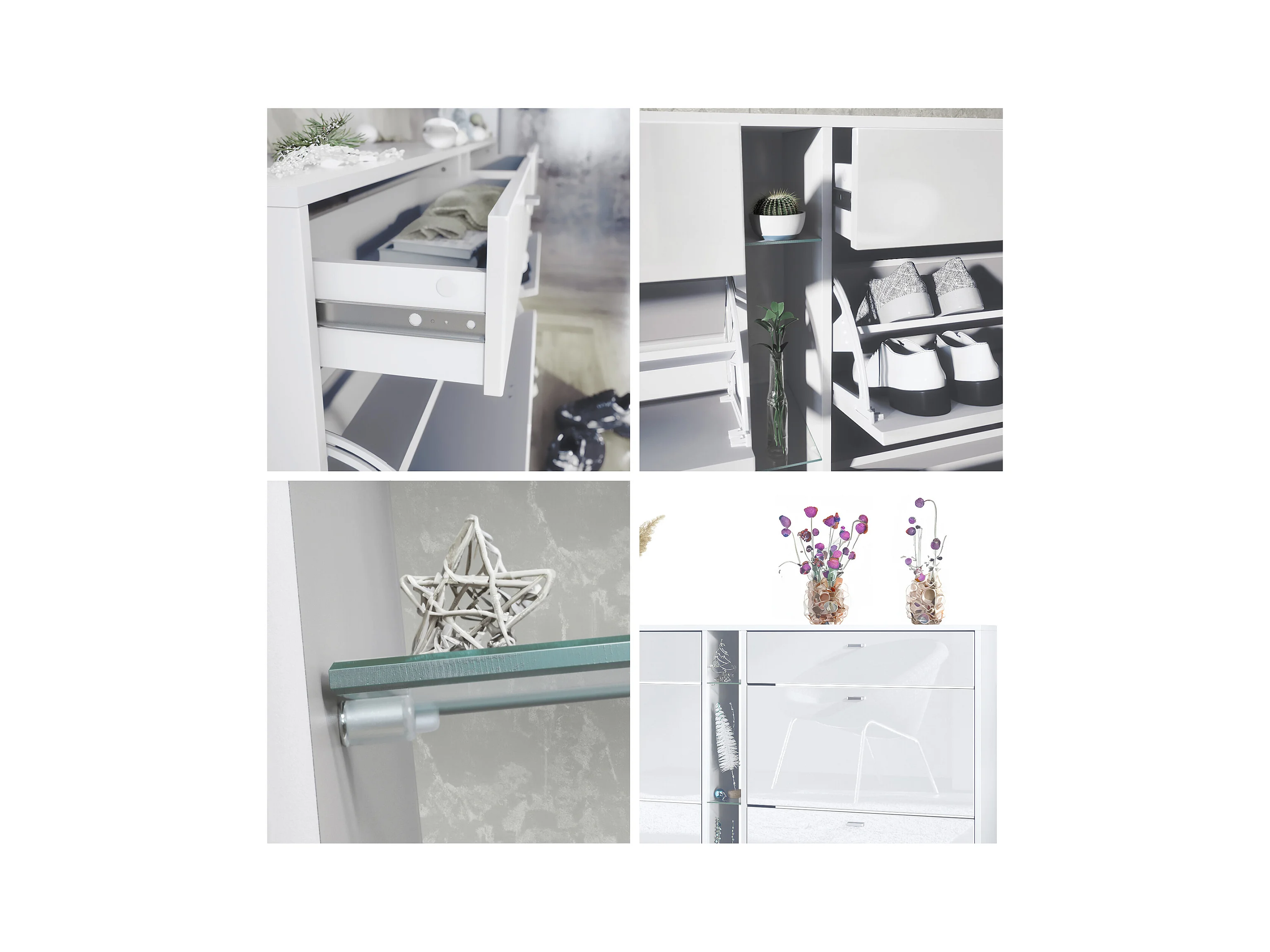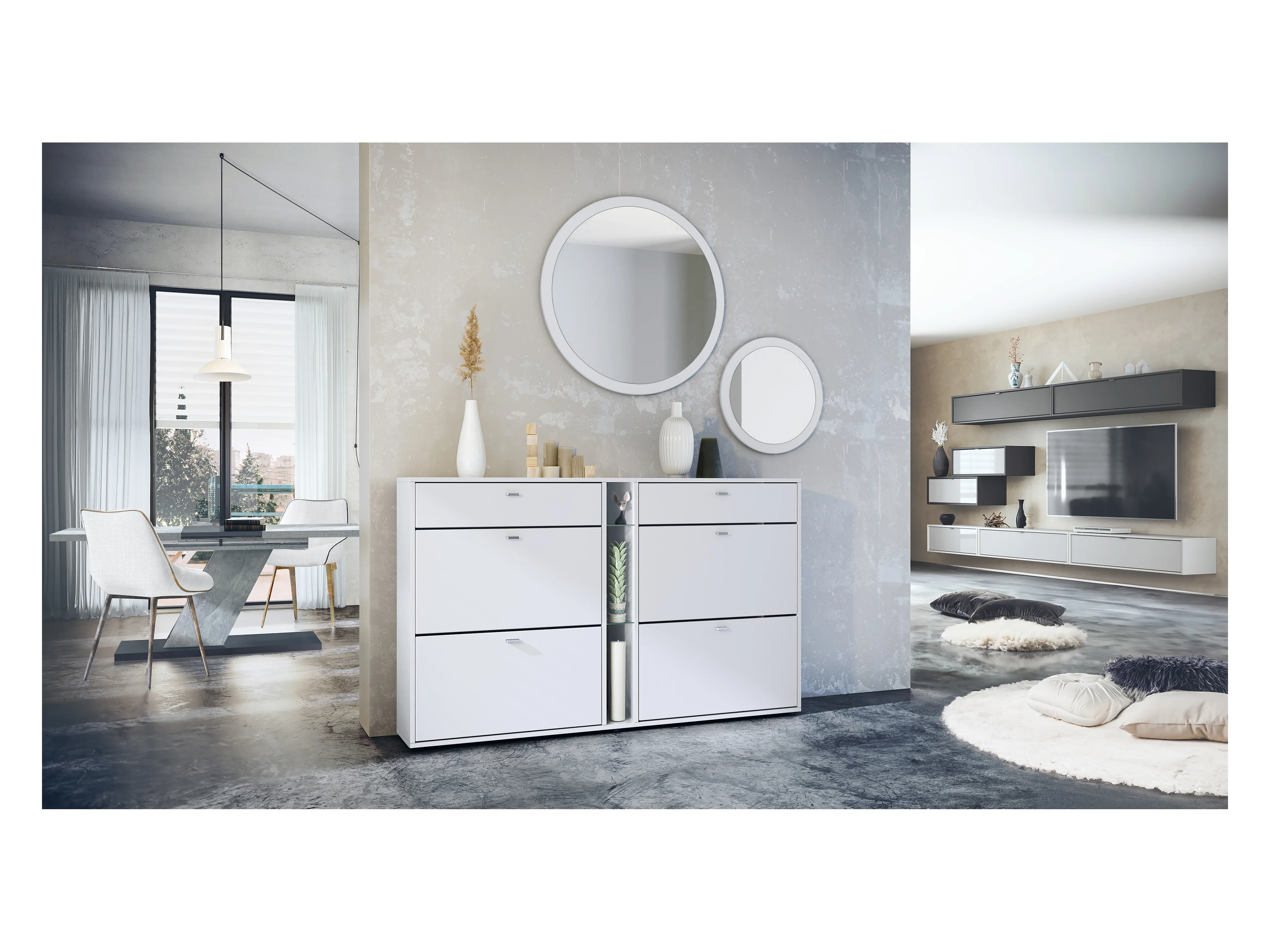 Conjunto de guardarropa Florence con zapatero y 2 espejos de pared, Hecho en ALEMANIA, blanco mate/blanco mate