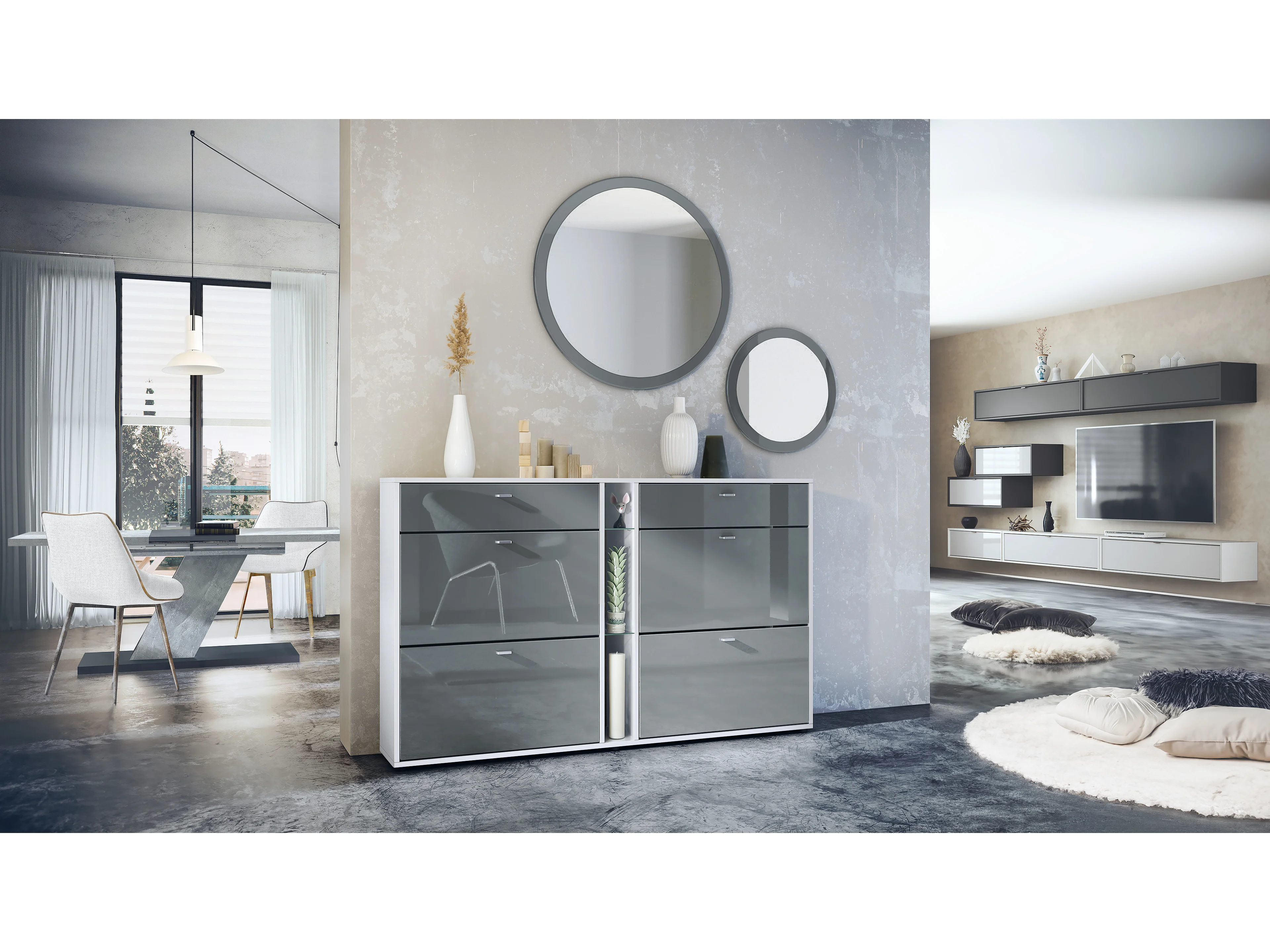 Conjunto de guardarropa Florence con zapatero y 2 espejos de pared, Hecho en ALEMANIA, blanco mate/gris de alto brillo