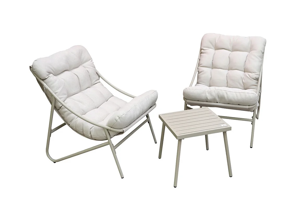 Conjunto de jardín para 2 personas – Beige con cojines blancos – 2 sillones + mesa auxiliar