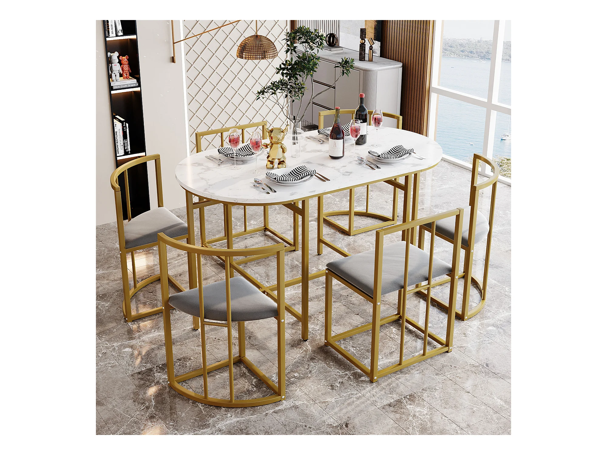 Juego de comedor 6 sillas - Juego de comedor con cojines grises y estructura dorada - mesa blanca - para comedor