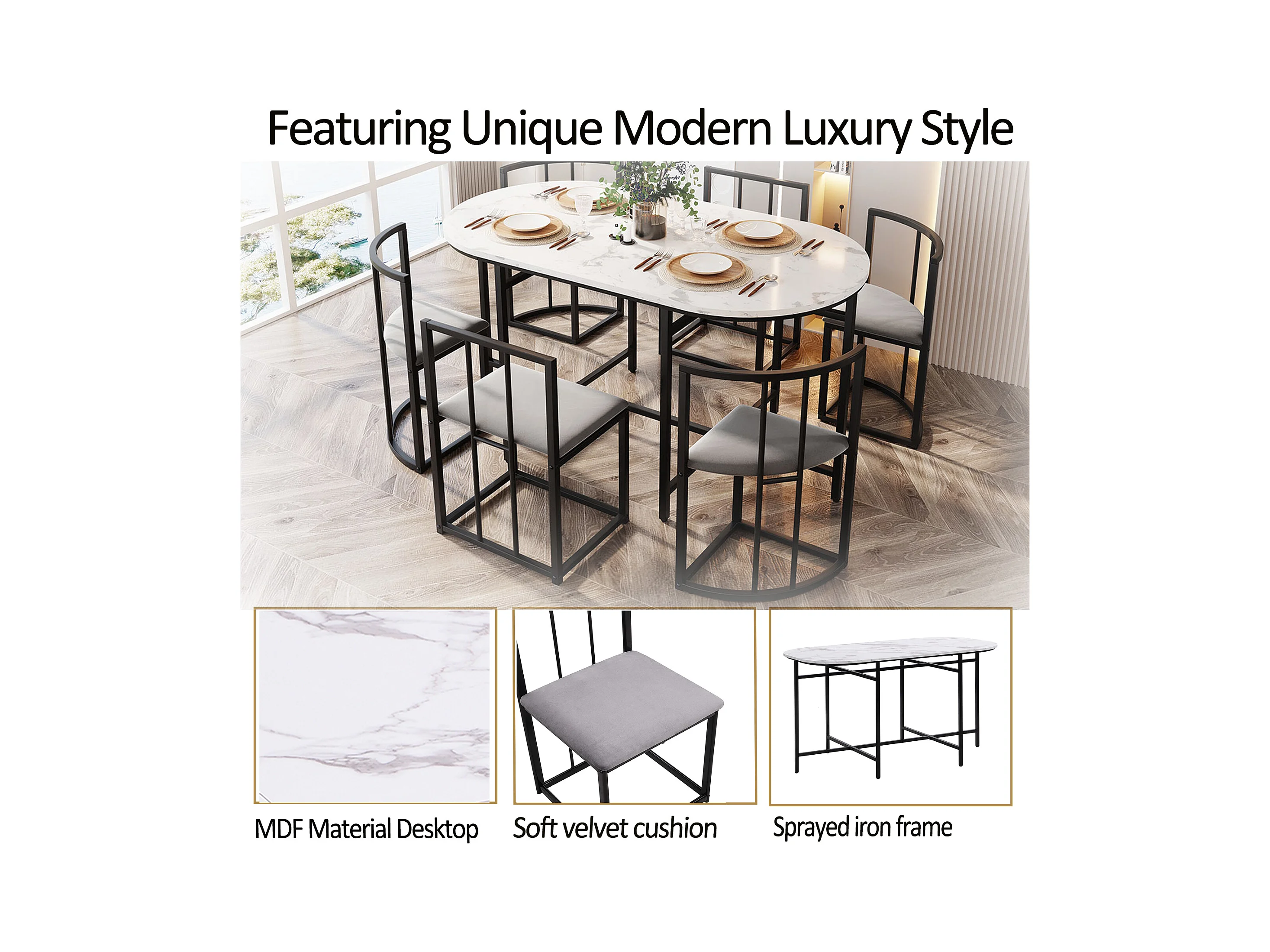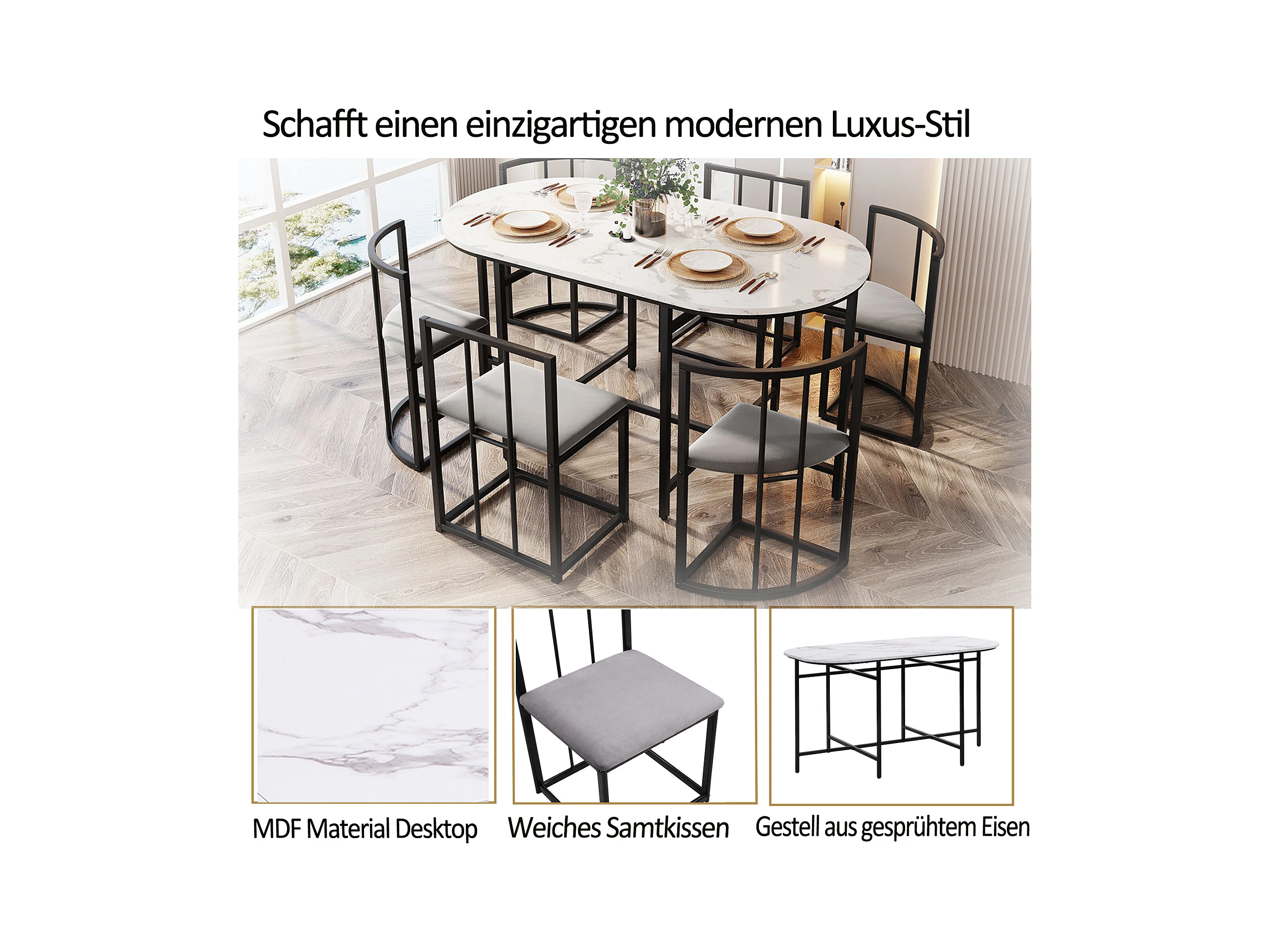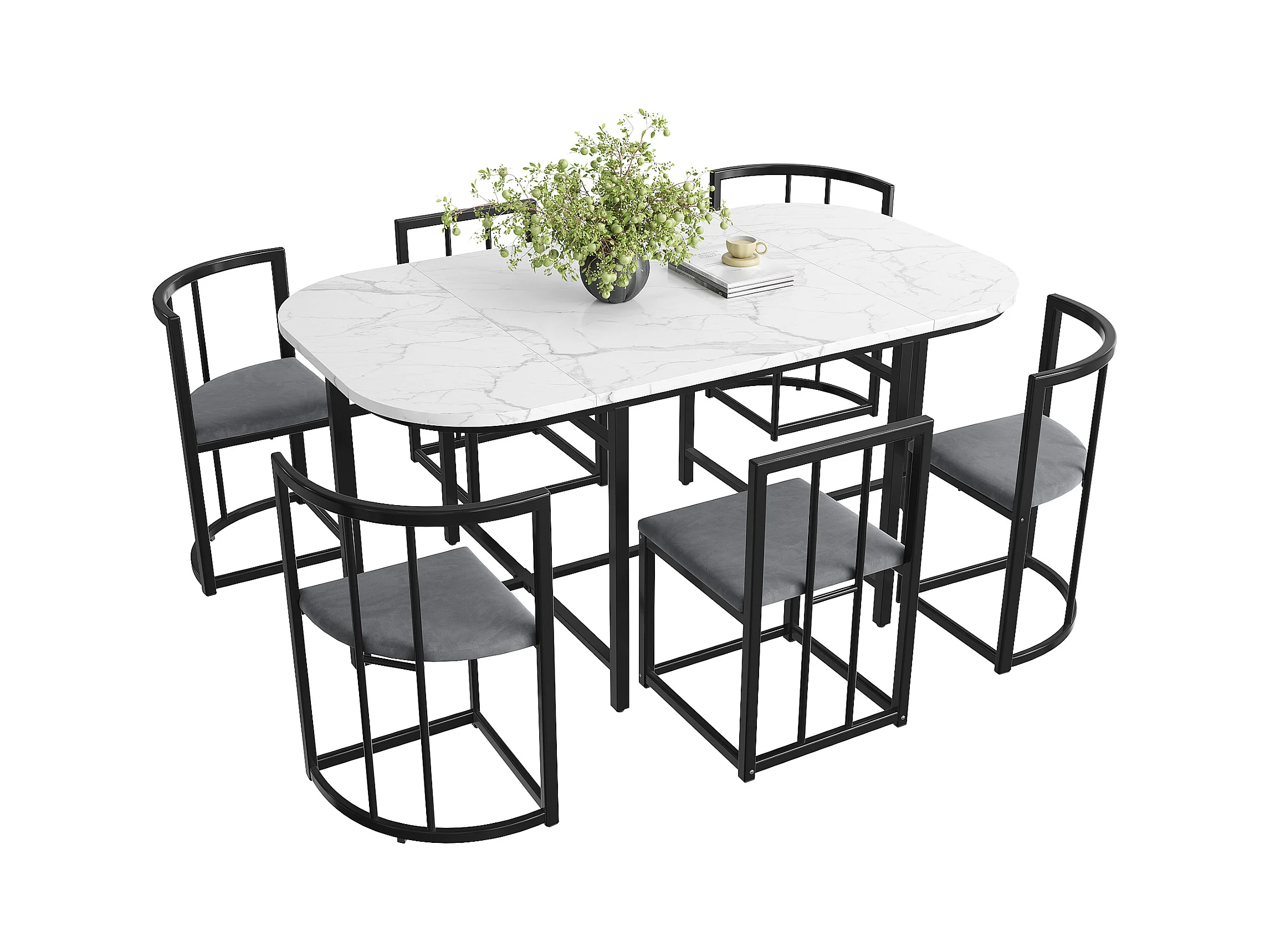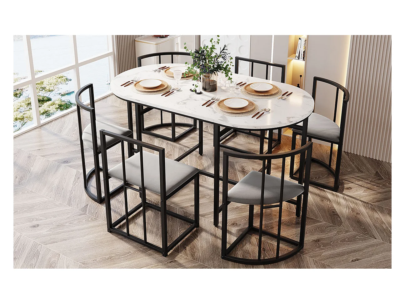 Juego de comedor 6 sillas - Juego de comedor con cojines grises y estructura de hierro negro - mesa blanca - para comedor