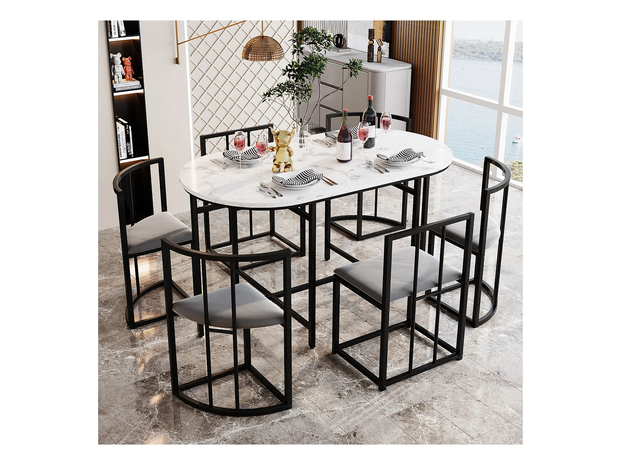 Conjunto de mesa de comedor con 6 sillas, mesa blanca con respaldo y cojín gris, estructura de metal negro, MDF (140 x 80 x 76 cm)