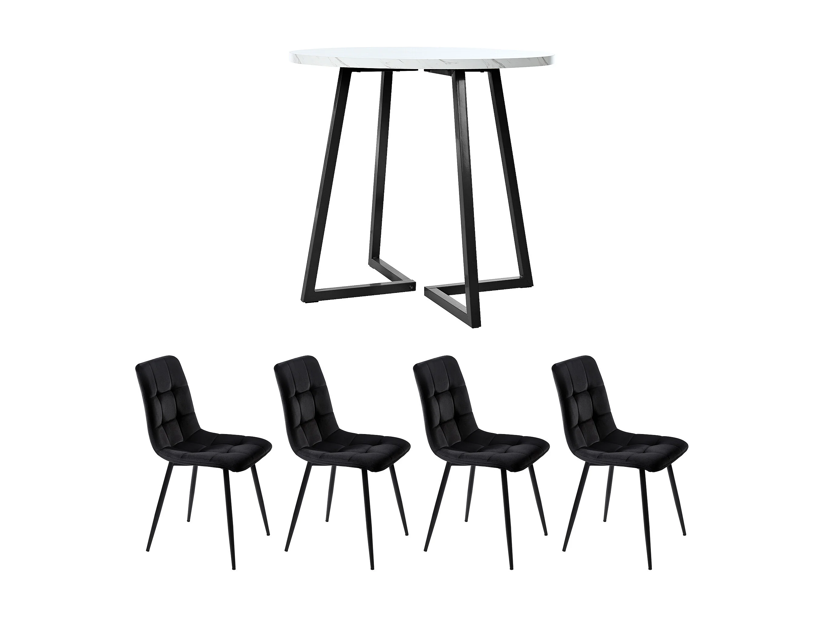 Conjunto de mesa de comedor redonda (80x80x75 cm) + 4 sillas de terciopelo negro - patas de metal negro