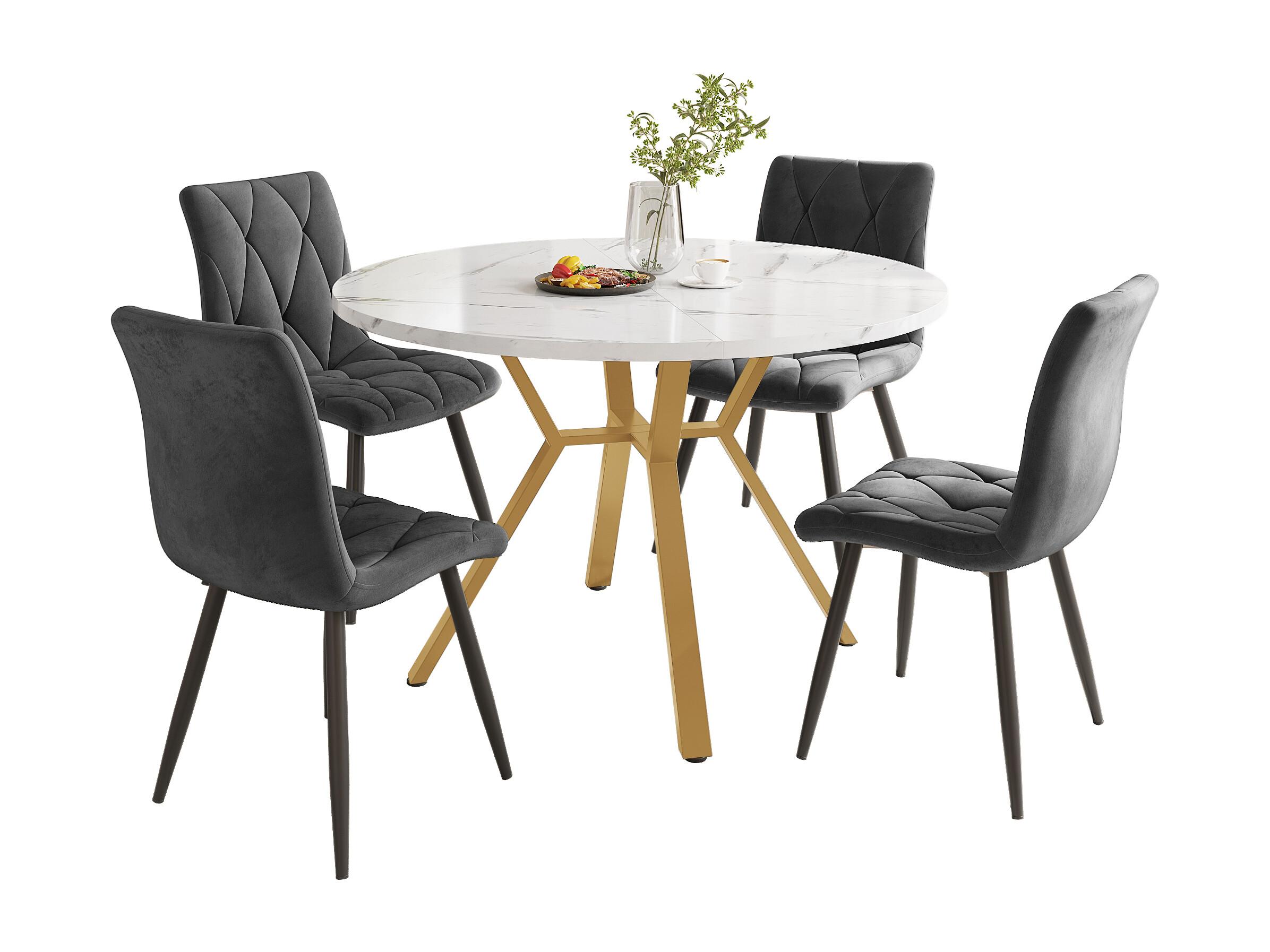 Conjunto de mesa redonda de MDF efecto mármol de 100 cm con 4 sillas de terciopelo gris y patas de metal dorado