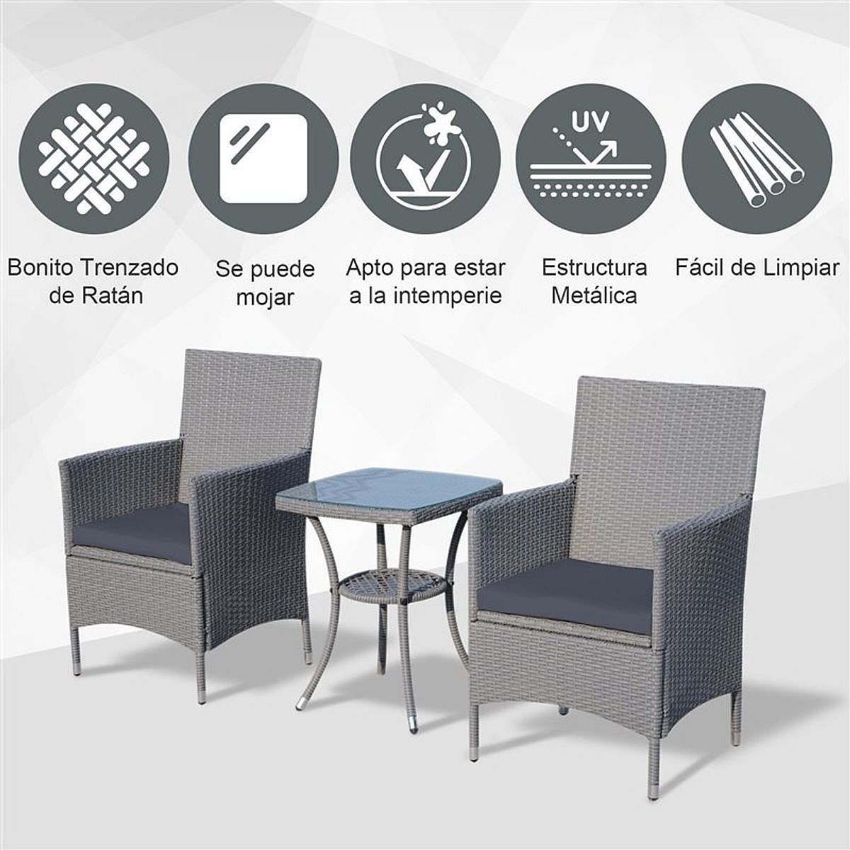 Set comedor de jardín 3 piezas cojines ratán sintético gris claro