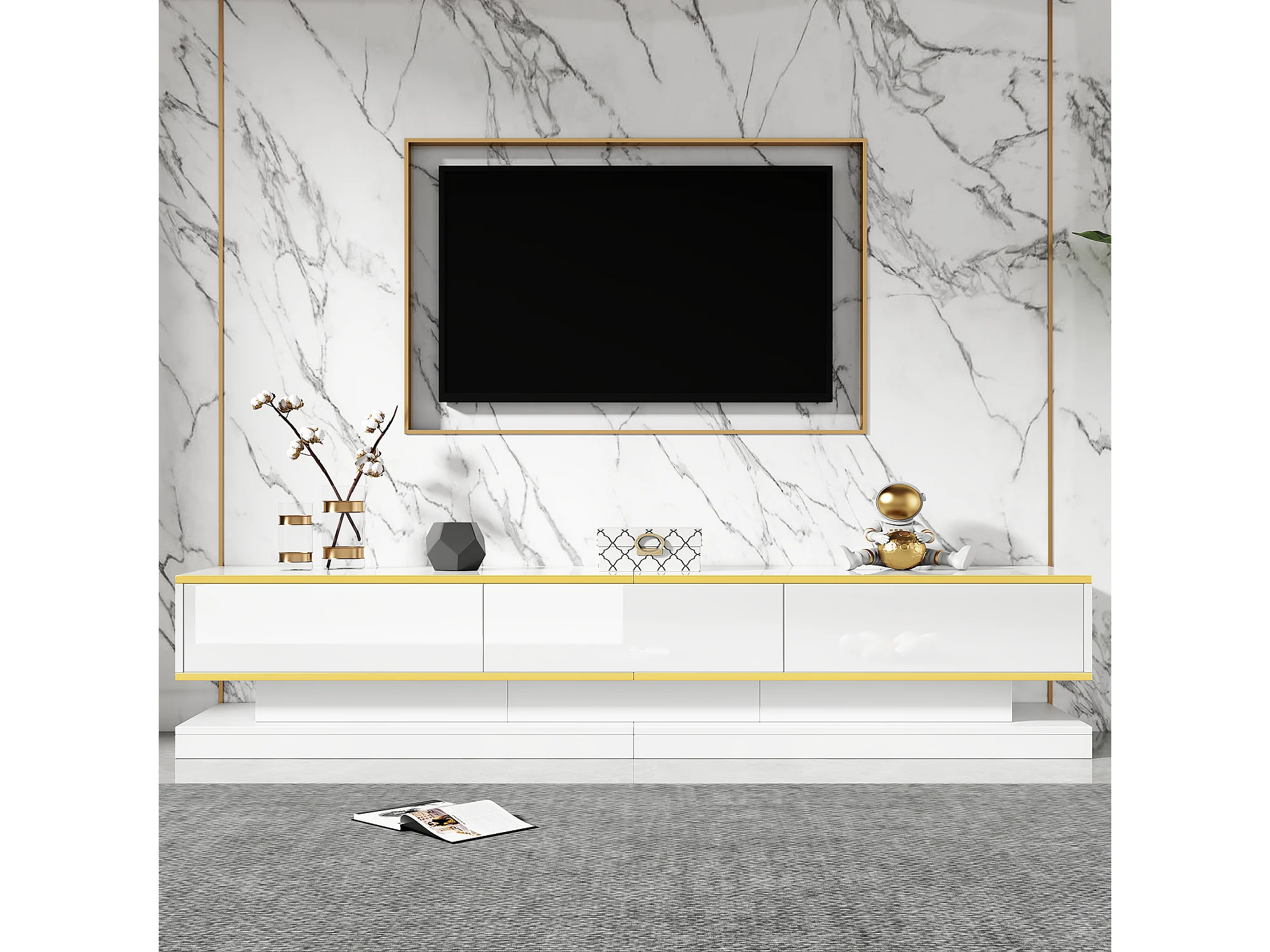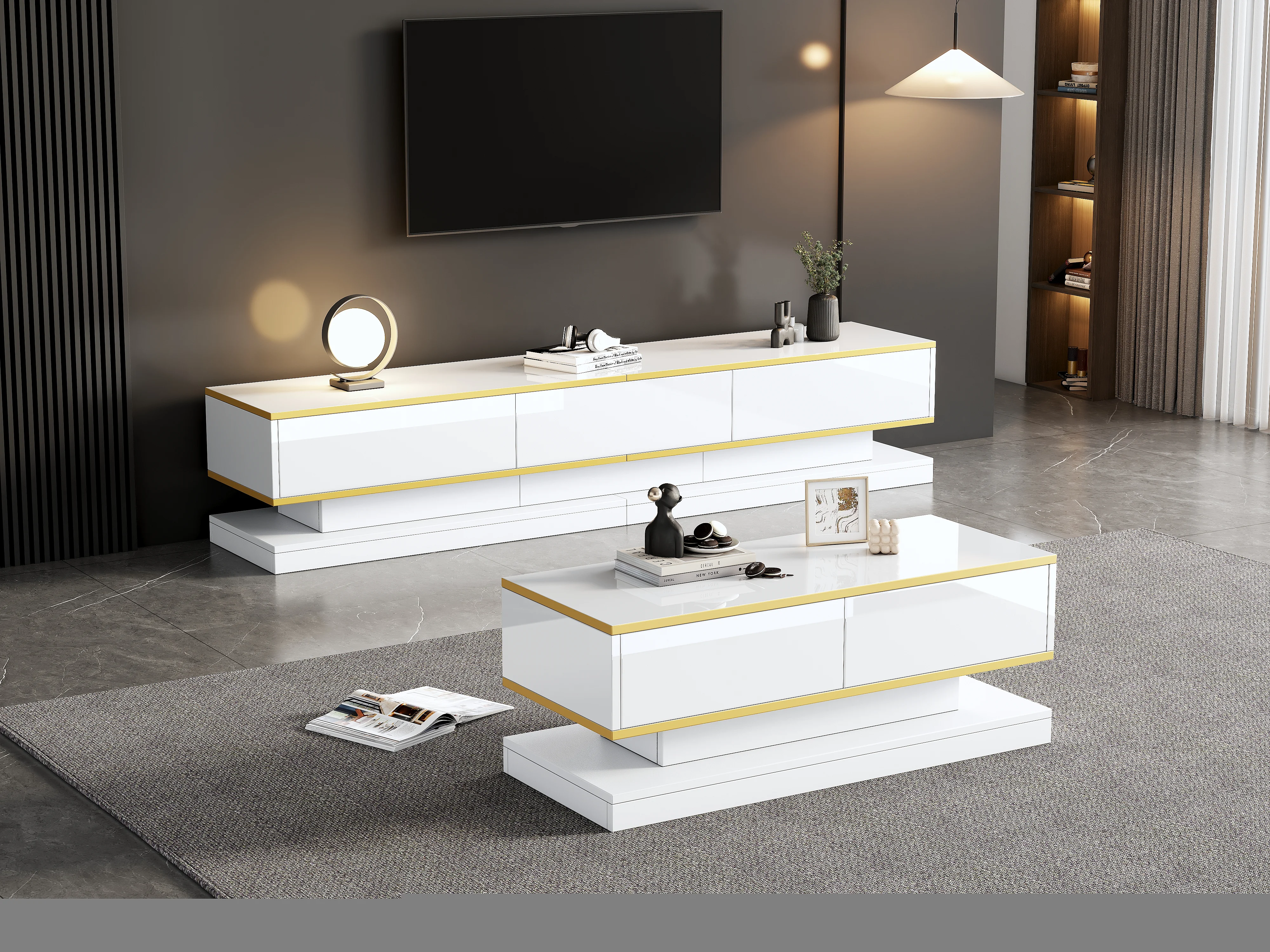 Conjunto de mueble de TV + mesa de centro - brillante - Mueble de TV con 3 cajones + mesa con 2 cajones - aglomerado - blanco