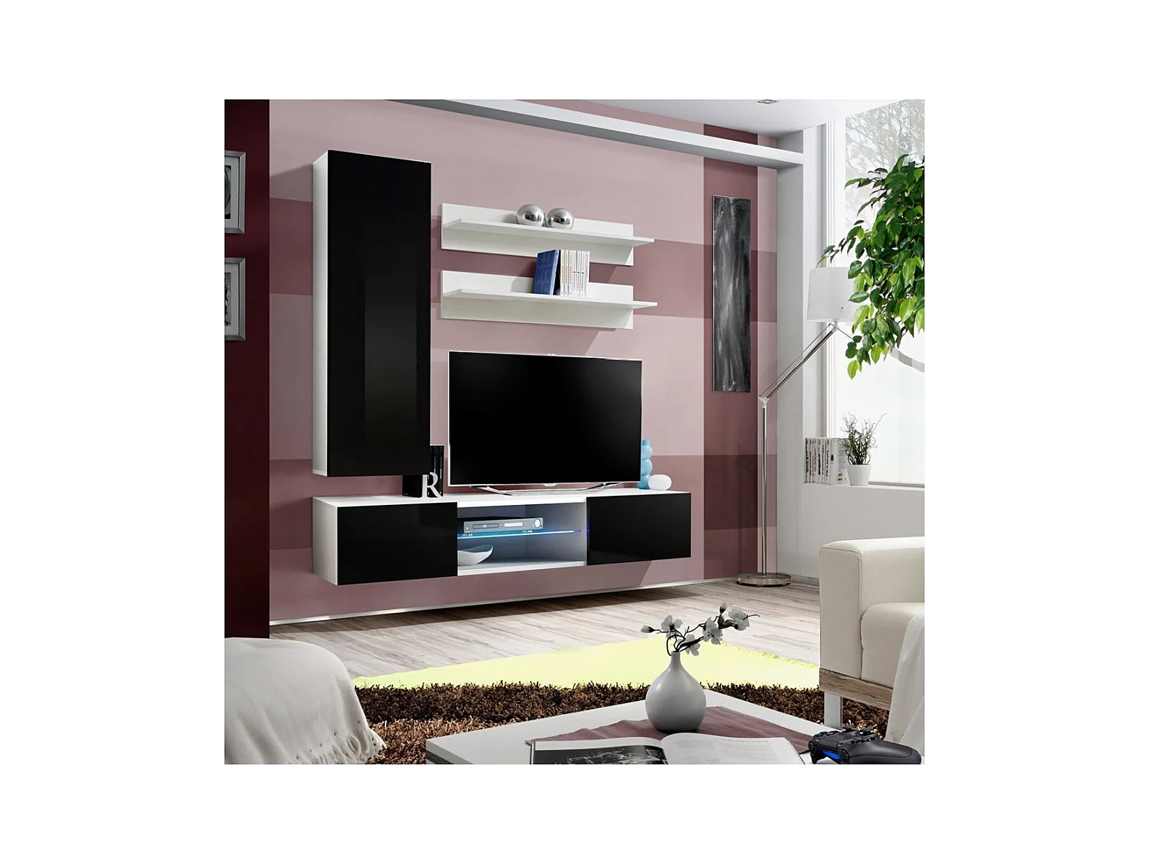 Conjunto Mueble TV FLY S1 – Blanco y Negro – LED integrado – Mueble colgante diseño