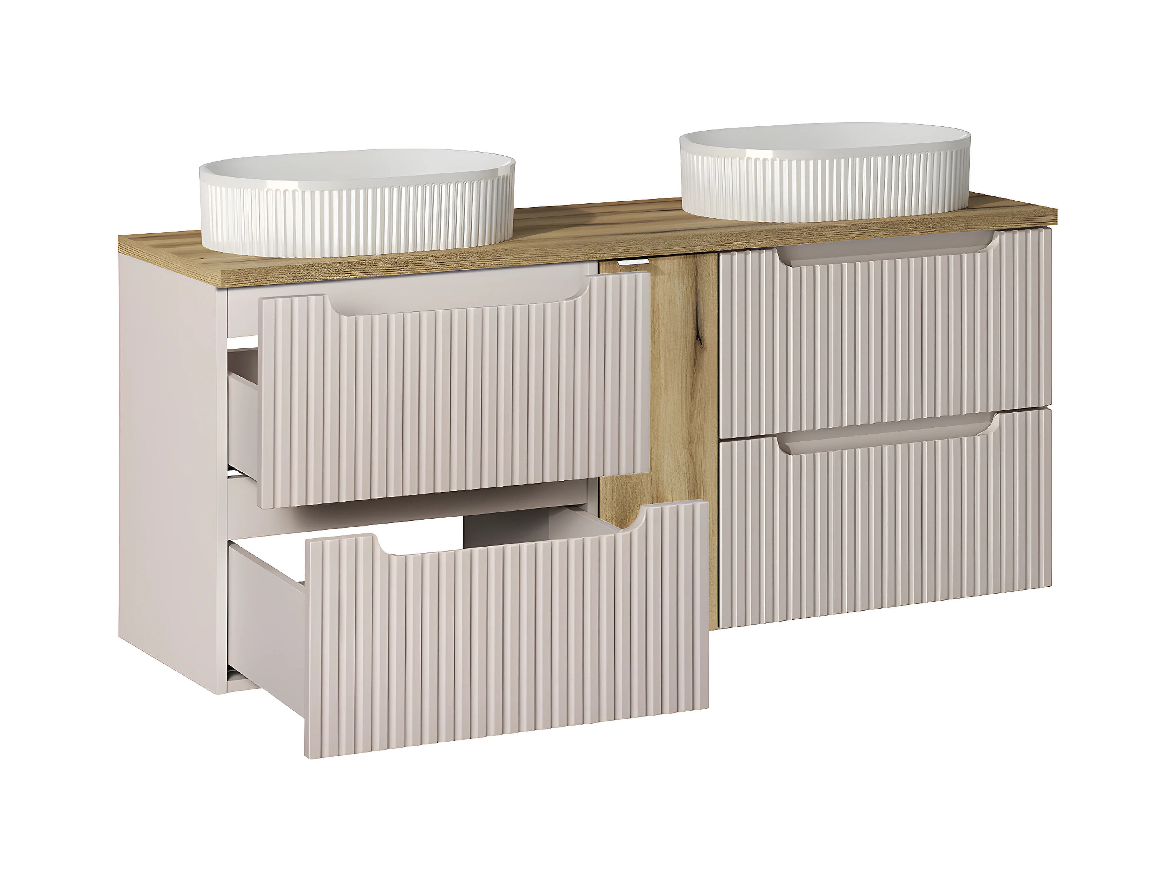 Conjunto de muebles con doble lavabo 140cm 4 cajones y columna Riva Cachemira y Blanco