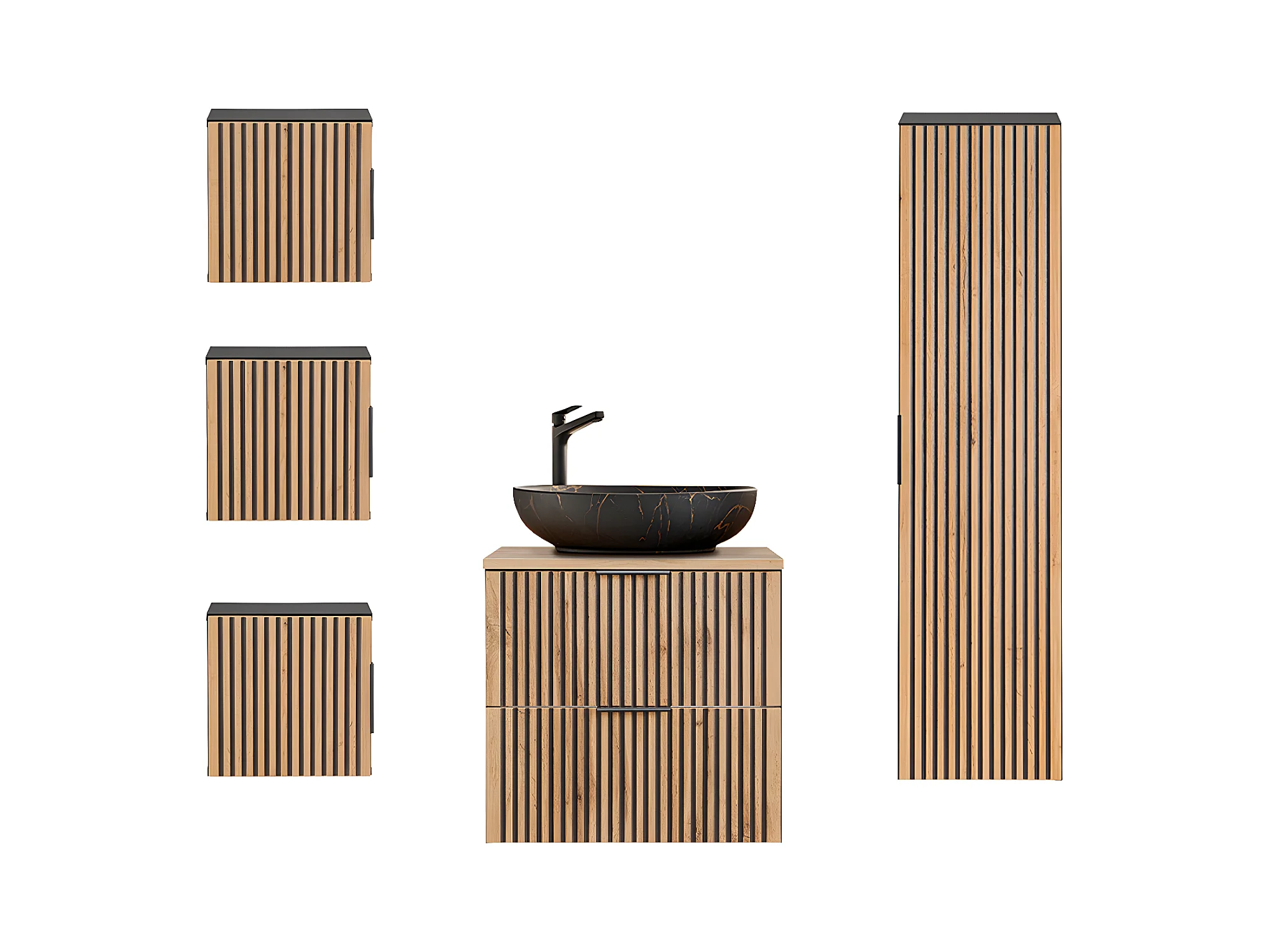 Conjunto de muebles con lavabo individual 60cm columna y 3 armarios de pared Gaia Madera y Negro - Lavabo Negro